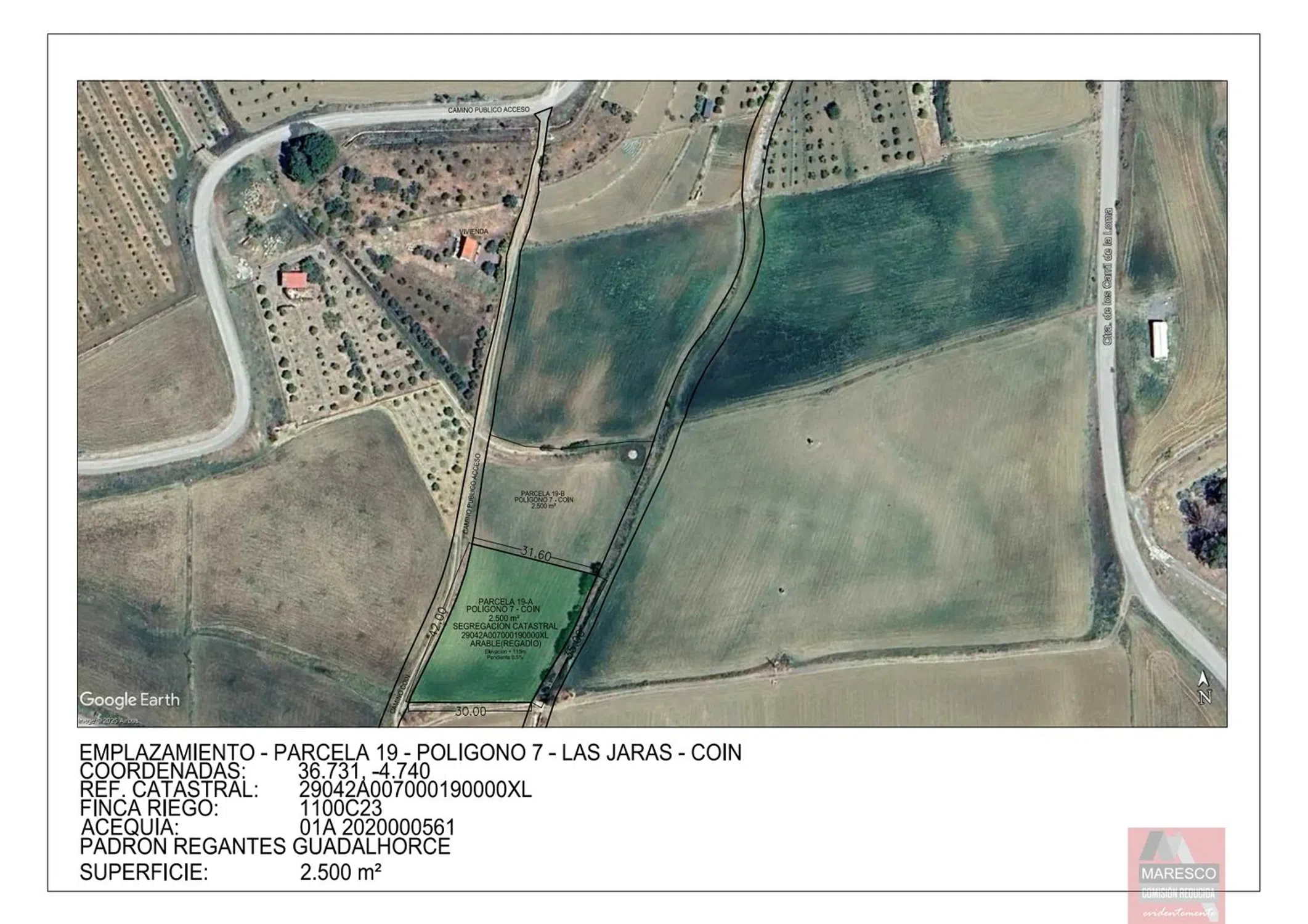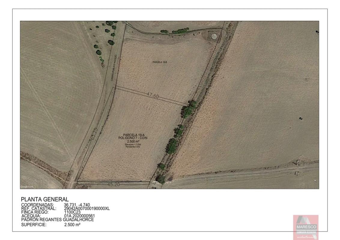Terreno en Coin, con 2500 m², 2500 m² metros de parcela, no urbanizable.!GRAN OPORTUNIDAD PARCELA DE REGADIO DE 2500 METROS! Finca de Regadío en término municipal de Coín. Terreno totalmente llano con acceso desde camino público. La Parcela cuenta con fantásticas vistas abiertas al Valle del Guadalhorce y la Sierra de las Nieves. Su ubicación estrategia, facilita el acceso a los servicios disponibles en la zona: supermercados, colegios, estación de tren, aeropuerto, autopista, hospital comarcal, playas y principales pueblos del Valle del Guadalhorce, todos ubicados entre 10 y 30 minutos. La Parcela, catastralmente independiente, presenta una forma cuadrada y una superficie de 2.500 m² segregados desde una parcela matriz de 5.000 m², dispone de agua para riego por acequia, contando con certificado de inclusión en el padrón de Riegos del Guadalhorce. La finca puede ser entregada con suministro eléctrico, disponible justo en el acceso a la parcela, y depósitos para almacenar agua de servicio. Al ser una parcela clasificada catastralmente como Regadío, y encontrarse en el término municipal de Coín, se puede construir un almacén de aperos para uso agrícola de 62 m² y hasta 7 m de altura. Se puede entregar la parcela con la construcción ya realizada, consúltenos, estaremos encantado de poder atenderle. Se trata de una inversión inmejorable para disponer de un espacio natural y tranquilo donde desarrollar actividades de recreo y agrícolas, una oportunidad para vivir el campo. Puede contactar para más información o para concertar una visita. No dude en visitar nuestra página web, donde podrá ver la totalidad de nuestras propiedades. En cumplimiento del Decreto 218/ 2005, de 11 de octubre, por el que se aprueba el Reglamento de Información al Consumidor en la compraventa y arrendamiento de viviendas en Andalucía, se informa al cliente que los gastos notariales, registrales e impuestos que le sean de aplicación (ITP o IVA + AJD) y otros gastos inherentes a la compraventa no están incluidos en el precio. Validez de precios sujeto a disponibilidades y confirmación por propietarios. Se considera que la descripción y los precios indicados para las propiedades a la venta en este sitio web son correctos. No obstante, la información que contiene esta web puede ser sujeta a errores u omisiones. Las propiedades pueden ser sujetas a cambio de precio, venta o retirada del mercado. Para esta propiedad se encuentran incluidos en el precio de venta nuestros honorarios profesionales de agencia, por lo que no abonará ningún gasto extra por gestión o asesoramiento inmobiliario.