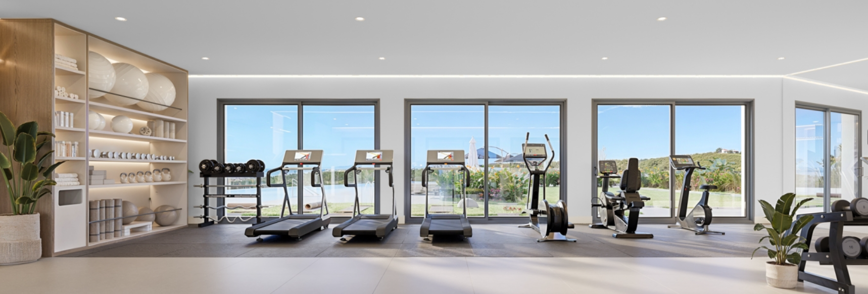 - Gimnasio y sala comunitaria con vistas al solárium y piscina.