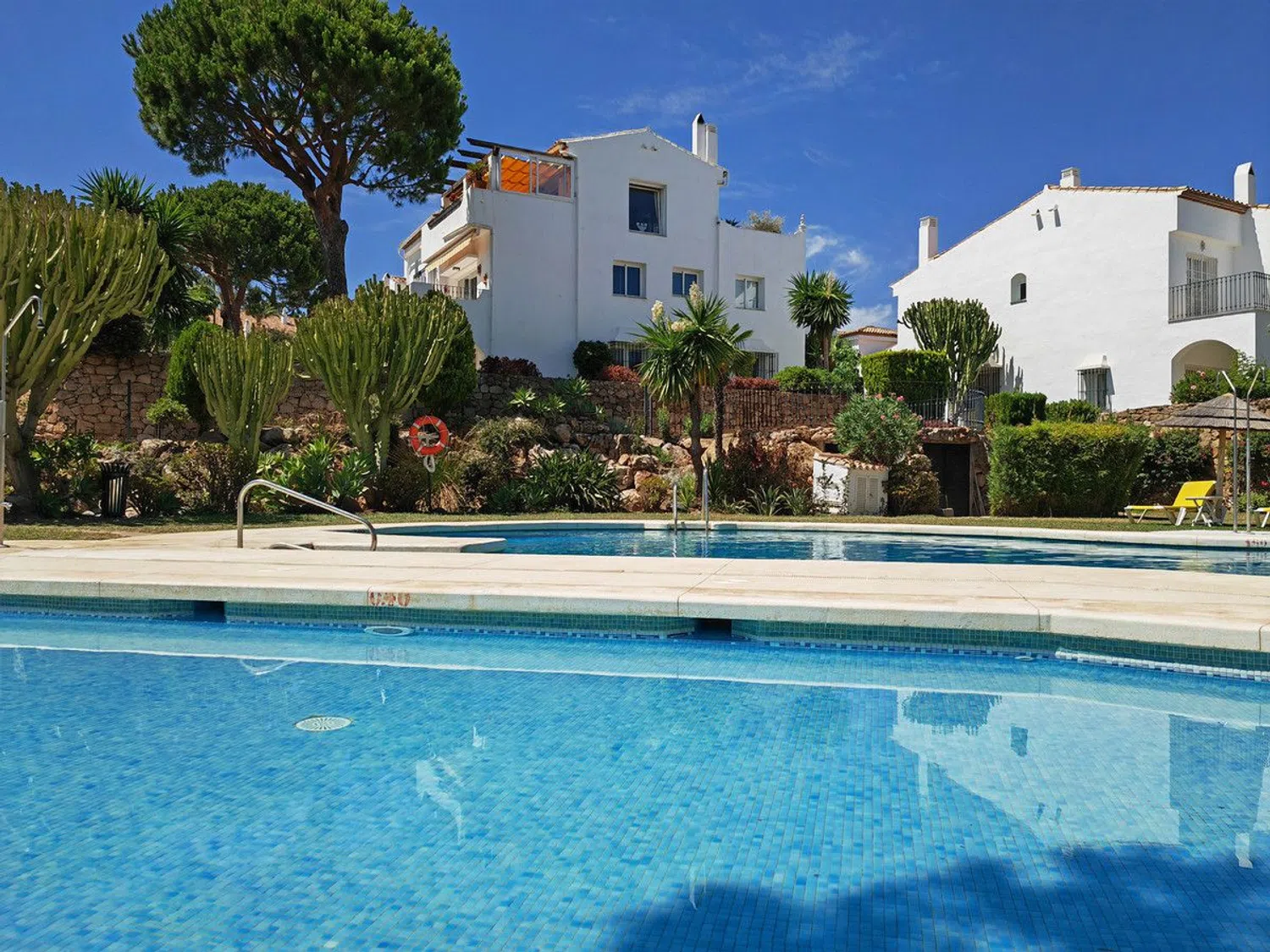¡ Descubre tu nuevo hogar en El Paraiso, Estepona! Este encantador apartamento de 108 m² construidos y 95 m² interiores te ofrece todo lo que necesitas para vivir cómodamente. Con 2 dormitorios amplios y 2 baños (uno en suite) y una orientación sur que garantiza luz natural durante todo el día, este piso es perfecto para ti. Disfruta de la piscina comunitaria, el garaje privado y una terraza privada de 15 m² con vistas panorámicas al mar y al jardín. El apartamento está completamente amueblado y cuenta con una cocina totalmente equipada, aire acondicionado, chimenea y suelos de mármol que añaden un toque de elegancia. Además, dispone de TV por satélite, internet Wi-Fi, persianas de seguridad y cristal doble para tu comodidad y seguridad. La sala de invitados y el comedor son ideales para recibir a tus seres queridos. Ubicado en una primera planta con ascensor, este inmueble construido en 2002 está en buen estado y listo para entrar a vivir. La calefacción es eléctrica con bomba de frío/calor, y los armarios empotrados ofrecen un espacio de almacenamiento óptimo. La terraza cubierta es perfecta para disfrutar de las vistas al jardín y al mar. La ubicación es inmejorable: cerca de la playa, club de tenis, golf, tiendas, colegios y transporte público. Además, los animales están permitidos, por lo que tu mascota también será bienvenida. No pierdas la oportunidad de vivir en este maravilloso apartamento en El Paraiso. ¡Contáctanos para más información y ven a visitarlo!