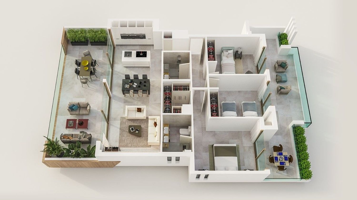 Surrounded by golf courses, beach clubs, various restaurants, supermarkets, and the nearby zoological park, these residences are ideally located. Each home offers a daytime area comprising a large living room, dining room, and kitchen as an open-plan space, designed with extensive windows that lead to a sizable west-facing terrace. Apartments come with either two or three bedrooms, each featuring two bathrooms, and some homes include a walk-in closet adjacent to the master bedroom. Every bedroom has large windows providing access to an east-facing terrace, ensuring sunlit exterior spaces throughout the day. Ground-floor units boast a private garden, while penthouses offer a private rooftop terrace accessible via an interior staircase. Additionally, each unit includes an outdoor laundry-drying area on the terrace, discreetly enclosed by shutters.