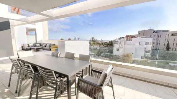 Experimente el lujo costero en este impresionante ático de 3 dormitorios y 2 baños, perfectamente situado a pocos pasos de la playa y de los servicios locales. Esta moderna residencia ofrece vistas panorámicas al mar y una amplia terraza, así como un amplio solárium con jacuzzi privado, cocina al aire libre, bar y comedor, perfecto para relajarse y entretenerse. Diseñado para quienes buscan lo mejor en vida de lujo, este ático combina elegancia y confort en una ubicación costera inmejorable. ¡No pierdas la oportunidad de ser propietario de este paraíso privilegiado!