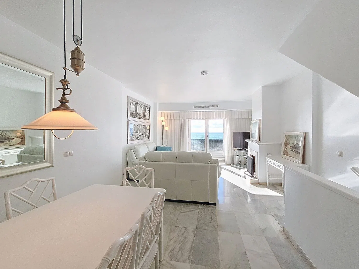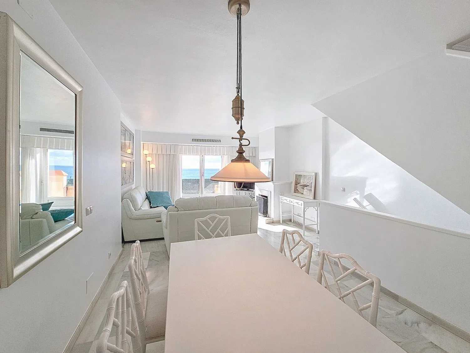 Esta casa adosada se encuentra en una ubicación privilegiada en el mismo Puerto de Estepona, en primera línea de playa y ofrece vistas impresionantes al mar y a la marina, lo que la convierte en una opción ideal para quienes buscan un hogar cerca del mar. Su ubiación cerca de todos los servicios necesarios, como tiendas, restaurantes, colegios y transporte público, además su excelente estado de conservación, garantizan una experiencia de vida cómoda y sin preocupaciones. Al entrar en la planta principal, se encuentra un espacioso salón-comedor con chimenea, que se abre a una terraza privada con vistas al mar, perfecta para disfrutar de momentos de relajación al aire libre. La cocina está completamente equipada y cuenta con una ventana de comunicación con el comedor y el salon. En la planta inferior, accesible por una escalera, hay dos dormitorios, uno de ellos con baño en-suite y el otro con baño separado. En la planta superior encontrará otros dos dormitorios con 1 baño compartido. Uno de estos dormitorios es doble y cuenta con un observatorio o terraza cerrada con vistas directas a la playa, proporcionando un espacio privado y tranquilo. El solarium enamora con cu amplia terraza y las magnificas vistas abiertas y directas al mar y al puerto. La propiedad incluye adicionalmente un apartamento separado de tipo estudio, con su propia cocina, salón-comedor y baño, ideal para invitados o como espacio adicional apto para alquiler dado su acceso independiente. Equipada con aire acondicionado, alarma y suelos de marmol, esta casa es única y especial no solo por su tamaño y ubicación pero tambien por todos las características adicionales que ofrece. La urbanización ofrece una piscina comunitaria, jardines maduros y un garaje comunitario. Además, la casa tiene participación de co-propiedad en la casa club comunitaria que ofrece varias estancias para diversos eventos o simplemente para el disfrute diario, lo que añade un valor significativo a la propiedad. La comunidad cerrada con entrada de seguridad garantiza un entorno seguro y tranquilo para todos los residentes.