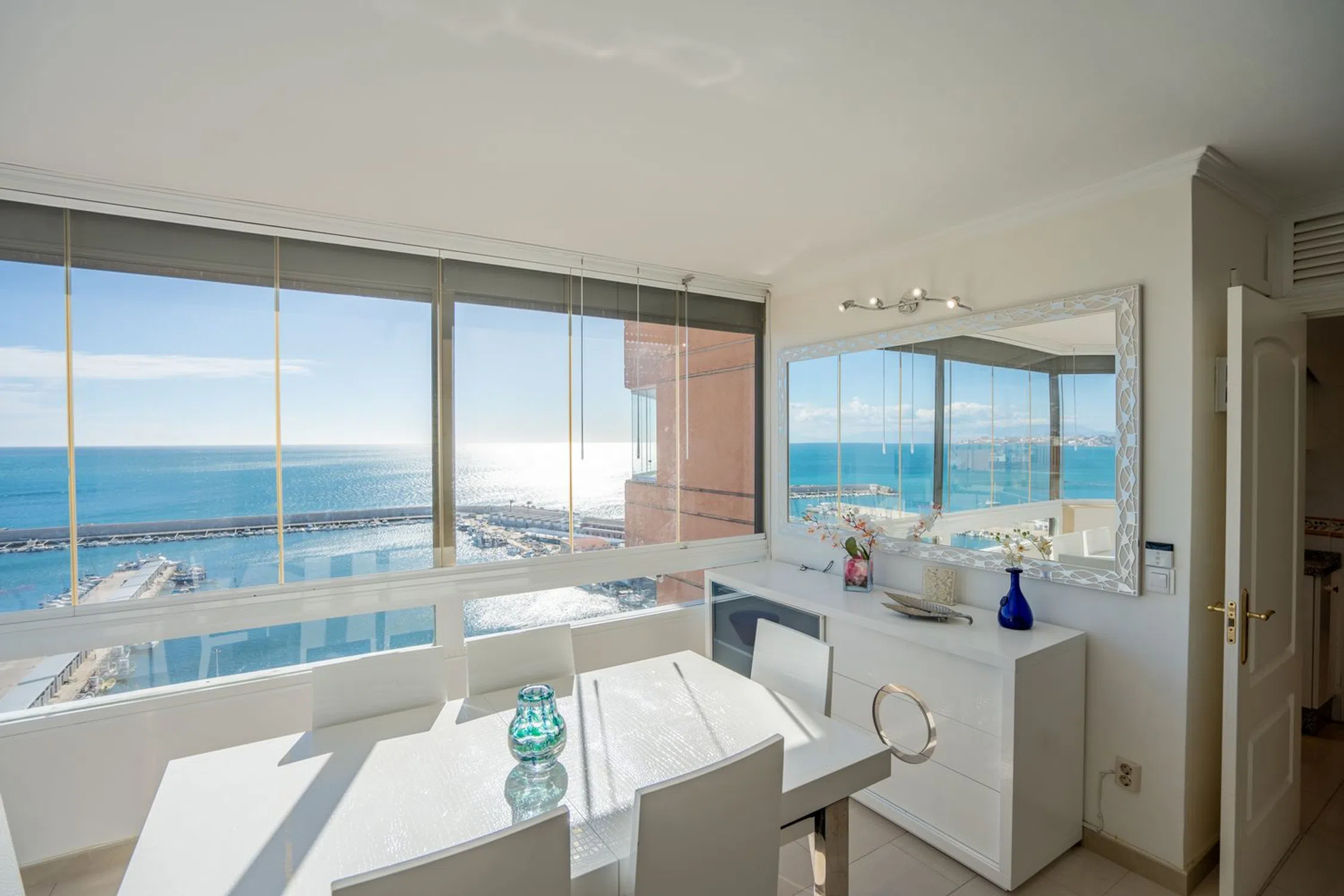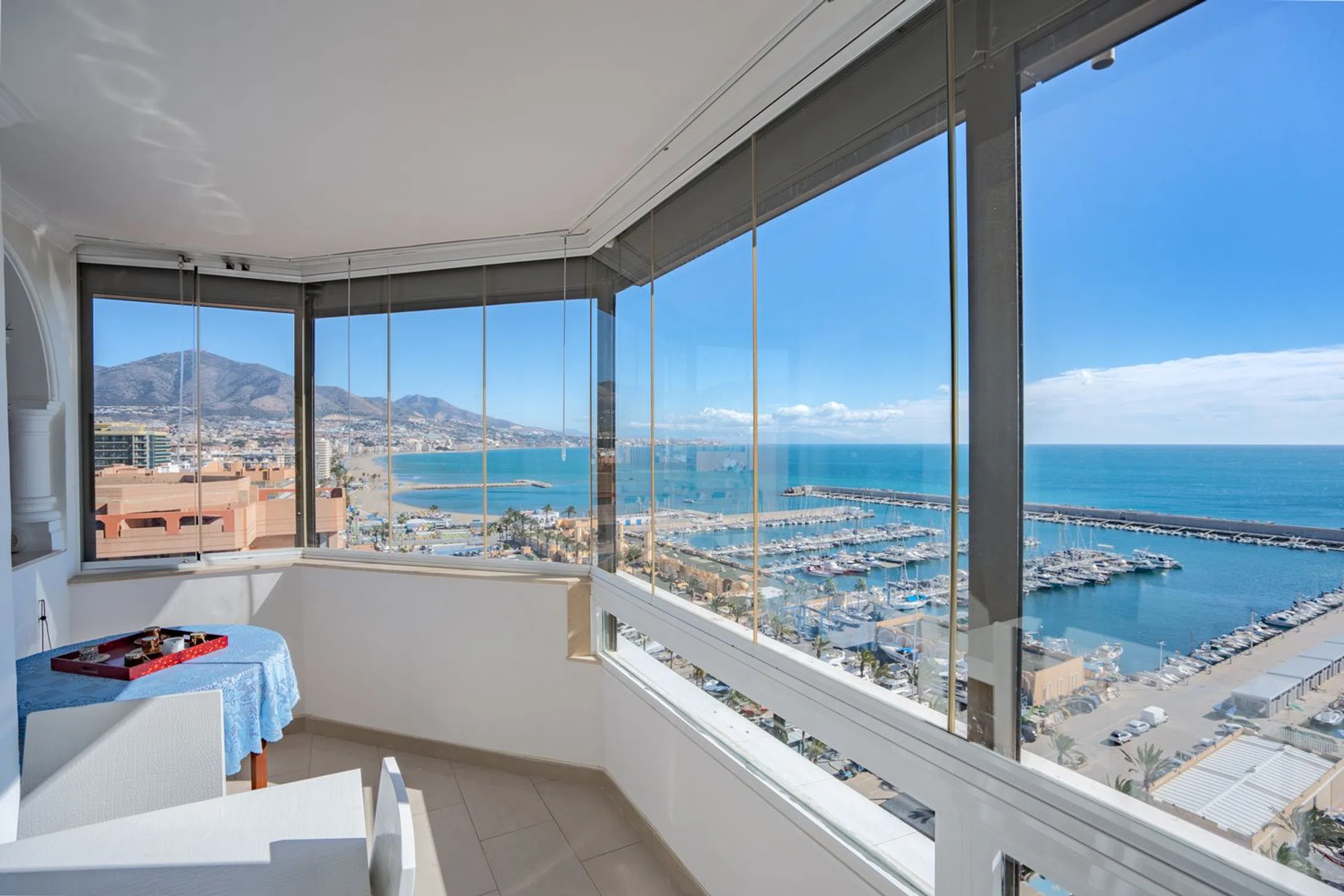 ¡Vive en primera línea de playa en Fuengirola! Ofrecemos amplio apartamento con vistas espectaculares al puerto deportivo, ciudad, montañas y playas. Con una superficie de 81 m², este espacioso piso que se sitúa en la planta 12 del edificio Airosa es muy luminoso, y disfruta de vistas frontales al mar y al paseo marítimo. El piso está rodeado por amplios ventanales que aportan una luminosidad y brillo excepcionales al interior del hogar. Está distribuido en dos dormitorios (unos en suite) y dos baños, la cocina de estilo americano bien equipada, salón comedor y hall de entrada con armarios empotrados. La vivienda cuenta con sistema de aire acondicionado por splits. Se vende sin amueblar, aunque la posibilidad de negociar la inclusión de los muebles de alta calidad está abierta. Gracias a la orientación Sur de la vivienda, esta recibe sol durante todo el día. ¡UN HOGAR IDEAL EN LA PRIMERA LÍNEA DE PLAYA DE FUENGIROLA, LISTA PARA DISFRUTAR DURANTE TODO EL AÑO O COMO INVERSIÓN!