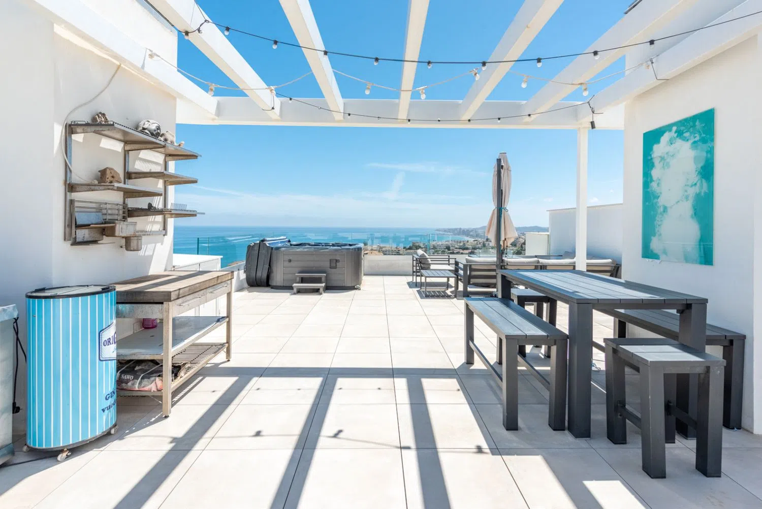 ¡Descubre este penthouse, donde el lujo se encuentra con la comodidad! Este ático cuenta con impresionantes vistas al mar y a la montaña, así como grandes terrazas, perfectas para disfrutar del sol o de una cena al atardecer. En el interior, encontrarás una vivienda moderna, de concepto abierto con cocina completamente equipada e incorporada al salón-comedor, tres dormitorios y dos baños. Asegurando confort durante todo el año, está equipada con aire acondicionado y calefacción por suelo radiante, Sal a la fabulosa terraza donde también se encuentra una escalera que te lleva a la terraza en la azotea, diseñada para la relajación y el entretenimiento. Relájate en el jacuzzi o prepara una deliciosa comida en la cocina al aire libre mientras disfrutas de la fresca brisa marina. Ubicado en una comunidad cerrada y segura, tendrás acceso a fantásticas comodidades, incluyendo un gimnasio, spa y dos piscinas al aire libre para esos calurosos días de verano. También cuenta con un garaje con espacio para dos coches y un trastero para tu conveniencia. Con la playa y las comodidades locales a solo un paso, y una estación de tren cercana para facilitar el transporte, este penthouse es la combinación perfecta de lujo y practicidad. ¡No te pierdas esta increíble oportunidad de vivir en el paraíso!
