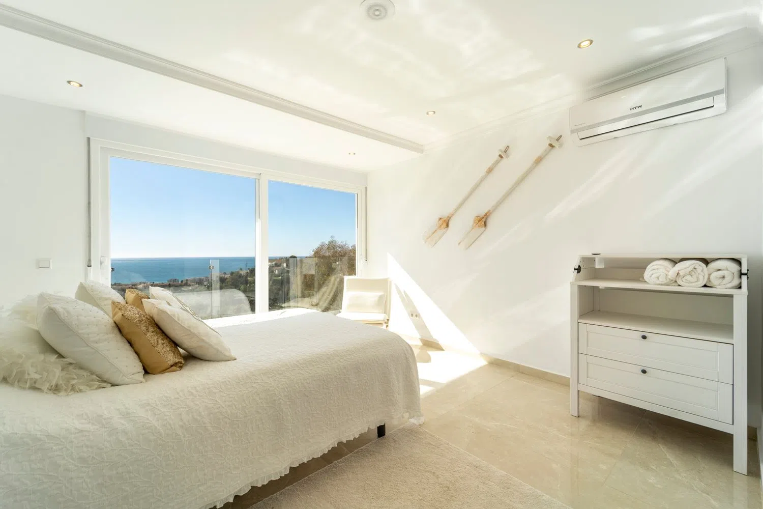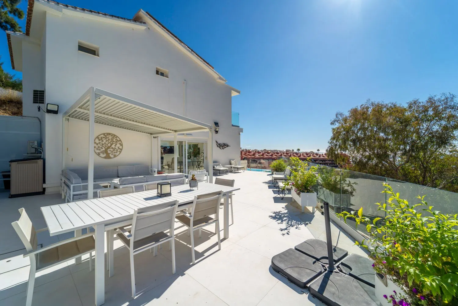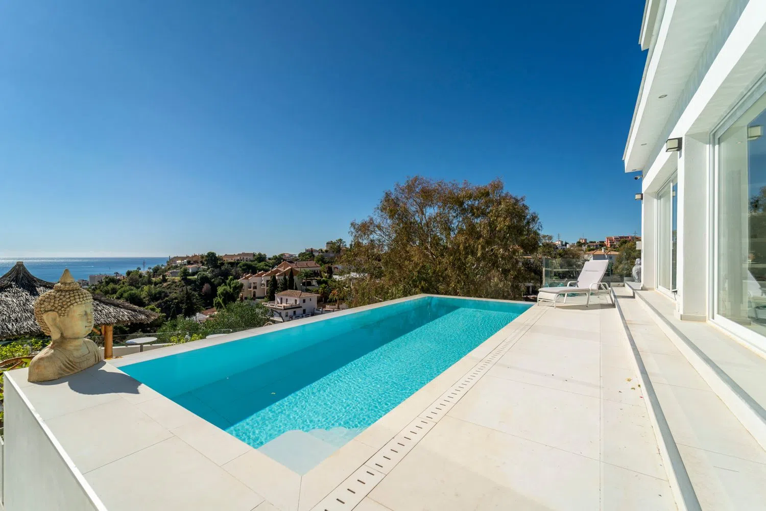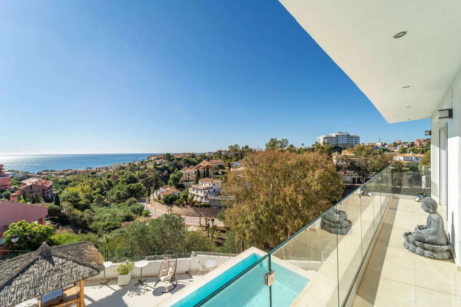 Esta villa en Torreblanca parece un sueño hecho realidad para cualquiera que busque lujo, comodidad y unas vistas impresionantes. He aquí un desglose de sus impresionantes características: Ubicación y Accesibilidad - Ubicación privilegiada: * Enclavada en Torreblanca, a sólo 3 minutos en coche de las impresionantes playas de Fuengirola, ofrece fácil acceso tanto a las comodidades urbanas como a la belleza costera. - Servicios Cercanos: * Situado en una urbanización equipada con todos los servicios esenciales y enlaces de transporte, haciendo la vida diaria tanto lujosa como conveniente. Diseño y Estética - Ambiente inspirado en Bali: * Una fusión única de minimalismo escandinavo con encanto balinés, aportando un ambiente tranquilo y exótico a cada rincón de la casa. - Piscina infinita y vistas panorámicas al mar: La piscina infinita da al mar, creando un espacio excepcional para la relajación y el disfrute. - Amplias zonas de terraza: * Múltiples terrazas para relajarse, comer y admirar las puestas de sol, con elementos chic como palapas y camas balinesas. Disposición interior - Disposición de la planta principal - Sala de estar de concepto abierto: Grandes ventanales en el amplio salón ofrecen vistas ininterrumpidas y acceso directo a la terraza. - Cocina moderna: Totalmente equipada y de concepto abierto, perfecta para el entretenimiento y el disfrute diario. - Área de oficina y baño de invitados: Espacios funcionales tanto para el trabajo como para la comodidad de los invitados. - Disposición de la primera planta: - Tres dormitorios en suite: Todos los dormitorios disponen de baño en suite, amplios armarios y acceso a una terraza con impresionantes vistas. Servicios y características - Varias terrazas ofrecen espacios para comer, relajarse y disfrutar del clima mediterráneo. - Potencial gimnasio y sauna: Amplio espacio para añadir zonas de bienestar personalizadas como un gimnasio y una sauna. - Toques de lujo - Mobiliario de alta calidad, aire acondicionado y sistema de sonido integrado. - Calefacción por suelo radiante en todas las habitaciones y paneles solares para una mayor eficiencia energética. - Sistema de descalcificación de agua, amplio trastero y garaje privado. Resumen Esta villa combina lujo, funcionalidad y elegancia, convirtiéndola en un paraíso único, llave en mano, ideal para relajarse, entretenerse y abrazar un estilo de vida sereno cerca de la costa de Fuengirola.