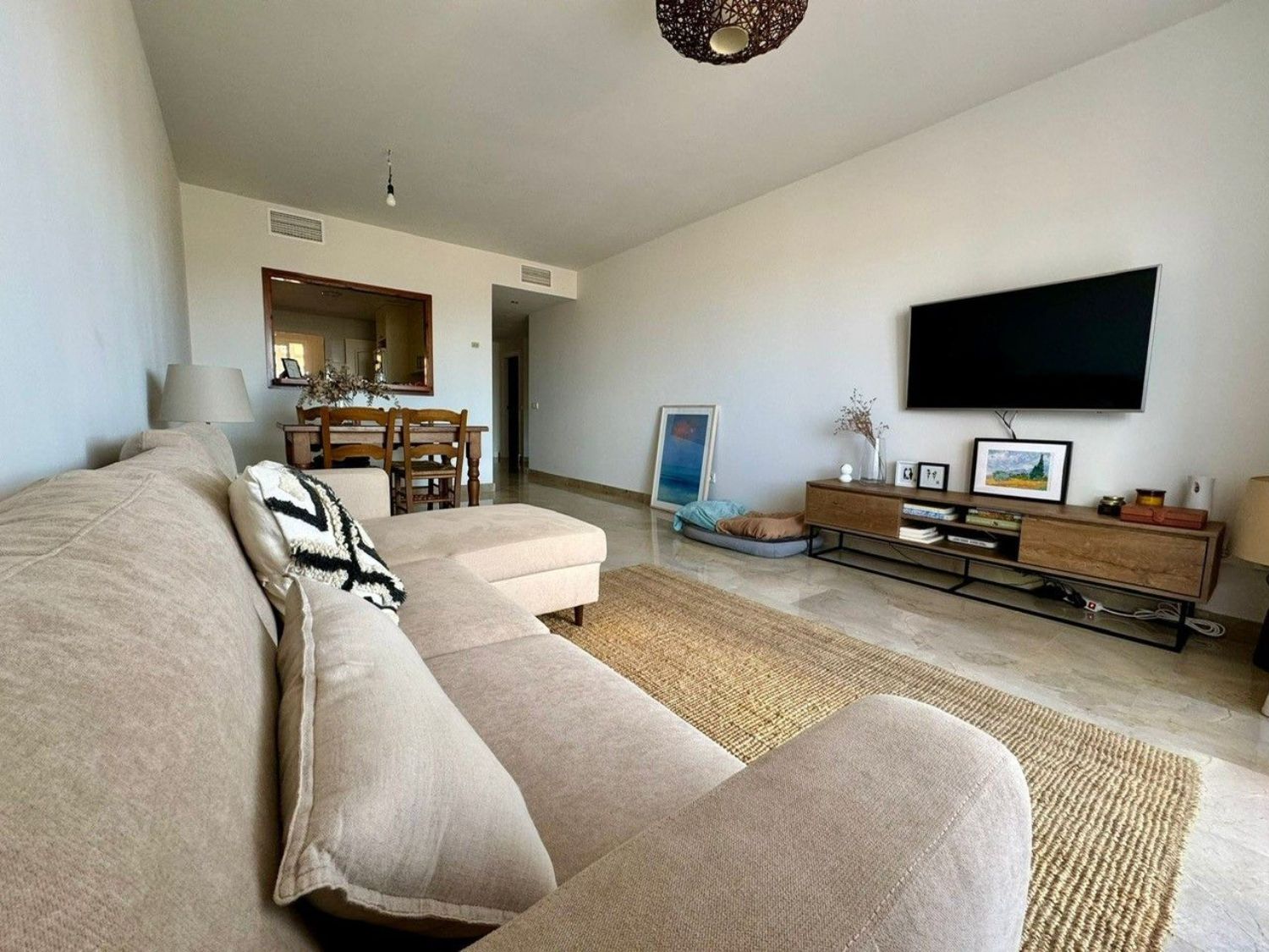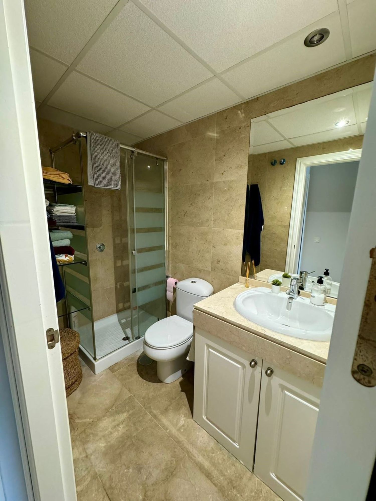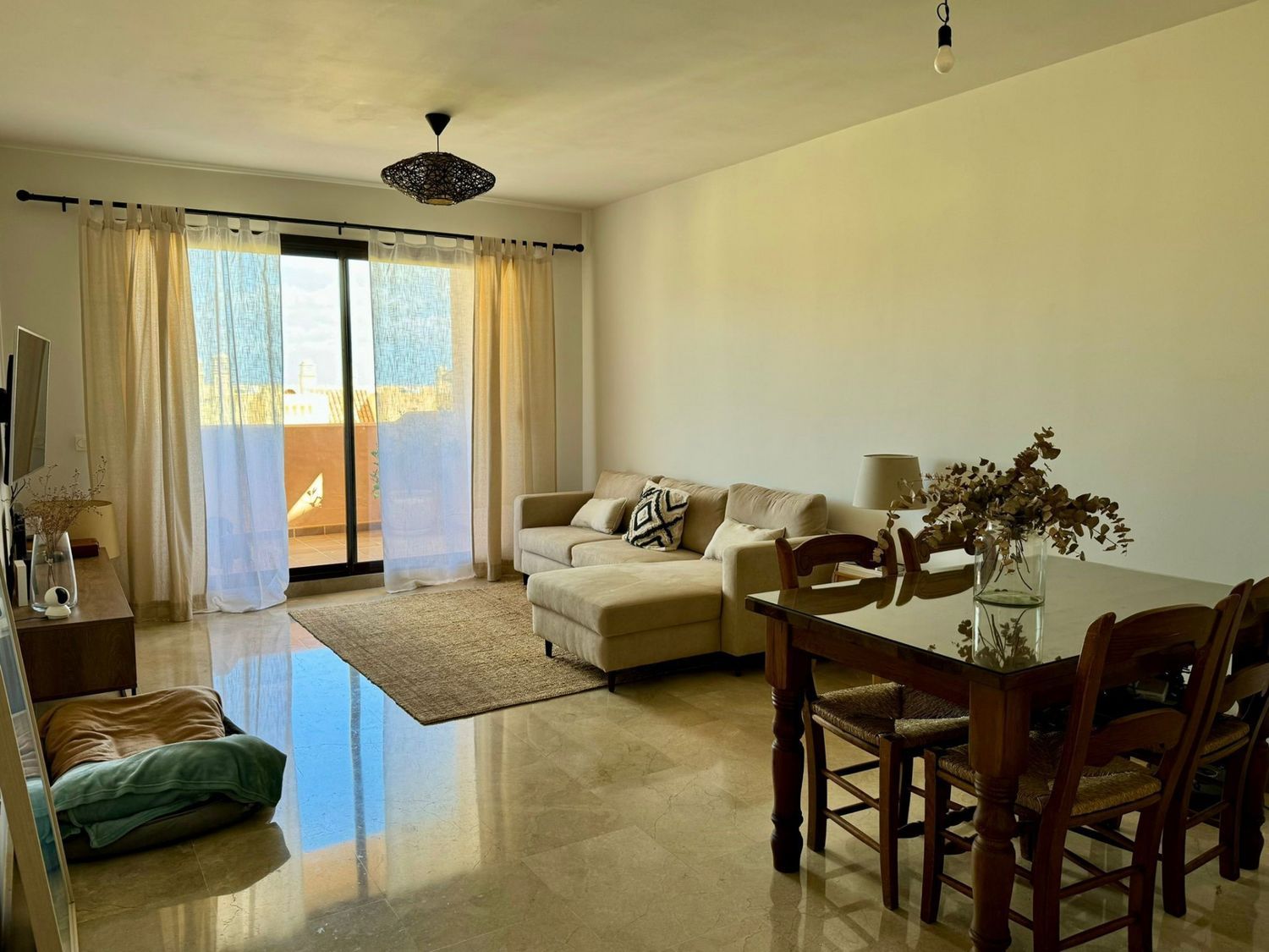 Este apartamento de 2 dormitorios y 2 cuartos de baño, uno con ducha y otro en suite con baño Turko, está situado en una urbanización a pocos minutos en coche del puerto de la Duquesa, con 5 piscinas rodeadas de bonitos jardines y 1 pista de padel, al lado de la parte alta del Golf de la Duquesa, tiene muy buena distribución y amplitud, desde el hall se puede acceder a todas las habitaciones de la casa, la cocina está abierta con un ventanal al salón y dispone de un lavadero con ventana, permitiendo entrar la luz y el aire a la casa, tanto el salón como el dormitorio principal tienen salida a una terraza de 15 metros, el dormitorio secundario da al oeste y es también muy luminoso por el gran tamaño de la ventana,algo importante a destacar también, es que tanto la plaza de garaje subterránea como el trastero, están al lado de la puerta del ascensor, es el apartamento ideal tanto para vivir todo el año como para vacaciones, por su seguridad, los bajos costes de comunidad e IBI y la bonita zona.