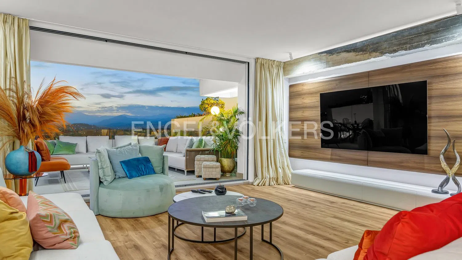 Presentamos un impresionante apartamento de 3 dormitorios situado en las prestigiosas Lomas del Marbella, en el corazón de la Milla de Oro. Recientemente renovado con los más altos estándares, esta exquisita propiedad ofrece una mezcla perfecta de lujo y confort. Cuenta con una amplia zona de estar de 181m2 que se complementa con una generosa terraza de 50m2 orientada al oeste. Desde esta amplia zona exterior, los residentes pueden disfrutar de vistas panorámicas del mar Mediterráneo, Gibraltar, la costa africana y las majestuosas montañas y laderas de Nueva Andalucía. Este apartamento luminoso y brillante ofrece una abundancia de espacio para la relajación y el entretenimiento para que todos disfruten durante todo el año. El dormitorio principal ofrece un acceso adicional al exterior, proporcionando un refugio tranquilo para disfrutar del impresionante paisaje y disfrutar de las puestas de sol durante todo el año. Cada uno de los tres dormitorios incluye su propio cuarto de baño, lo que garantiza la privacidad y la comodidad de residentes e invitados. Además, se añadió un aseo de invitados para mayor comodidad sin comprometer el espacio vital interior. El interior de este apartamento está adornado con acabados de primera calidad y electrodomésticos siemens de gama alta y un enfriador de vino. Los residentes de este exclusivo complejo pueden disfrutar de servicios como un gimnasio, una amplia piscina al aire libre, sauna y seguridad las 24 horas. Bienvenido a una vida de lujo sin igual en uno de los lugares más codiciados de Marbella.