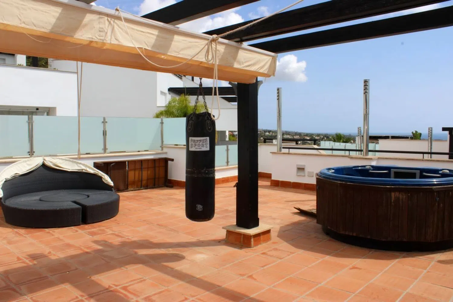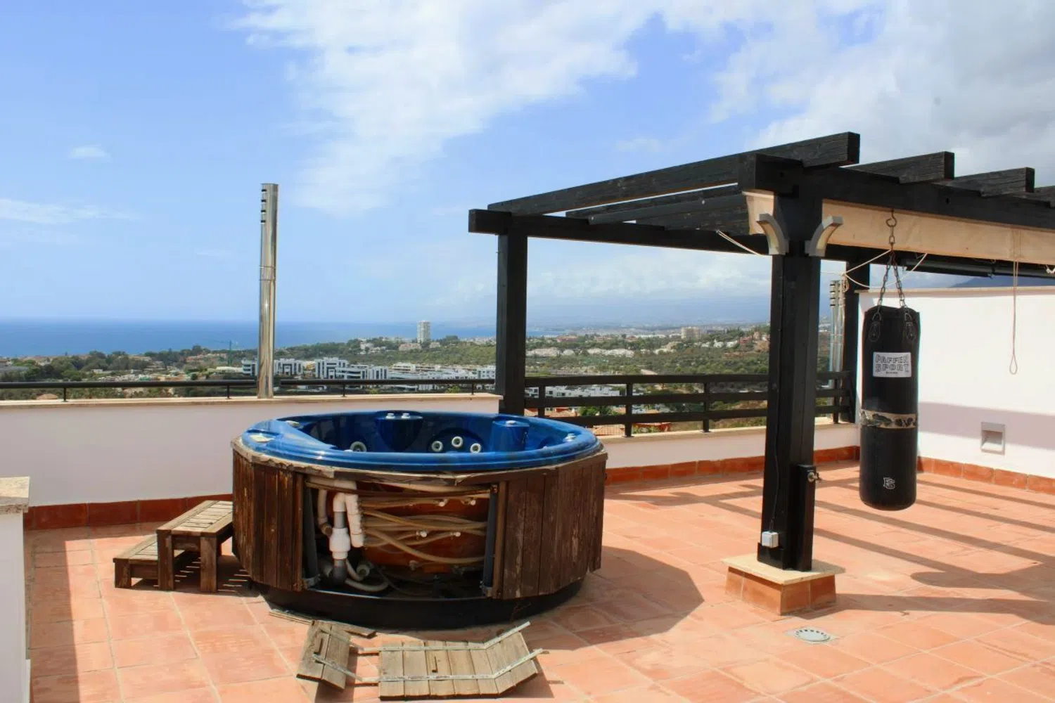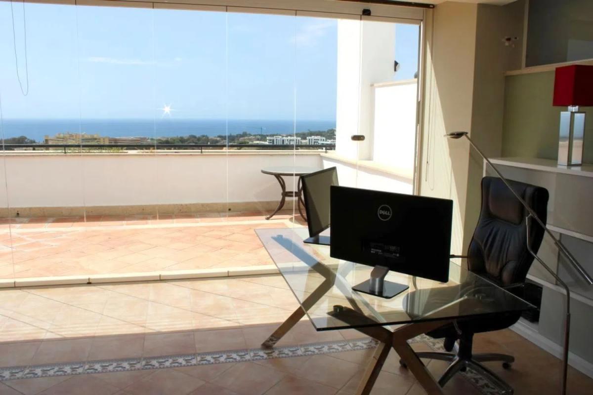 Fántastica casa adosada con vistas al mar y a la montaña en la prestigiosa urbanización de Santa Clara Golf, zona residencial muy tranquila y con seguridad 24h. A un paso de las mejores playas y chiringitos de Marbella. Distribuida en 2 plantas; En la planta principal tiene un amplio salón con chimenea con acceso a una gran terraza, cocina reformada y un aseo. En la planta superior dispone de dos dormitorios cada una con su baño en suite y vestidor. Gran solarium con jacuzzi y vistas panoramicas. Dispone de dos plazas de garajes. Aire acondicionado de frío y calor. Orientación sur. Altas calidades de construcción y con varias mejoras realizadas. Presenta gran jardín comunitario y piscina comunitaria.