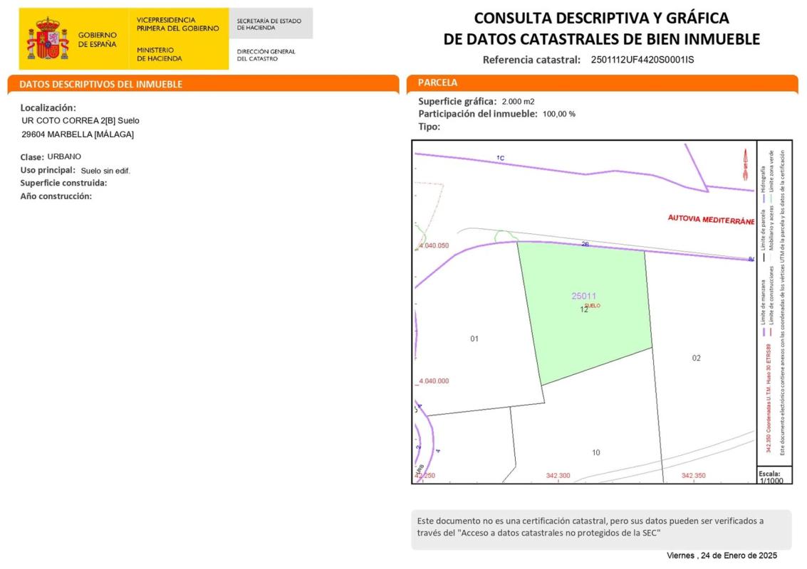 MARBELLA - URBANIZACIÓN COTO CORREA. Se vende parcela de suelo calificada como uso residencial para construcción de vivienda unifamiliar, con una superficie de terreno de 2.000 metros cuadrados, con acceso directo desde vía de servicio en la autovía, salida Las Chapas. Es una parcela urbanizable dentro de un sector, a desarrollar, y dentro de la misma hay pinos. Se puede visitar desde la carretera, publico los datos catastrales y foto aerea para una mejor identificación. El valor catastral del año 2024 es de 353.000 euros. Precio negociable si la oferta es seria.