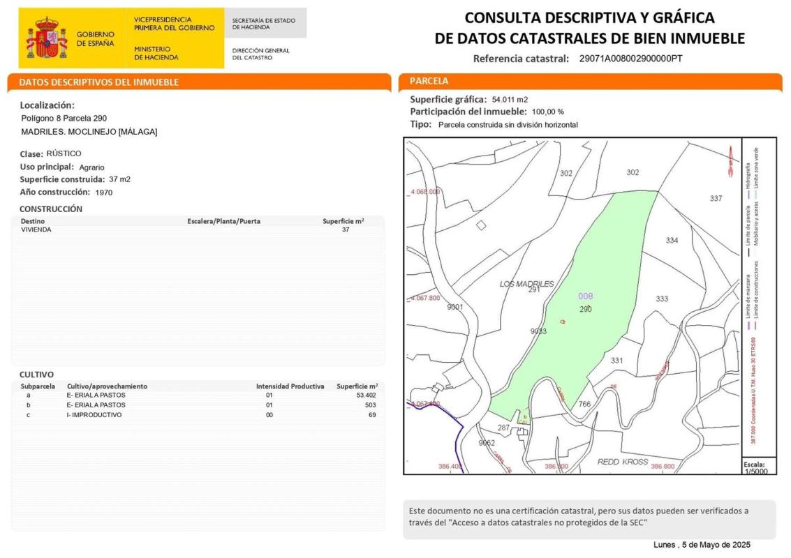 Parcela rustica en moclinejo con 26.800 metros y vistas al mar. La parcela tiene varios bancales El acceso es buenos tiene unos 500 metros de carril de tierra. Tiene luz Ideal para ponerlo d...