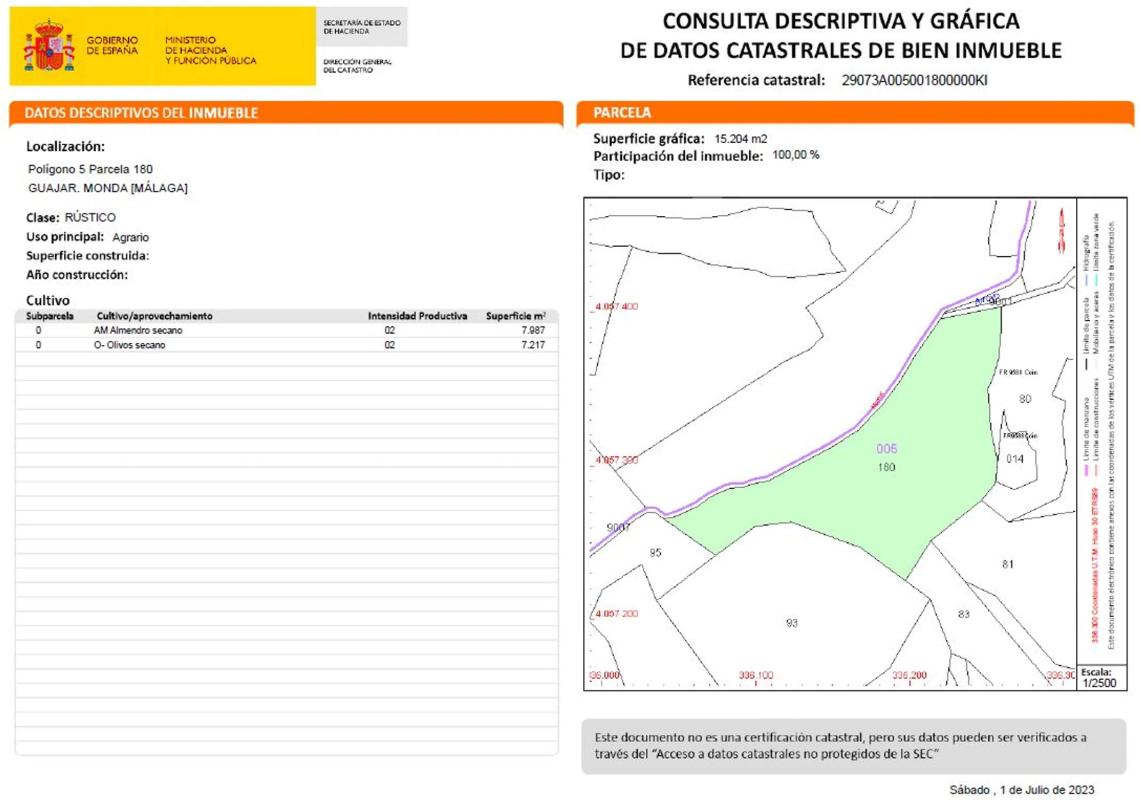 Estupenda parcela en Monda, zona de las cañadas. Se trata de un terreno quebrado con Almendros de secano en producción y olivos de manzanilla. Posibilidad de plantar aguacates mediante banca...