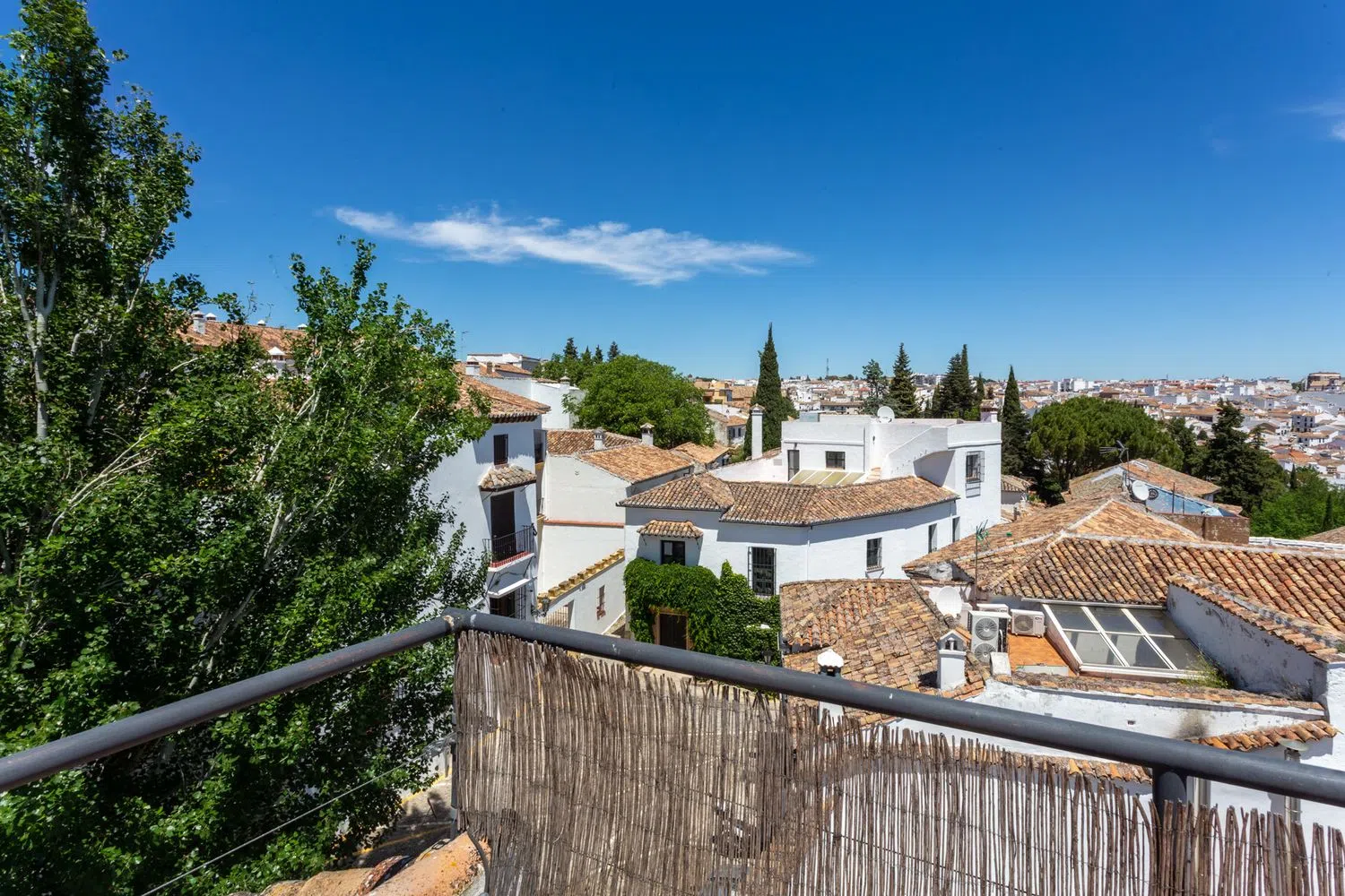 Esta espectacular propiedad se encuentra dentro del tercer recinto fortificado del S. XVII, siendo parte de las Murallas de la Cijara el muro que delimita la zona común de piscina y jardín, con el exterior. Dentro de una casa construida en el Siglo XVII y totalmente reformada en el año 2018, con tan solo 8 vecinos, se halla en venta este ático dúplex de 3 dormitorios con unas vistas impresionantes de la Sierra de Ronda, dejando el Tajo de Ronda a mano izquierda. El dúplex se encuentra en la planta primera y segunda, al que se accede por un patio semiabierto perfectamente cuidado, y a través de una escalinata con columnas de mármol, techos de palacio decorativos, y cuadros con motivos de la época. En la planta principal está la zona de día, a la izquierda del hall la cocina, muy acogedora y de estilo rústico actual totalmente equipada con electrodomésticos de marca, muy luminosa y con vistas a la calle; y a la derecha nos encontramos con un baño de cortesía, y el salón comedor con inmejorable panorámica. En la planta superior tenemos la zona de noche, con 3 dormitorios, todos con armarios empotrados y vigas de madera, uno de ellos con vistas a la calle, y los otros dos, incluido el principal, con vistas a la Sierra. En esta planta también hay un baño completo con plato de ducha que da servicio a las habitaciones. Características: El piso tiene calefacción central de gasóleo. La azotea y zona común de la casa, tiene unas vistas 360 grados, del pueblo y la Serranía de Ronda, y Sierra Hidalga, la Iglesia de Santa Maria la Mayor de Ronda, convertida en Colegiata por el rey Fernando el Católico, que se levanta sobre la antigua mezquita aljama de la ciudad, una edificación del siglo XIII, que anteriormente pudo haber sido un templo romano. Asimismo se ve la Alcazaba, construcción fortificada reformada en el siglo XIV. En sus restos se pueden apreciar todavía partes de la estructura árabe original. También la Iglesia del Espíritu Santo, erguida por los Reyes Católicos en el S XV. En Ronda se encuentran los baños árabes mejor conservados de España.
