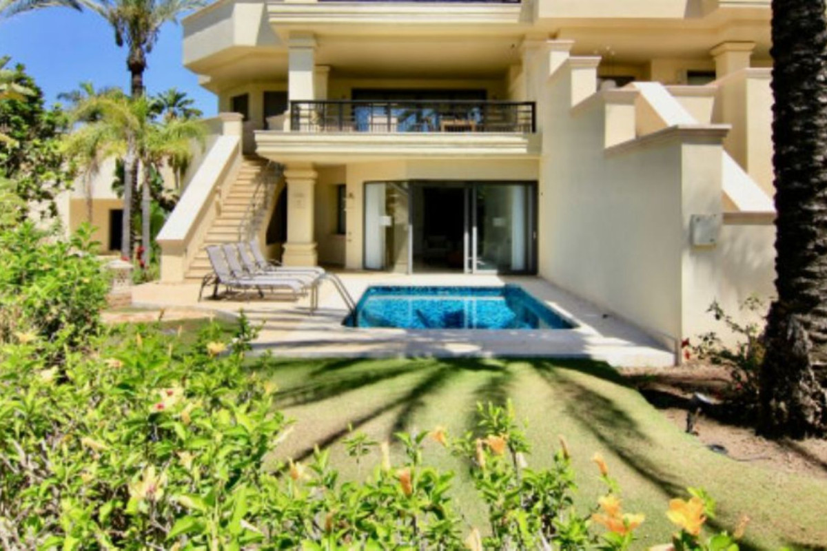 Planta baja dúplex apartamento de tres dormitorios situado en la exclusiva playa de primera líneadesarrollo de Laguna de Banus. 24 hr comunidad cerrada con hermosa orientaljardines, piscina...