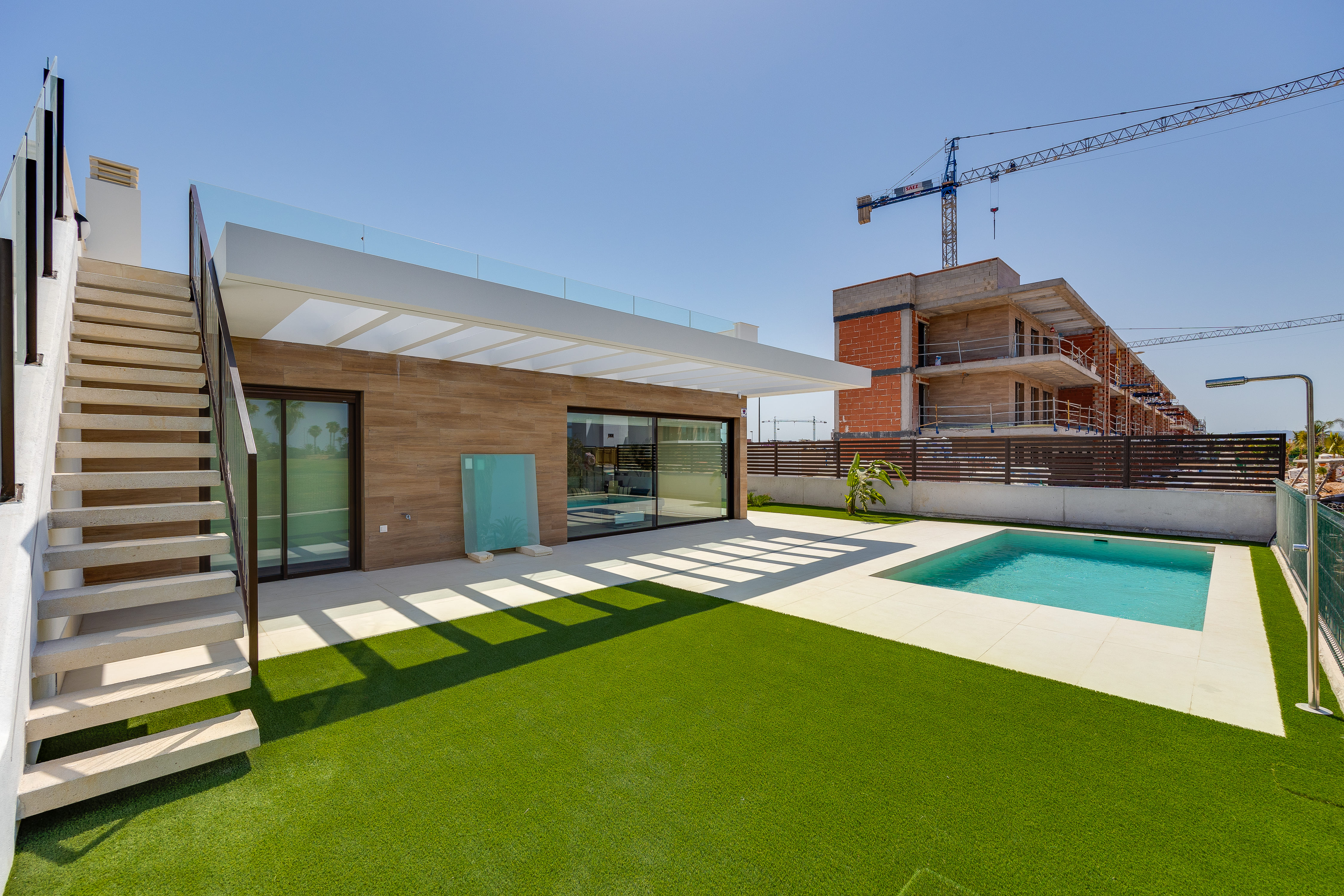 Outside, the private plot of approximately 350 m² transforms into a true personal oasis. The private pool is perfect for cooling off on warmer days, while the solarium located at the top invites relaxation and enjoyment of the open views of the golf course and the surrounding natural environment.