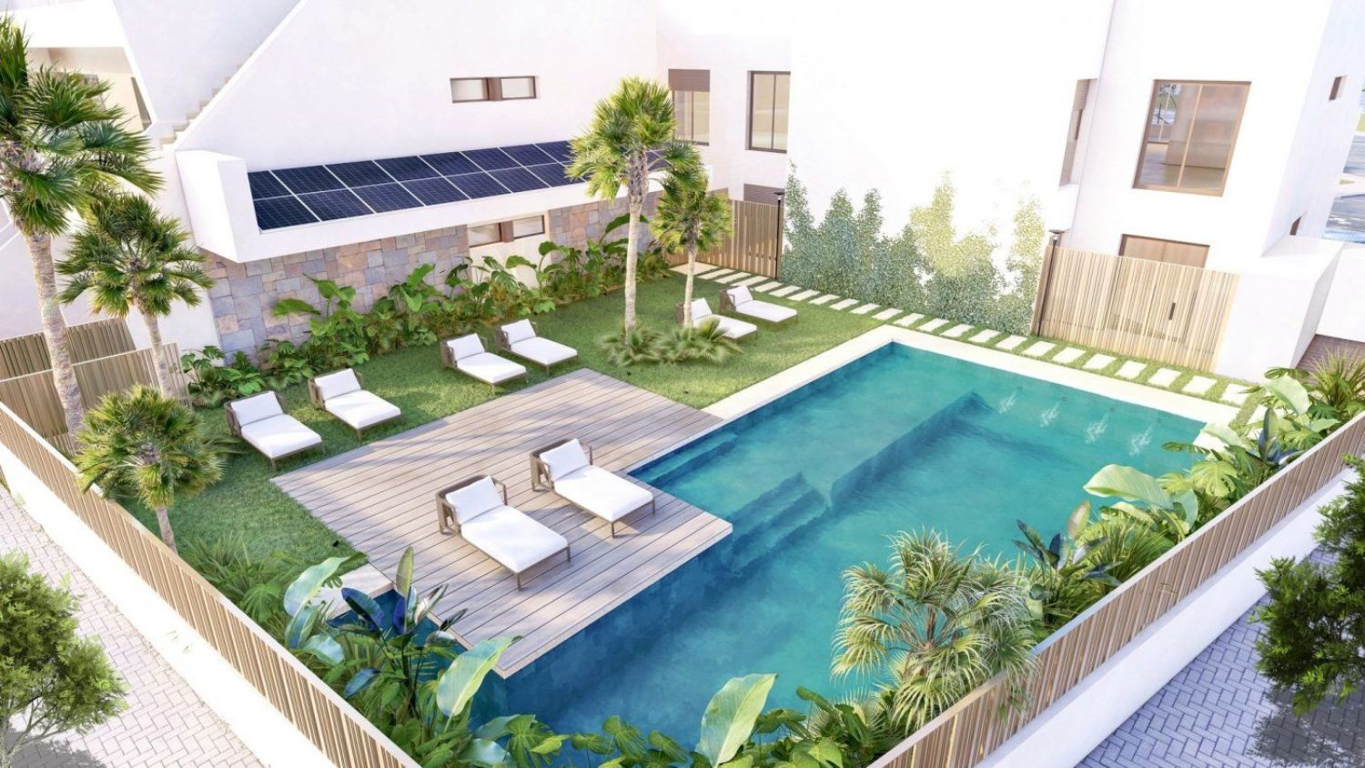 BUNGALOW PLANTA BAJA EN SAN PEDRO DEL PINATAR. Vivienda completamente equipada, a tan solo dos minutos a pie del centro de la localidad de San Pedro del Pinatar. La vivienda tiene tres dormitorios, dos baños y una amplia zona de día con una amplia cocina y un salón-comedor que da a la terraza. Las habitaciones son amplias y llenas de luz natural con un toque elegante, que aportan comodidad a los hogares. El dormitorio principal, con su baño y celosía traslúcida que deja pasar la luz también desde la terraza. El baño está equipado con un amplio espacio de almacenamiento y una ducha con una zona de estar incorporada. El tercer dormitorio se ubica hacia la fachada principal y es una sala polivalente. Un sistema de cama plegable permite su uso como dormitorio o sala multifunción cuando no se utiliza la cama. Está diseñado para que se pueda utilizar una gran puerta corredera para cerrar este espacio o, alternativamente, tirar hacia atrás para unir esta habitación a la sala de estar y aumentar su tamaño. Las áreas comunes disfrutan de la máxima exposición al sol, mientras que la piscina tiene un mecanismo de nado a contracorriente y agua caliente, lo que permite a los residentes nadar desde abril hasta noviembre. Los paneles solares ahorran energía, lo que hace que el complejo sea una opción más sostenible. Los residentes pueden disfrutar del jacuzzi o tomar el sol en el área de la piscina rodeada de vegetación, diseñada para asegurar la máxima privacidad, mientras que materiales especiales efecto roca garantizan ese efecto visual de conexión con la naturaleza. Magnífica zona ajardinada con césped artificial y abundante vegetación en las zonas comunes que se combinan para garantizar la privacidad. Zona de descanso con gres porcelánico antideslizante y zonas de paso con grandes losas de hormigón. Piscina con acabado de gresite y sistema depurador de cloro, zona 'playa', jacuzzi, cascada y mecanismo de nado a contracorriente. Calentador de agua para permitir el uso de la piscina de abril a noviembre, funciona con energía de paneles solares. Situado en un entorno urbano lleno de servicios a los que se puede llegar a pie, sin necesidad de vehículos: comercios, bancos, cafeterías, farmacias, restaurantes, centros médicos. Además, San Pedro del Pinatar está justo en la costa y es completamente plano, por lo que es ideal para paseos largos en bicicleta o visitando nuevos lugares en bicicleta.