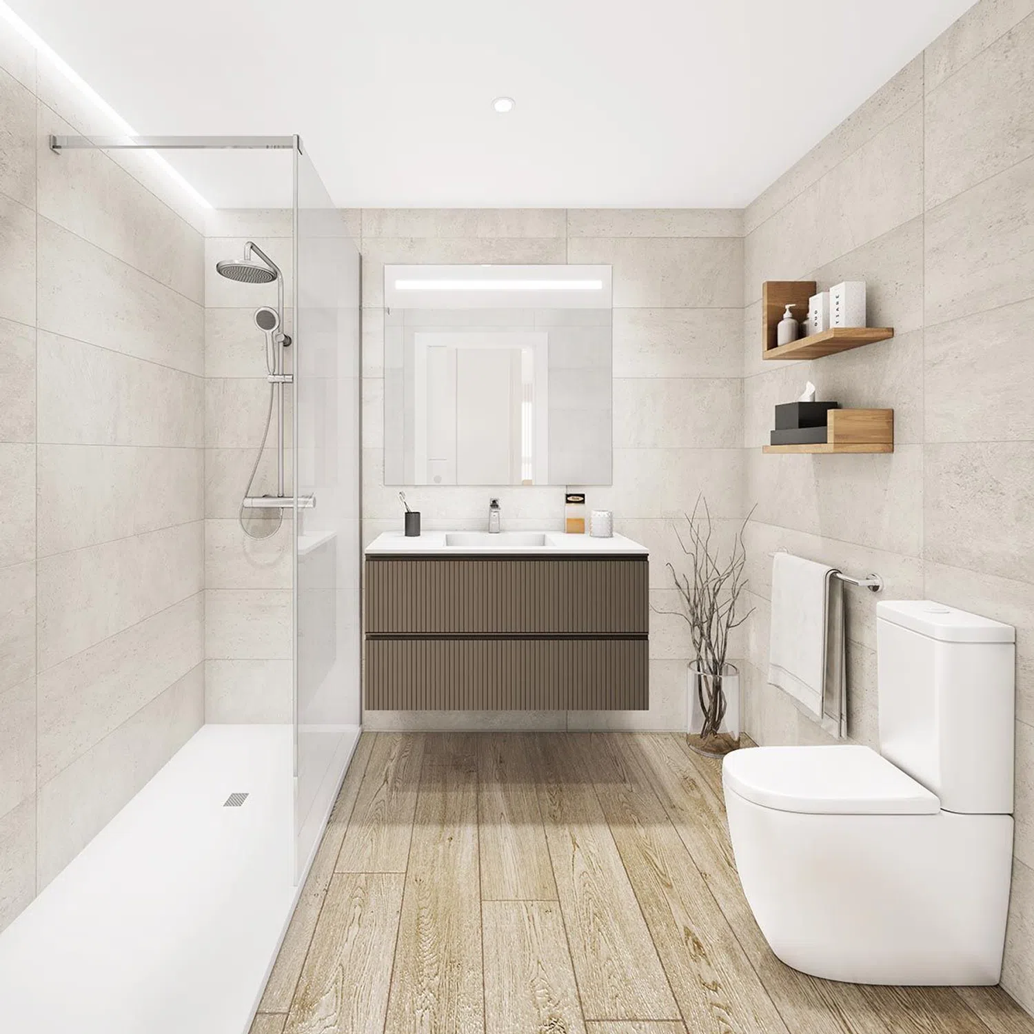 The units come with garage spaces and storage rooms in the basement and a complete, customizable range of equipment. Kitchens are equipped with straight-line furniture with a Gola handle and LED lighting under high cabinets. Countertops and backsplashes are made of porcelain or similar. Built-in appliances include a refrigerator, pyrolytic oven, microwave, induction hob, extractor hood, dishwasher, and washing machine, all from the premium BOSCH range. Bathrooms are designed with high-quality materials, equipped with a suspended vanity unit and front-lit mirror, an extra-flat shower tray with a screen in the main bathroom, and thermostatic taps in the bath and shower.