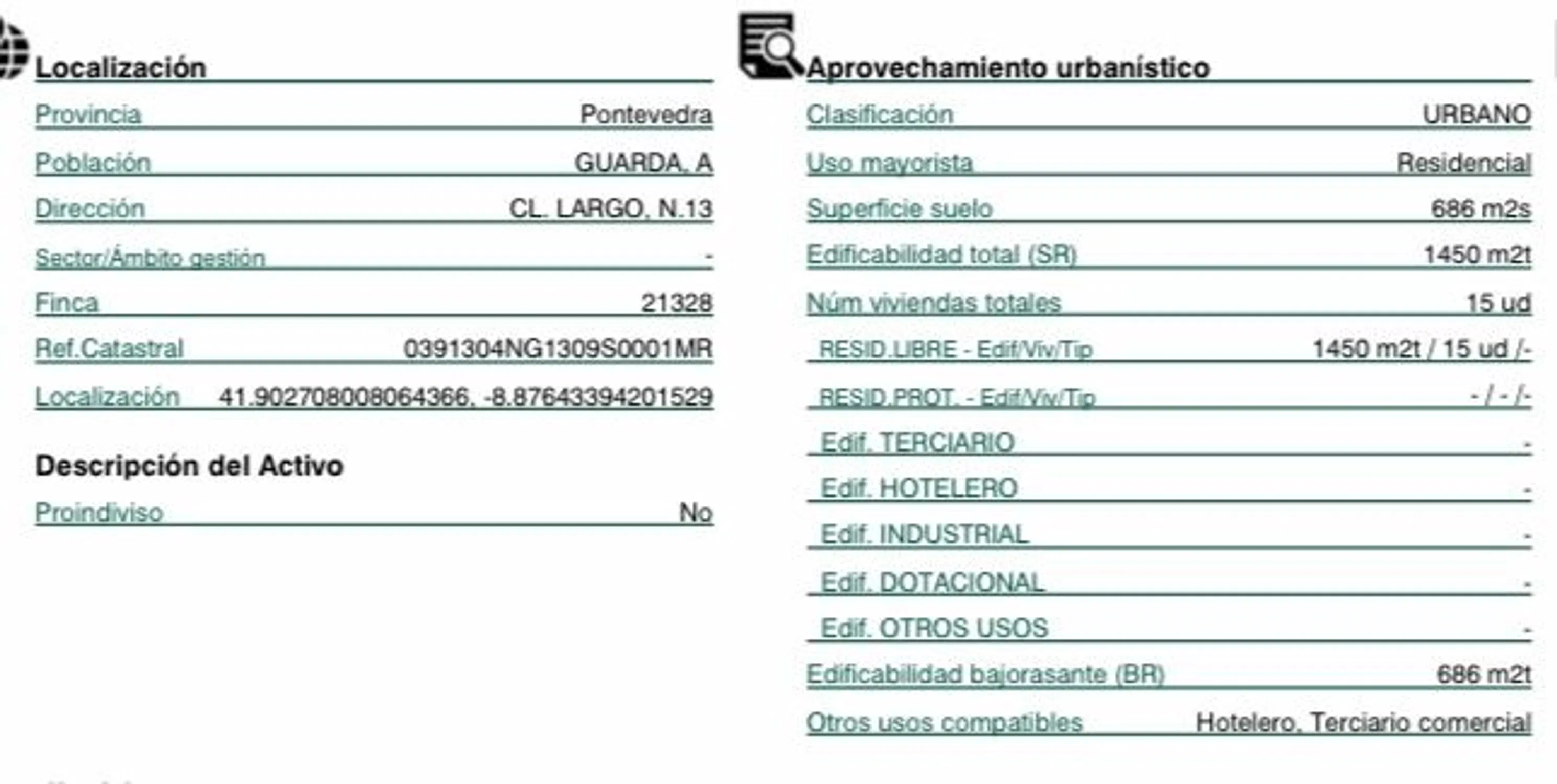A Guarda (calle Largo), solar 686 metros, edificable para edificio, edificabilidad 1.450 metros aproximadamente. Referencia catastral: 0391304NG1309S0001MR Precio: 174.500€. La Guardia, es un municipio del sudoeste de Galicia, la población más meridional de la provincia de Pontevedra Comunica con Portugal por la frontera natural del río Miño por el sureste, con el océano Atlántico por el oeste y con el ayuntamiento de El Rosal por el norte. Es accesible por la carretera PO-552 desde Tuy y desde Bayona, y desde Caminha por transbordador. Se encuentra a 50 km de Vigo y a 120 de Santiago de Compostela. La altitud a nivel del mar no impiden al Monte de Santa Tecla y al Monte Terroso elevarse sobre 314 m y 350 m respectivamente, permitiendo excelentes vistas, especialmente desde el Monte de Santa Tecla donde se puede disfrutar de la desembocadura del río Miño, el océano Atlántico y los montes de Portugal y Galicia. La Guardia es una villa que sufre una reconversión encubierta en la que, tras una época de esplendor en el sector de la pesca, intenta transformarse, debido a su falta de tejido industrial, en un ayuntamiento dedicado a los servicios, sobre todo al turismo. Pero este giro económico ha supuesto que se volviera a producir una nueva oleada de emigración, esta vez a las islas Canarias. Esta problemática hace que sea un ayuntamiento con un censo sin apenas variaciones en muchos años. A Guarda es un municipio gallego situado en la provincia de Pontevedra donde es el municipio más meridional. Destaca del patrimonio la iglesia parroquial de La Guardia, el Castro de Santa Tecla, La Torre del Reloj, antiguo homenaje medieval que fue destruida y reconstruida el S. XVI, el Centro Cultural de finales de los años 20 del siglo pasado, el Castillo de Santa Cruz con 4 baluartes y el Museo del Mar. Información de la zona Municipio: Guarda, A Provincia: Pontevedra N. º de habitantes: 10.133 Superficie: 20,88 km2.