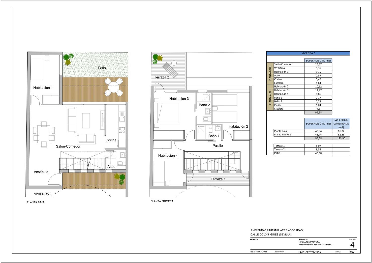 "URBANIZACIÓN PRIVADA AV. COLÓN, 23 - 3 VIVIENDAS INDEPENDIENTE DE 4 DORM. , 3 BAÑOS, PLAZA DE GARAJE AMPLIOS PATIOS CON PISCINA INDIVIDUAL"Ubicada en el municipio de Gines, en una de las mejores zonas del Aljarafe Sevillano, con todo tipo de servicios: Supermercados (Mercadona, Lidl, Bricomart, Bonsabor, etc. ); Centros Sanitarios (Farmacias, Dentista, Fisioterapeutas, Podólogos y Centros de Salud, Hospital de Bormujos, Hospital NISA, etc. ); Centros Docentes (públicos y privados como Yago School, Europa, etc. ); Centros de Ocio a su alcance (Gines Plaza, etc. ); ETC.Acceso y salida inmediata desde autovía A-49, que le permite vivir a escasos minutos de Sevilla y localidades cercanas, en un entorno privilegiado y muy tranquilo.Viviendas dúplex desde 118m2 a 126m2 construidos, contando los proyectos aquí planteados con un dormitorio en planta baja, patios traseros desde 41 a 46m2, terrazas, amplio salón-comedor de 26 a 28m2, cocina independiente y aseo o baño en planta baja. Ya en planta alta, se ubican otras 3 habitaciones con armarios empotrados y 2 baños completos, siendo la habitación principal, tipo “suite”Están pensadas para disfrutar de la orientación más luminosa, orientación sur y este patio trasero, estando en el centro de la localidad en plena zona residencial.En su memoria de calidades común a todas los proyectos presentados, la vivienda cuenta mecanismos e instalaciones de gran calidad y gama alta, calificación energética “A”, la mejor con un ahorro en consumo eléctrico del 50% por su eficiencia en aislamiento térmico y acústico, sanitarios roca de diseño, vídeo portero, suelo laminado, pre instalación de acondicionado centralizado o por Split, puerta de seguridad exterior, agua caliente por placas solares y apoyo de calentador individual, puertas lacadas blancas (pueden cambiarse a barnizadas), herrajes cromados (pueden cambiarse), ventanas climalit con rotura de puente térmico y aislante acústico e incluido en el precio plaza de garaje privada en la entrada al residencial.Financiación al 80% del precio de proyecto total “llave en mano”.Plan de pagos durante obra personalizable.Distribución en planos modificable a petición del interesado.Cantidades depositadas garantizadas.Precio de venta SIN IMPUESTOS (+10%).