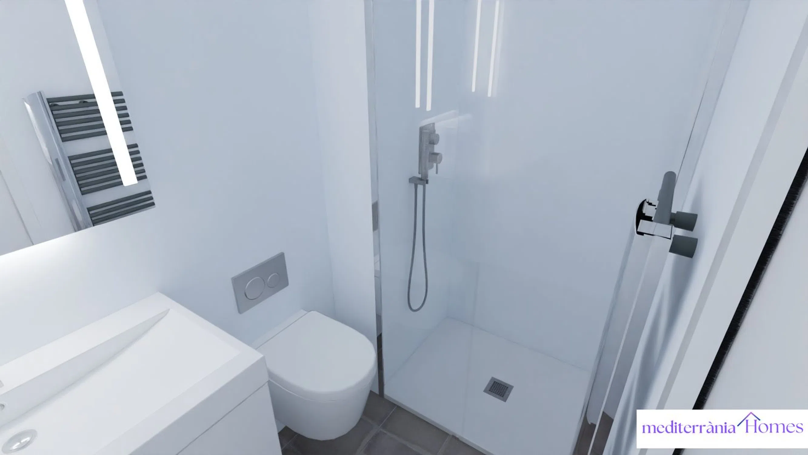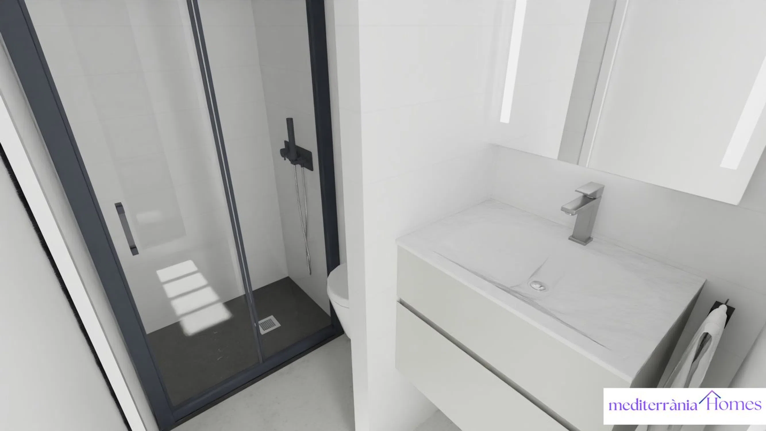 The interiors are resolved with modernity and functionality: large format porcelain stoneware floors, kitchens equipped with laminated furniture and quartz tiles, lacquered white doors, and built-in wardrobes. The bathrooms, with resin shower trays and suspended sanitary fixtures, reflect a minimalist and quality finish. The ventilated façade with thermal insulation and aluminum closures with thermal break guarantees optimal energy efficiency. In addition, all homes incorporate aerothermal systems and pre-installation of ducted air conditioning, with an expected energy certification of class A.