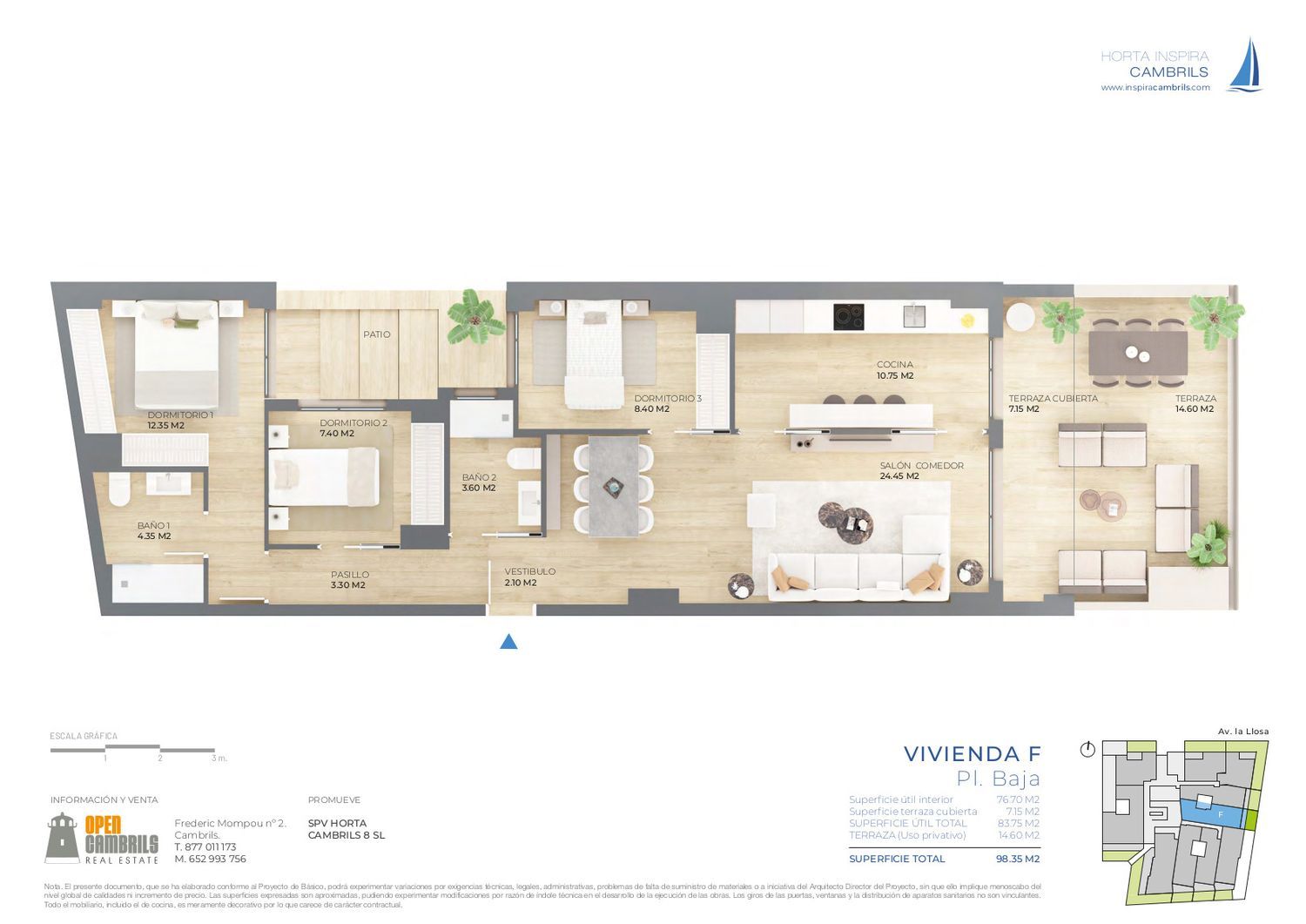 62 viviendas a 350 mts de la playa y a 400 mts. del puerto de Cambrils, en una urbanización privada que ofrece viviendas que combinan una alta habitabilidad, eficiencia, diseño y unas vistas inigualables.Las viviendas de INSPIRA CAMBRILS disponen de plaza de garaje y trastero, y la urbanización cuenta con zonas verdes con piscina, . Las distintas tipologías están estudiadas para abrir las estancias al exterior, con terrazas panorámicas creando despejados espacios en la vivienda, disponiendo las plantas bajas de una amplia terraza privativa. Las distintas tipologías están estudiadas para abrir las estancias al exterior, con terrazas panorámicas creando despejados espacios en la vivienda, disponiendo las plantas bajas de una amplia terraza privativa. El acceso a las terrazas, se realiza a través de amplios ventanales, permitiendo una gran zona de paso creando un espacio exterior/interior unido. La fachada está formada por panel prefabricado de hormigón arquitectónico. TODAS LAS VIVIENDAS INCLUYEN EN EL PRECIO UNA PLAZA DE PARKING Y UN TRASTERO.INTERIORESClimatización mediante Bomba de Calor individual frío /calor.Producción de Agua Caliente sanitaria mediante Aerotermia. Grifería termostática en duchas.Alicatados en baños con aplacado vertical cerámico porcelánico de 1ª calidad e gran formato en diferentes acabados. Pintura plástica lisa en paramentos verticales y horizontales de la vivienda.Cerámica para suelos tipo Keramik Hönnun en formato de Pavimento cerámico rectificado en diferentes acabados personalizables. En Vivienda: Pintura plástica lisa en colores suaves.Puerta de entrada a vivienda blindada maciza de 45 mm de espesor lacada en blanco con cerradura de seguridad de 3 puntos y manilla interior inox. Puertas interiores lisas lacadas en color blanco.Rodapié interior a juego con la carpintería. Cocinas equipadas con muebles HÖNNUN SALTOKI HOME con lineas rectas y tiradores tipo gola, personalizables entre una amplia gama de tonos y colores.Electrodomésticos BOSCH, incluyendo frigorífico integrado, Horno multifunción, Microondas, placas de inducción, campana extractora, lavadora y lavavajillas.baños equipado con muebles de baño suspendidos en diversos tonos a elegir y espejo. Plato de ducha personalizable en diversos colores/acabados, Grifería monomando cromada Stillo.FINCAZona comunitaria con piscina. Disponen de parking y trastero subterráneo.