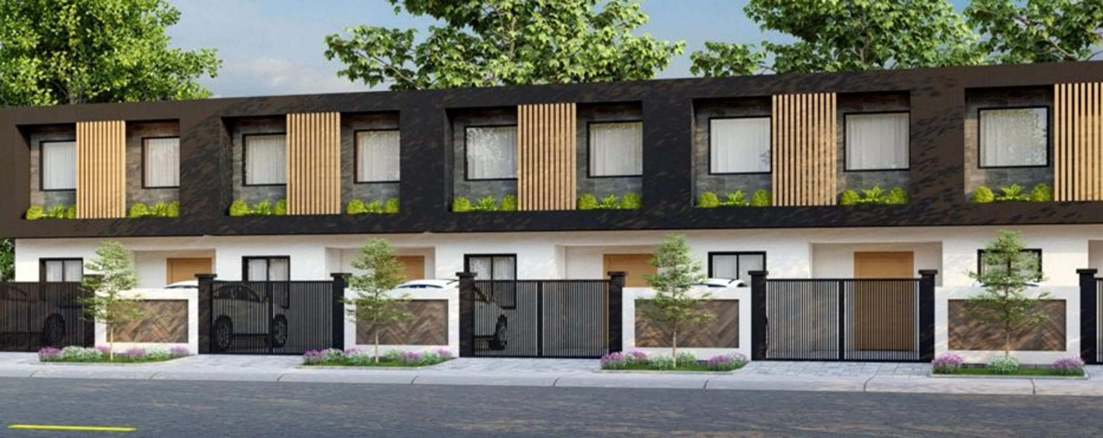 Striking exterior design: With a modern, minimalist facade in dark tones and vertical wood accents, it combines sobriety with nature. Each house features its independent access, a clean and avant-garde aesthetic, surrounded by greenery and floral details that add warmth without losing sophistication.