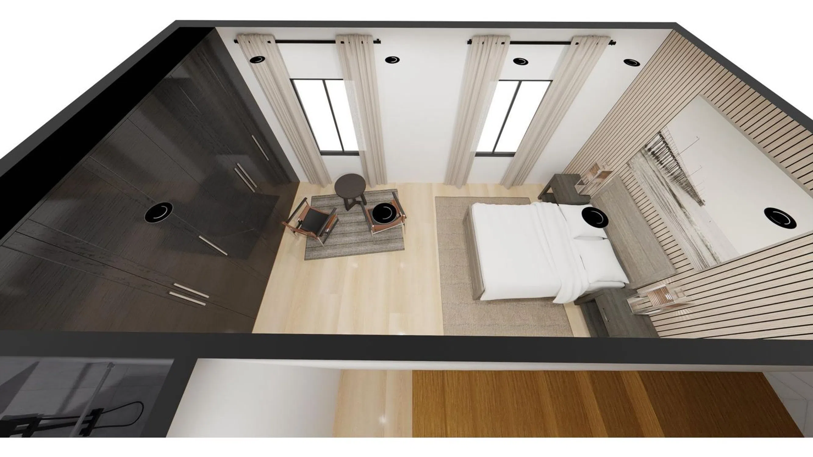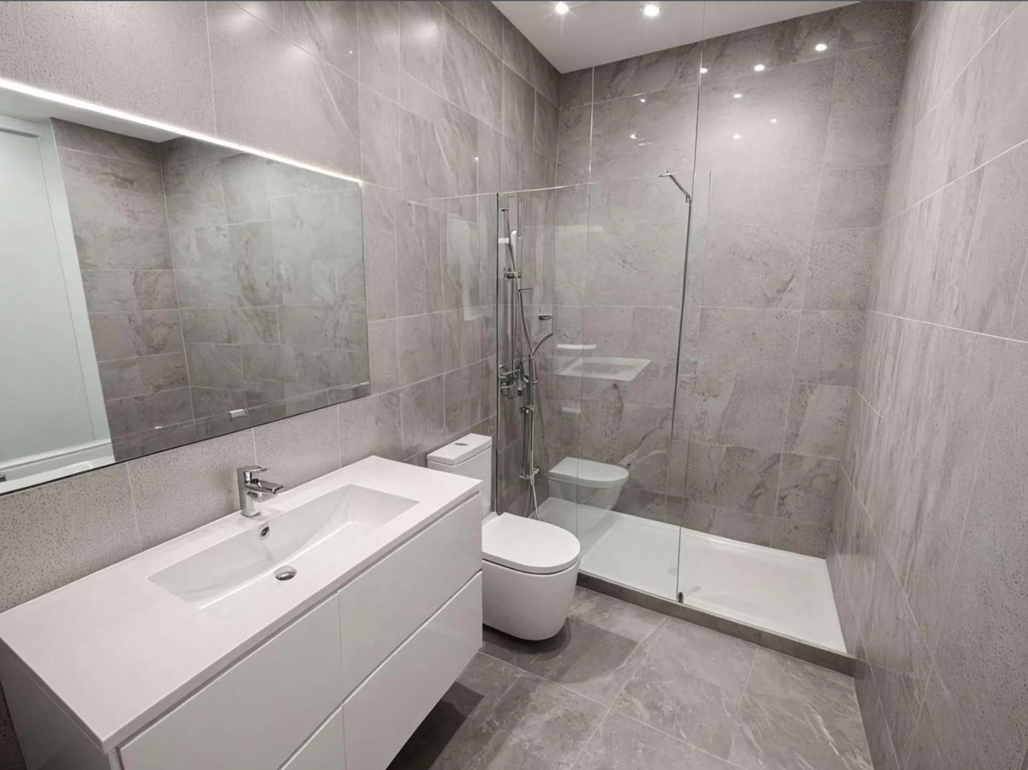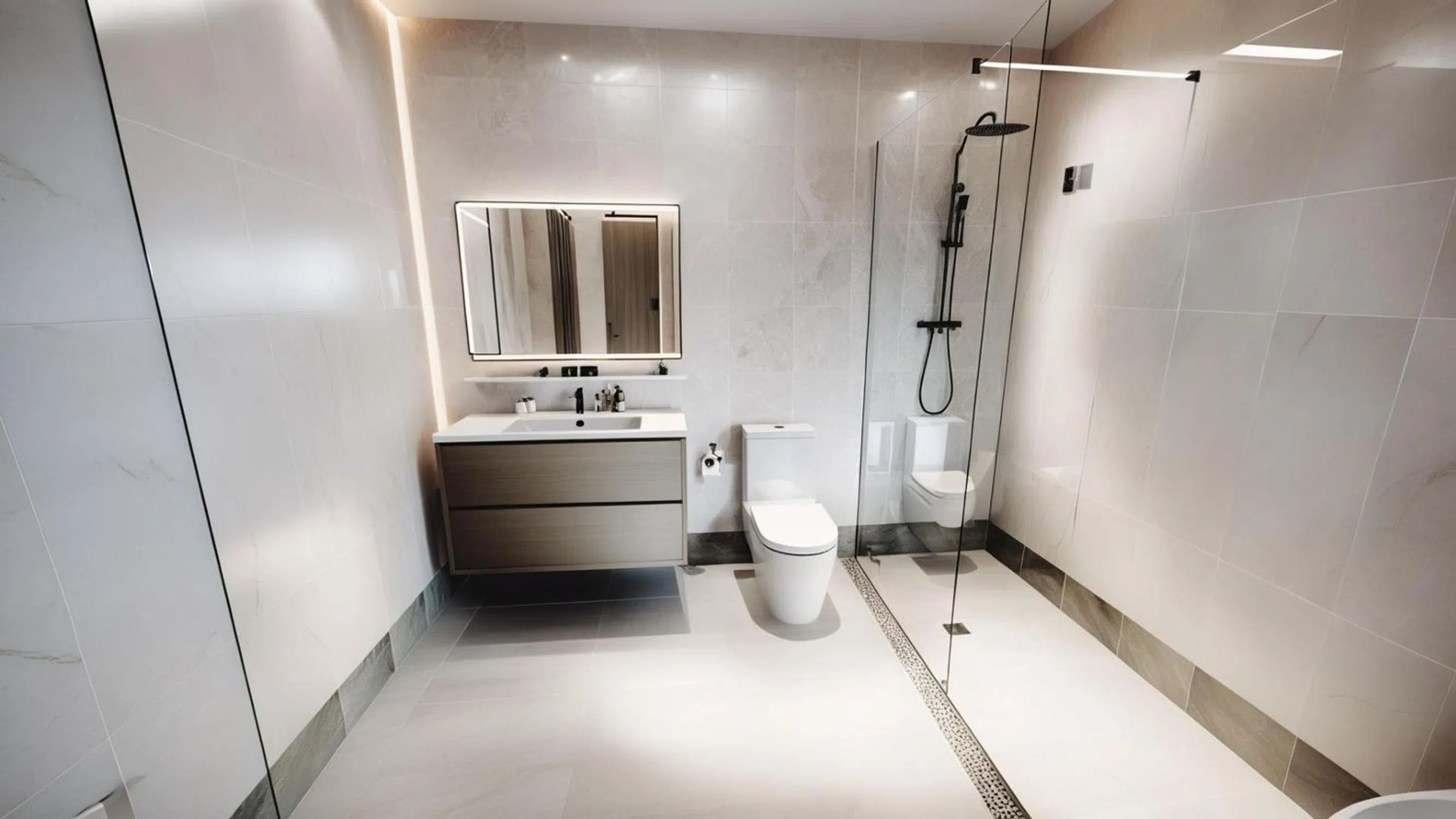 Impeccable bathrooms: Modern, clad in gray stone, with designer showers, backlit mirrors, and luxury finishes that impart a boutique hotel feel at home.