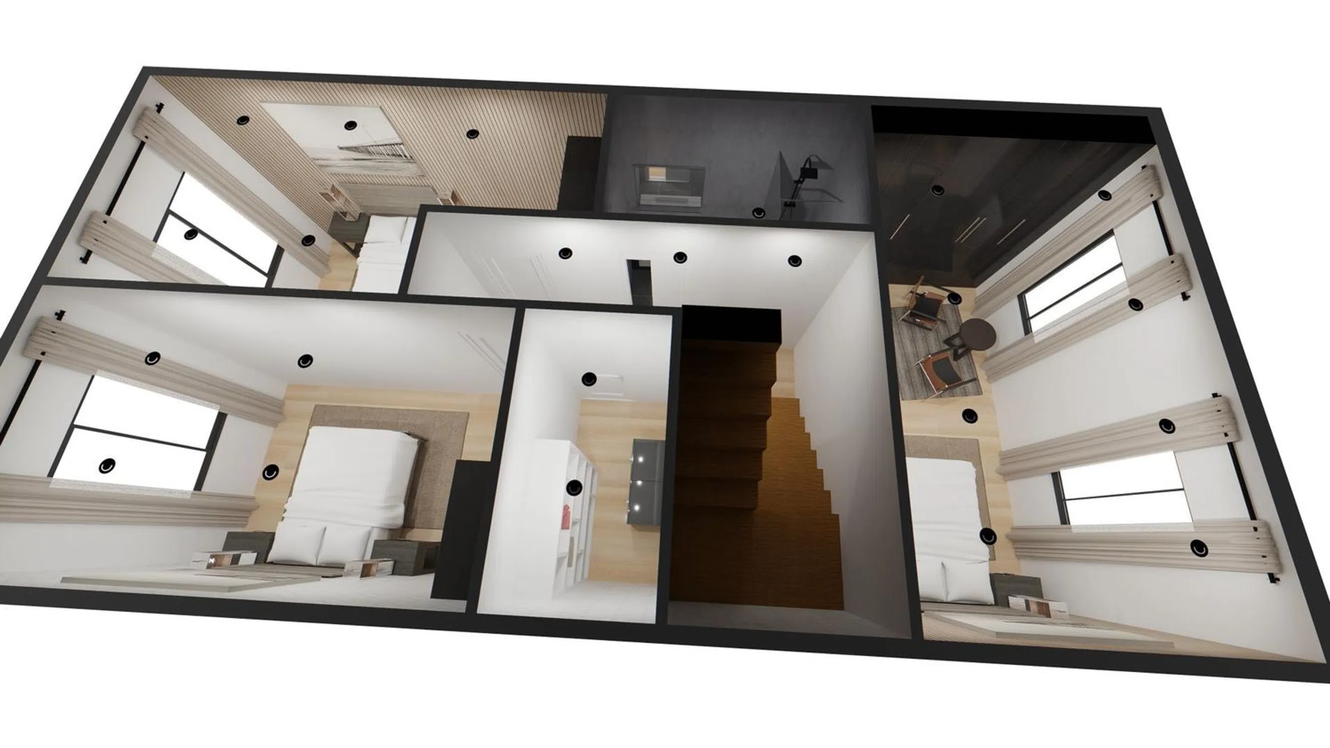 Four versatile bedrooms: A master suite full of peace and space (18.3 m²). Two medium-sized rooms inviting rest (13.7 m² and 13.3 m²). A versatile room ideal as a study, playroom, or guest room (9 m²).