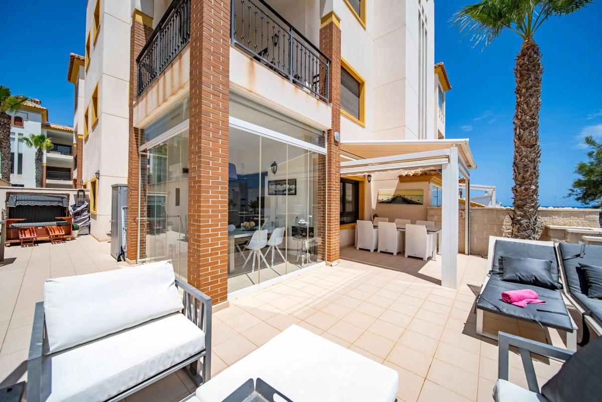 Completamente renovado en 2021, este luminoso y moderno apartamento en planta baja ofrece la combinación perfecta de confort, espacio y vida costera. Ubicado en la tranquila urbanización Lom...