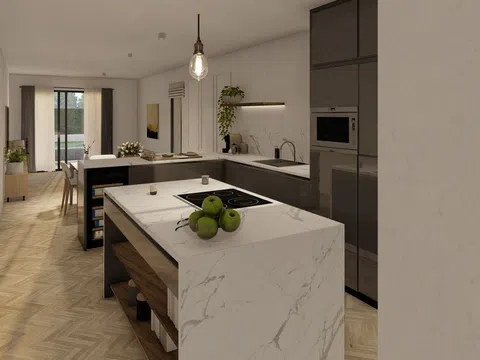 The construction features traditional partition walls, finished with sleek white paint, complemented by white interior carpentry and contemporary gray exterior PVC fixtures. Security is paramount with a robust entrance door, and the homes are climate-controlled with an energy-efficient aerothermal system that provides underfloor heating and cooling.