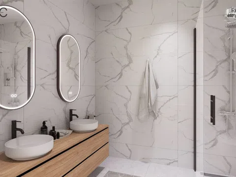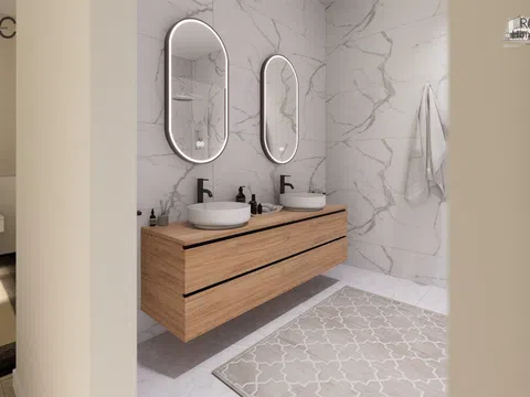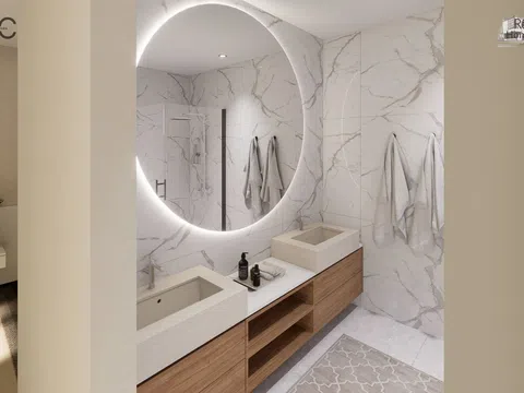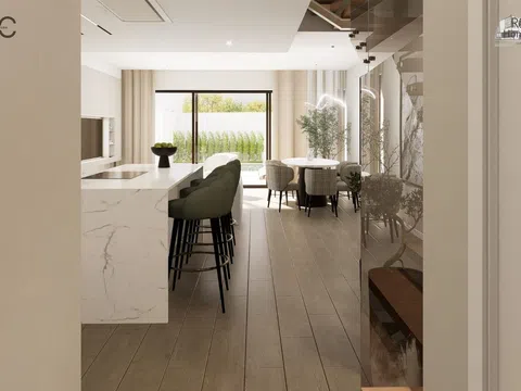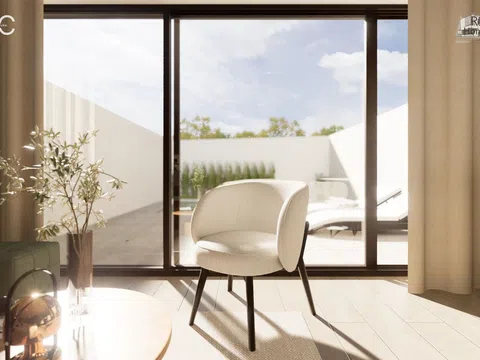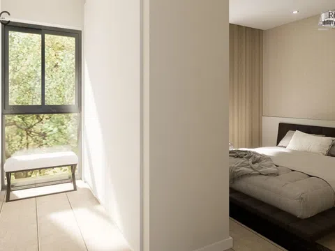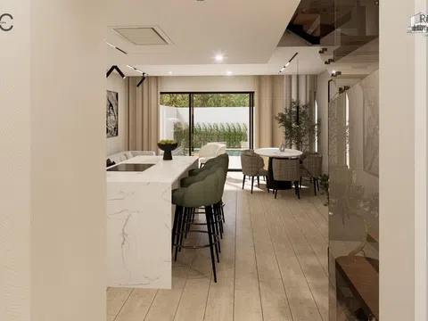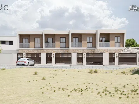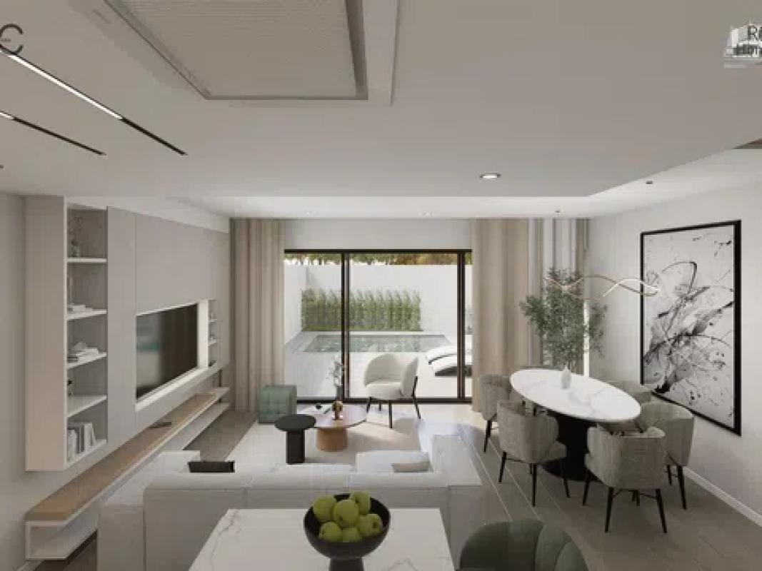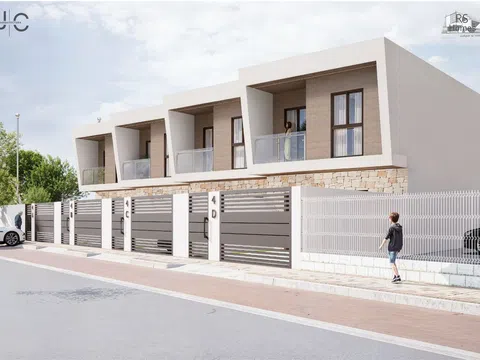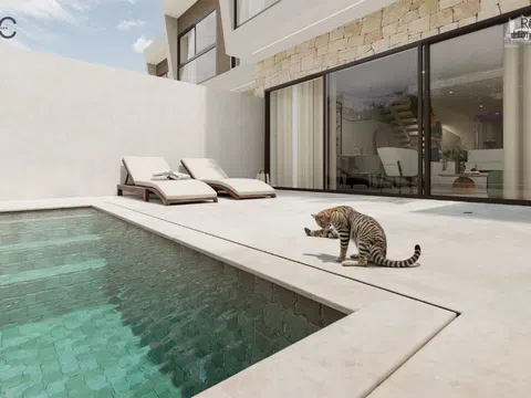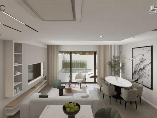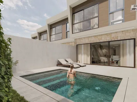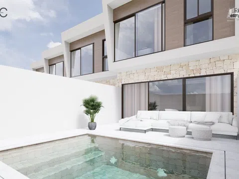 The residential complex comprises homes of ground floor plus two levels, each possessing a plot of about 140 m² to relish lush garden areas and a standalone pool with a beach island, coated with elegant blue Bali porcelain for a touch of natural sophistication. The architecture exudes a Mediterranean essence with its matte white waterproof mortar finish, along with natural stone and wood-effect cladding. These homes offer a spacious living-dining area with a kitchen island, four bedrooms featuring built-in wardrobes, including one with a walk-in closet and en-suite bathroom, complemented by two additional modern bathrooms. In total, the property spans 132 m² with four bedrooms, three full bathrooms, and a study area on the top level.