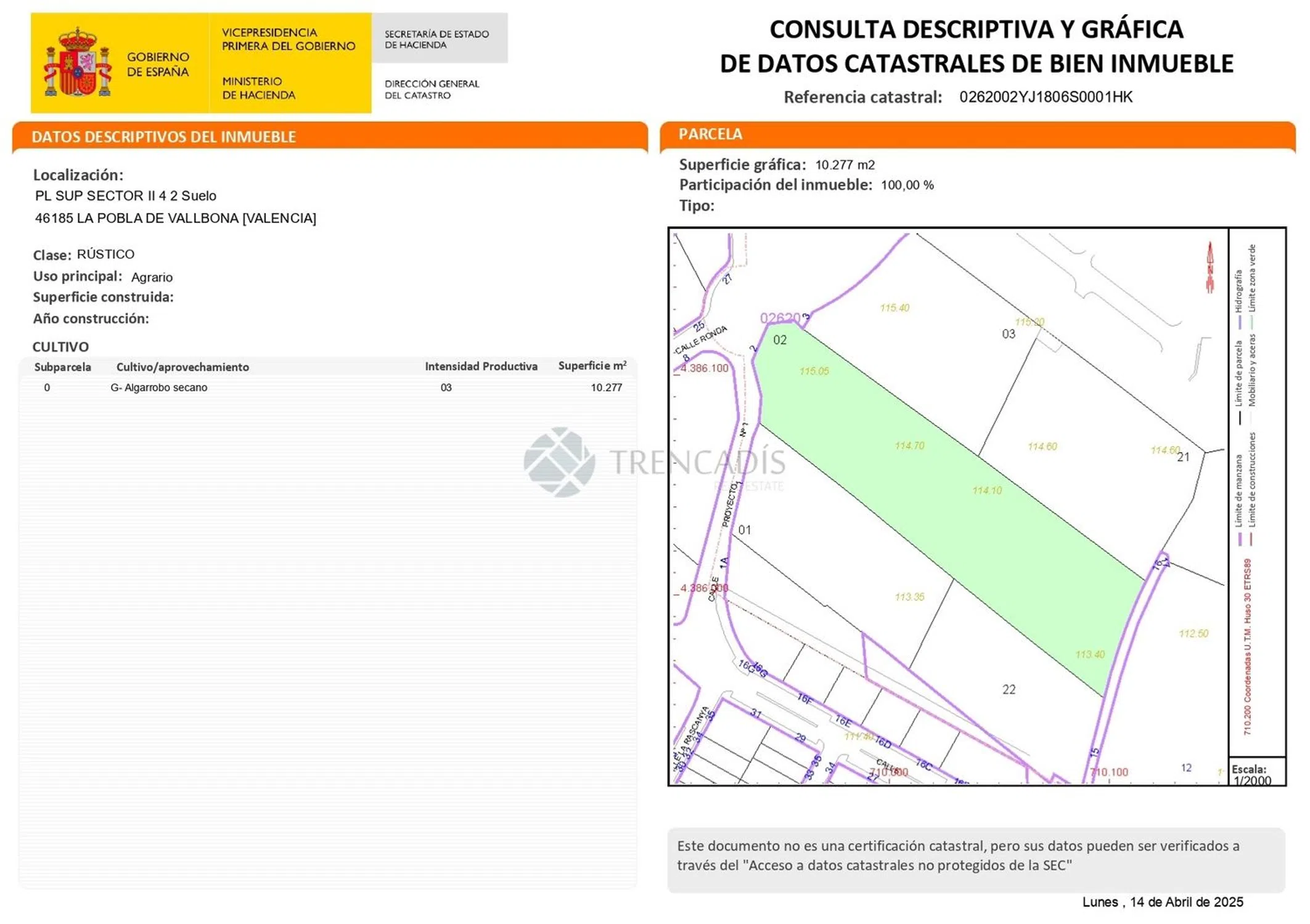Oportunidad de adquirir un terreno urbano ubicado en la localidad de La Pobla de Vallbona, provincia de Valencia. Conjunto de tres parcelas de aportación al Sector R-17, en partida SAFAREIG, paraje CASA BLANCA, Polígono 49, PARCELAS 269 Y 270. SUP SECTOR II nº4-2. Son SUELOS URBANIZABLES DE USO RESIDENCIAL PENDIENTE DE GESTIÓN Y DE URBANIZACIÓN con una superficie del conjunto de 15.573mt2. Zona suburbana situada junto al casco urbano, entre la urb. Rascanya y el casco urbano. Dispone de buenos accesos y está bien comunicado. -Ref. Catastral 46204A04 0GG, 46204A04 0GP y 0262002YJ1806S0001HK. -Edificabilidad: 5.757, 10 m²t -Altura máxima: 4 plantas. Se permite bajo cubierta. -Hipótesis: Promoción más probable 36 adosados de unos 160 mt2 aprox. La Pobla de Vallbona cuenta con un centro de salud bien equipado, servicios de urgencias y acceso a hospitales cercanos en Llíria y Valencia. Ofrece educación infantil, primaria, secundaria y formación para adultos, con colegios públicos y privados. Su comercio es variado, con tiendas locales, supermercados y un mercado semanal. Destaca por su calidad de vida, con zonas verdes, una rica vida cultural y eventos festivos. Conexiones terrestres óptimas incluyen acceso a la CV-35, transporte público, autobuses y estación de metro que enlazan con Valencia. SIN COMISIONES. Contáctenos y le informaremos sin compromiso. ABSTENERSE AGENCIAS. En TRENCADÍS REAL ESTATE estamos especializados en la gestión de activos inmobiliarios, contamos con un equipo de profesionales con un alto grado de especialización y más de 20 años de experiencia.