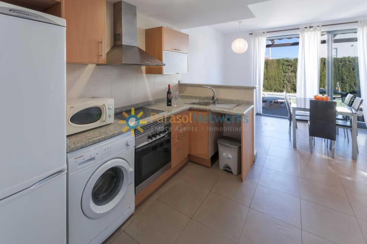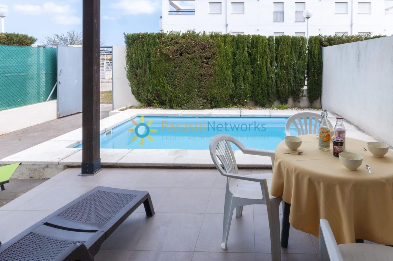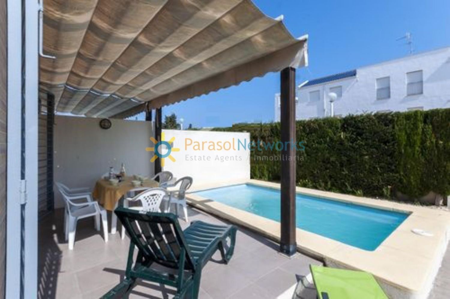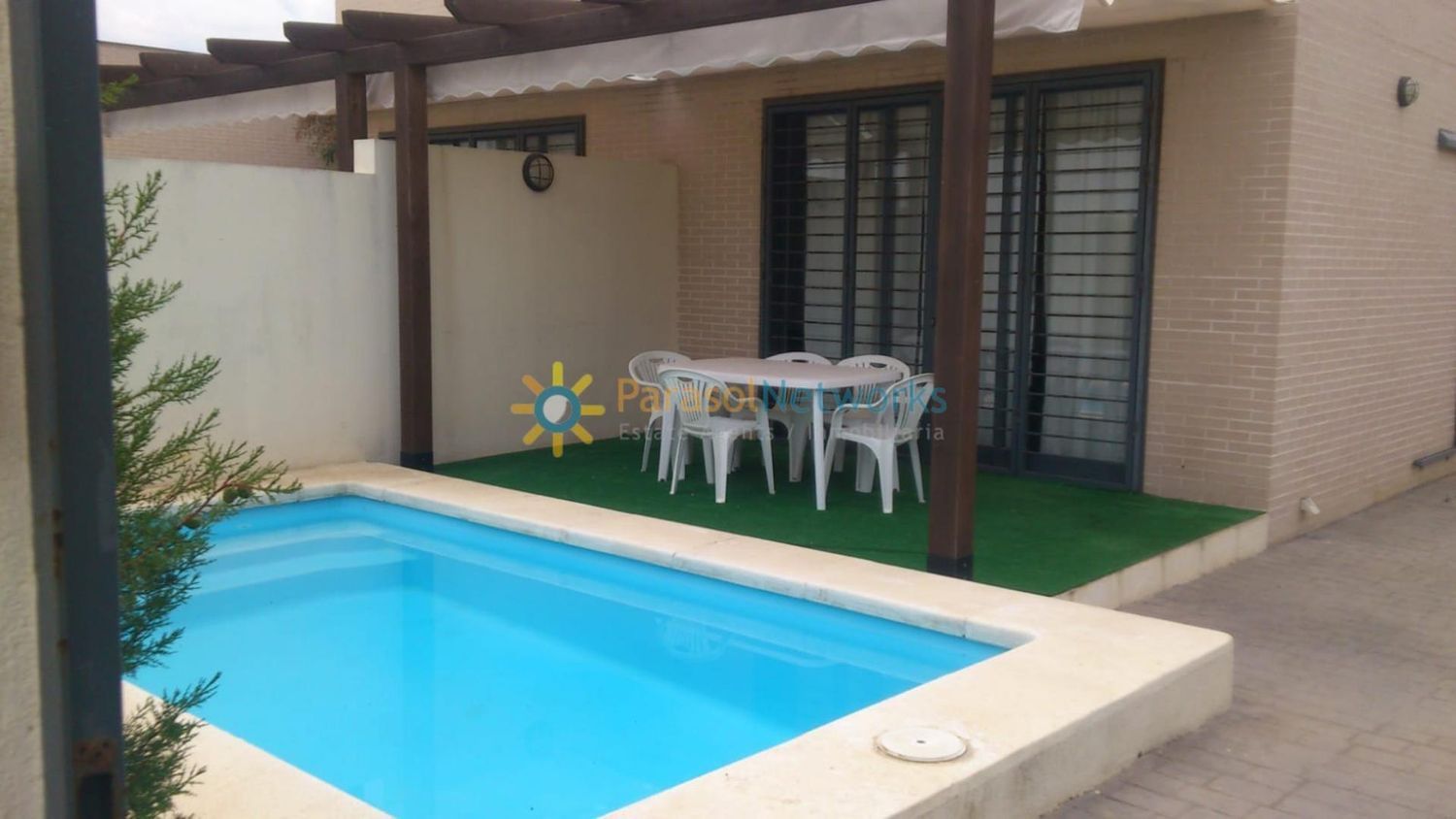 Alquiler de septiembre a mayoA 200 metros del mar se encuentra este bonito adosado de 250 m2 de parcela con una construcción de unos 85 m2 distribuidos en dos habitaciones, salón comedor con cocina office, un baño, terraza, piscina privada y parking. Tiene aire acondicionado.