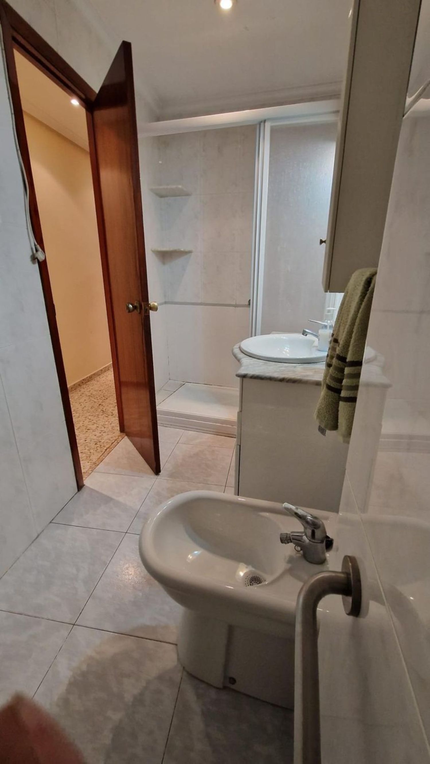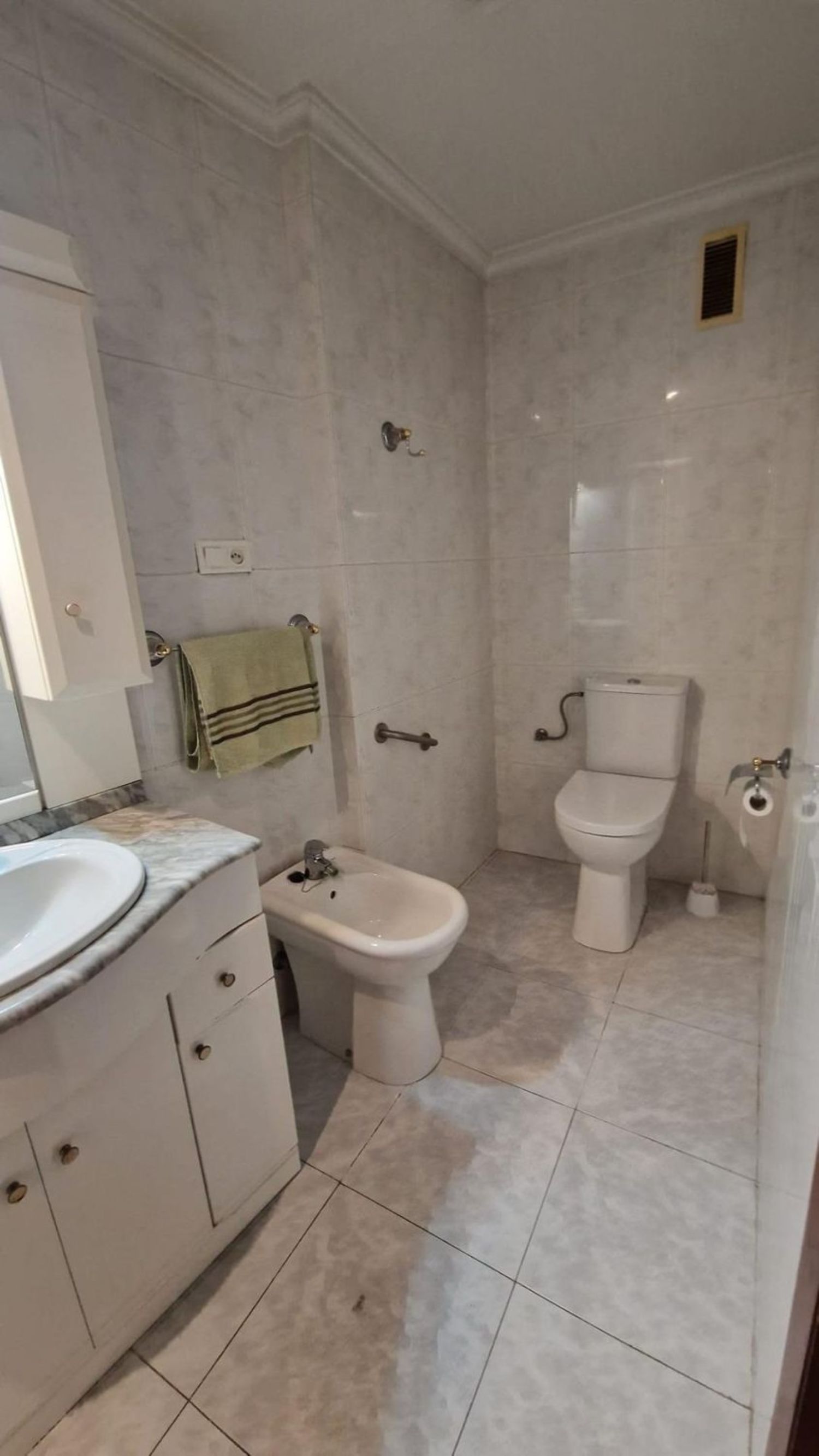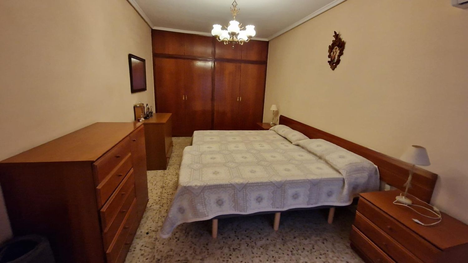 Piso de 133m3 distribuido en: Recibidor con puerta principal de seguridad, video-portero. Salón-comedor con balcón de aprox. 4m2, con reja y mosquitera, orientado al sur, muy luminoso y soleado. Suelo de terrazo claro, puertas de paso de madera, ventanas de aluminio. Paredes lisas.4 habitaciones, 2 sencillas y dos dobles. Una de las sencillas da a la calle, junto al salón, y una de las habitaciones dobles tiene armario empotrado. En el pasillo hay dos pequeños armarios trasteros y una alacena, así como otro trastero algo más grande, de unos 3m2. 2 baños completos, los dos con ducha con mampara, uno de ellos también con bidé; ambos con lavabo con mueble encastrado. La cocina, con muebles altos y bajos de madera, bancada de mármol, encimera, fregadero de doble seno de mármol con grifo monomando. Galería con calentador de gas ciudad, y lavadero, con acceso a una terraza de aprox. 8m2. Se trata de un primer piso con ascensor(con rampa de acceso) en finca muy céntrica, con todo tipo de servicios muy a mano. A 1 min, de la calle Mayor, del Centro de Salud, de comercios, bancos, colegios, etc. A 5 min de metro. (posibilidad de local de para guardar varios coches justo debajo).La vivienda está perfectamente habitable. Luz y agua.