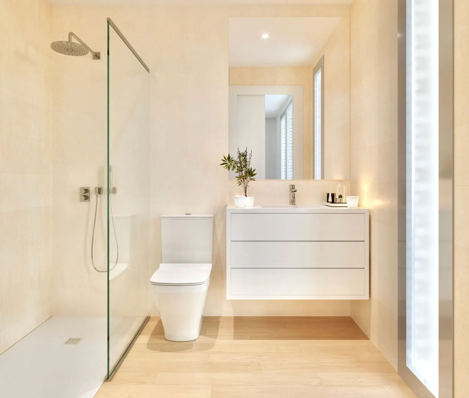 High-quality porcelain flooring runs throughout each home, adding a touch of elegance and modernity. The kitchens are fully equipped with an induction hob, built-in microwave-oven, and decorative hood, paired with durable countertops and functional furnishings that harmonize design and endurance. Elegant bathrooms feature shower trays, chrome single-lever taps, mirrors, and functional furniture to cater to daily needs.