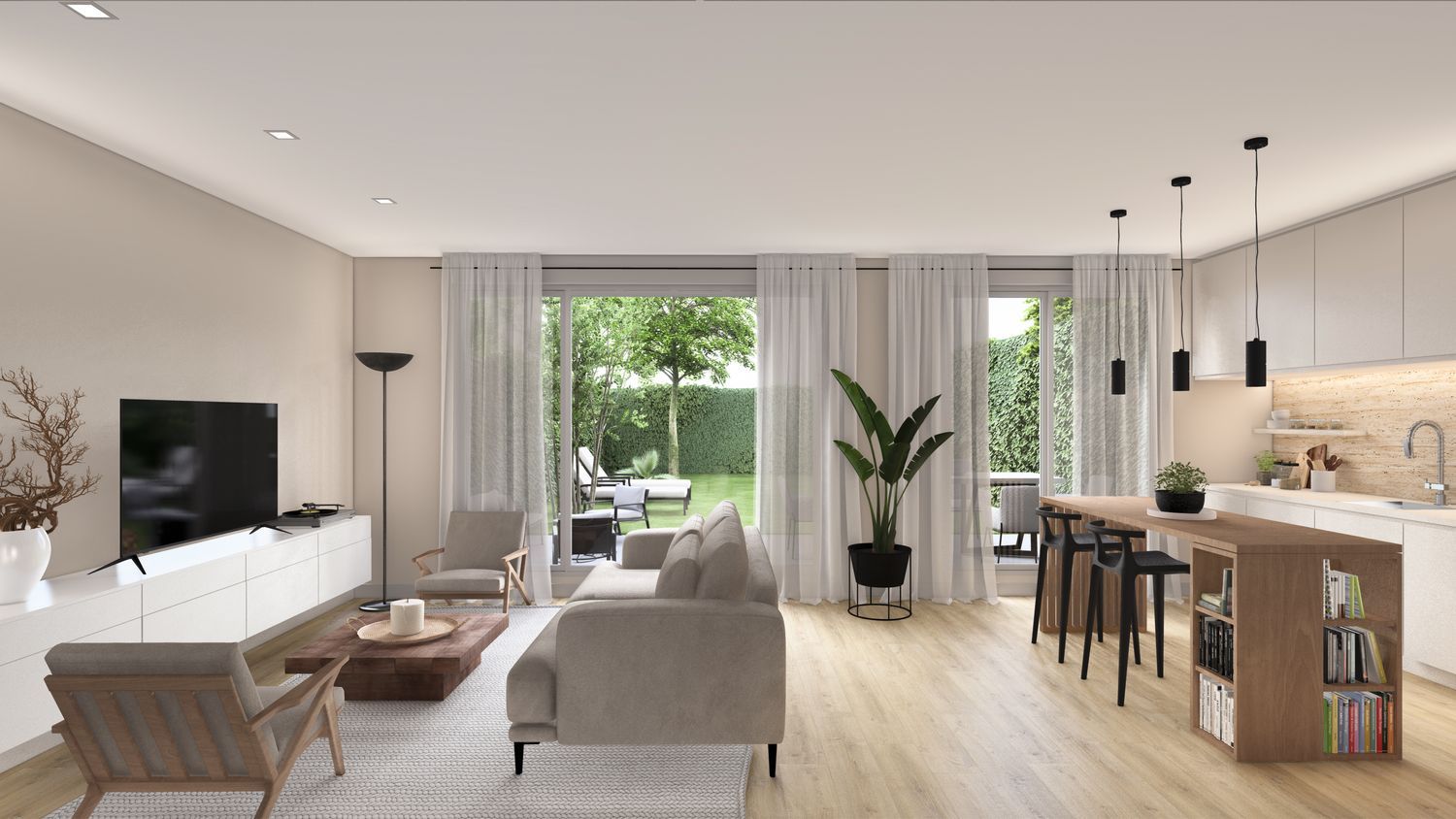 The "Catamaran" semi-detached homes offer an unparalleled living experience on a single floor, prioritizing comfort with a carefully organized layout. The day zone features a seamless open-plan area with a living, dining, and kitchen space spanning an impressive 57 square meters. This area is complemented by a laundry room and a guest bathroom. The night zone includes four magnificent bedrooms and two bathrooms, with one providing direct access from the master bedroom. These 18 homes are fashioned with a remarkable double-A energy efficiency rating, for both emissions and consumption. This is achieved through an innovative aerothermal system for heating and hot water, ensuring reduced utility costs and minimal environmental impact.