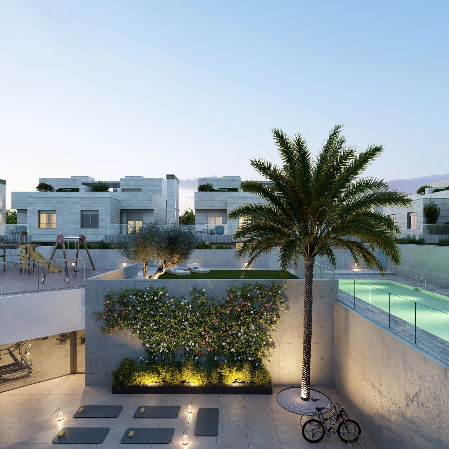 The garden, with its outdoor barbecue, is the perfect place to relish sunny days and dinners under the stars. Every corner of this villa is crafted for you and your loved ones to enjoy unique moments, creating the life you've always dreamed of. Within the complex, you’ll share amenities like an outdoor pool, a children’s play area, and a Technogym-equipped fitness center.