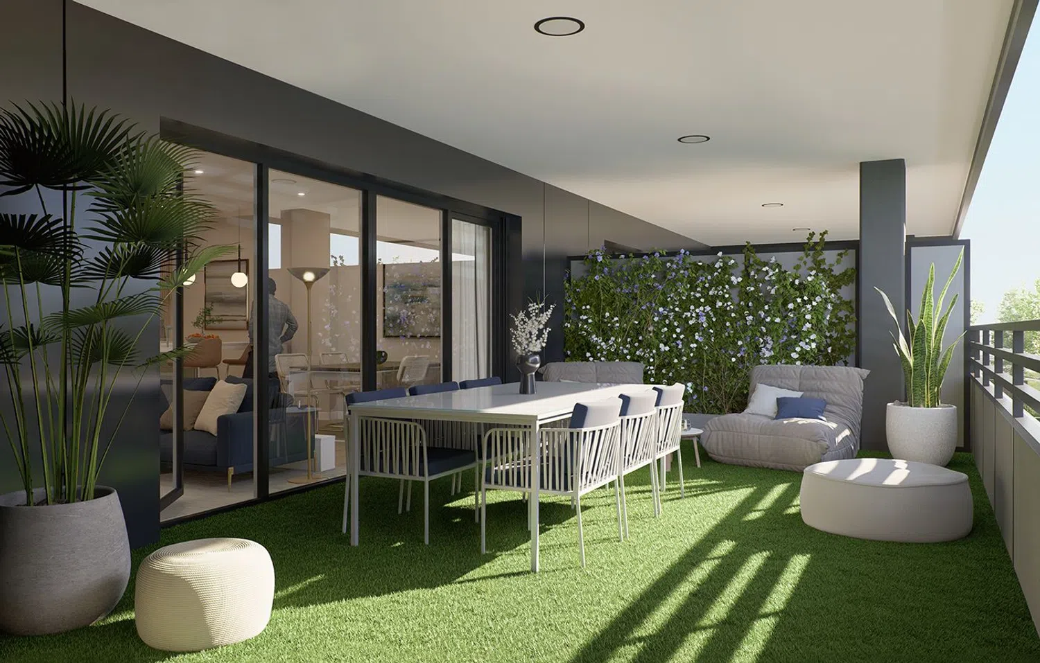Architecturally, each residence is crafted with detailed precision. Expansive windows in living areas optimize natural daylight, creating a vibrant ambiance. Additionally, the terraces, many exceeding 20 m² with artificial grass, present a unique and cozy outdoor environment.