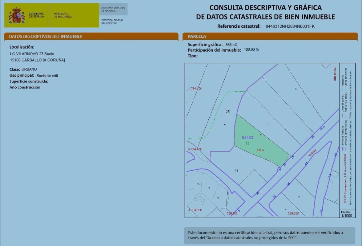 A 4Km y 6 minutos en coche del centro de Carballo, en la parroquia de Berdillo, se encuentra este terreno urbanizable de 868m2 de superficie. El lugar cuenta con todos los servicios: Alcantarillado, agua, luz, aceras, alumbrado, autobús de línea etc. Plántale tu casita encima por 35.000€.