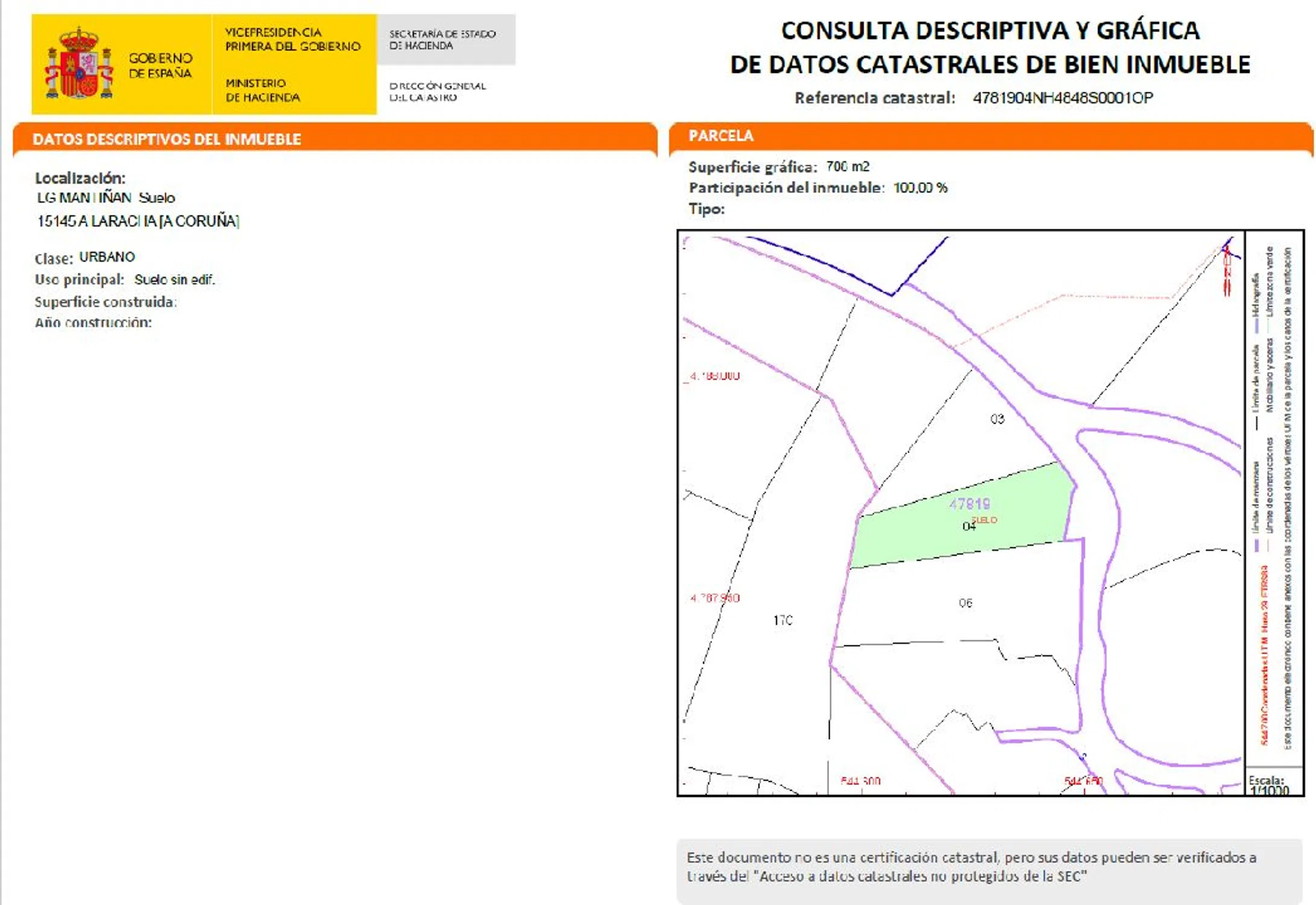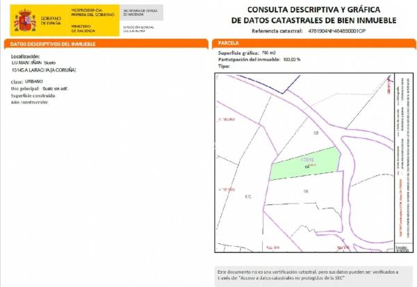 Entrando en nuestra página web podrás ver la ficha técnica con todos los datos del inmueble y un plano de distribución con los metros cuadrados de cada estancia. También podrás almacenar una búsqueda y recibirás cada semana en tu email los inmuebles que se adapten a tus criterios. LUGAR MANTIÑÁN (LARACHA). - Se VENDE solar urbano en Lugar de Mantiñán (A Laracha), ubicado cerca del Polígono de Ledoño y a 12 minutos de A Coruña por la Tercera Ronda. Se puede construir una vivienda unifamiliar, y tiene una superficie de 708 m² con orientación Oeste. Está rodeado por varias viviendas unifamiliares de dos alturas. Nuestros asesores inmobiliarios están especializados por zonas para poder darle el mejor servicio y que el inmueble que usted compre esté a un precio de mercado adecuado. Además verificamos todos los datos de los inmuebles (metros, antigüedad, calidades, etc. ) y con cada visita le entregamos una ficha (con todas las características, un plano, información de la zona y los gastos adicionales al precio de compra). Horario de 10.00 a 14.00 y de 16.00 a 20.00 de lunes a viernes. Este anuncio no es vinculante (puede contener errores). Se muestra a título informativo y no contractual.