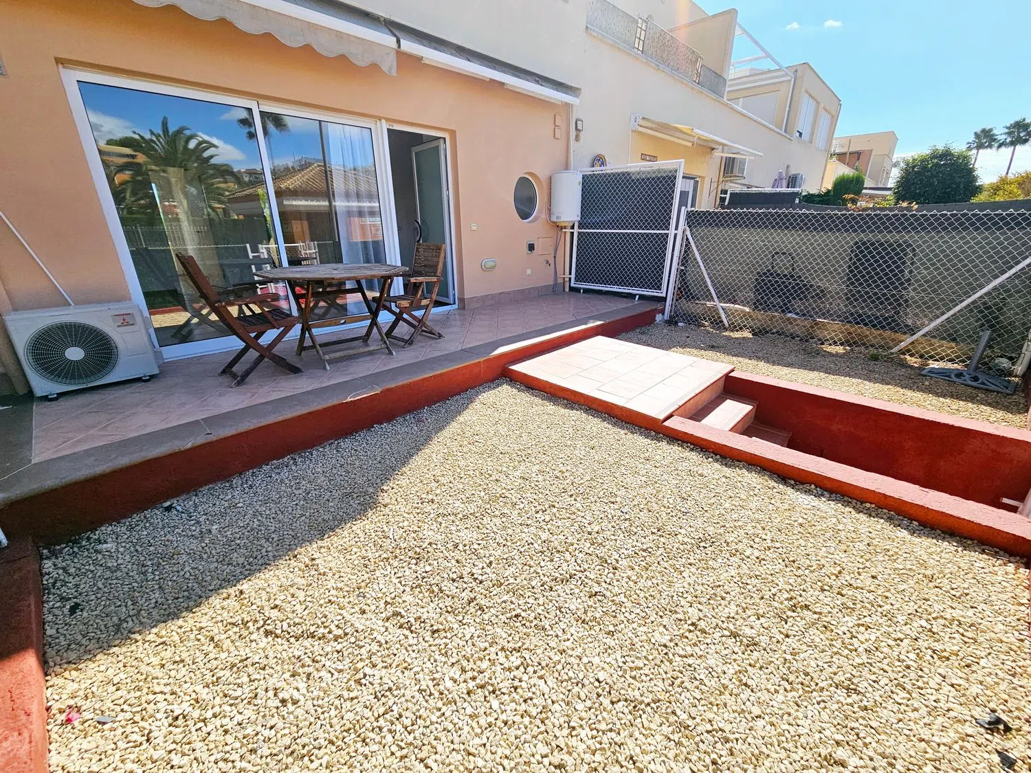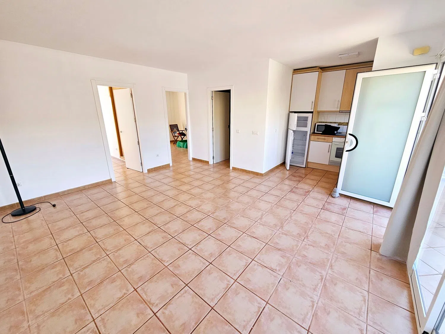 La vivienda está distribuida en una sola planta y consta de un amplio salón-comedor que se abre a una terraza delantera generosa. La cocina, integrada con el salón, puede separarse con facilidad si se desea. Incluye también dos cómodos dormitorios y un baño completamente equipado. En la parte trasera, se disfruta de otra terraza de tamaño similar, accesible directamente desde ambos dormitorios.