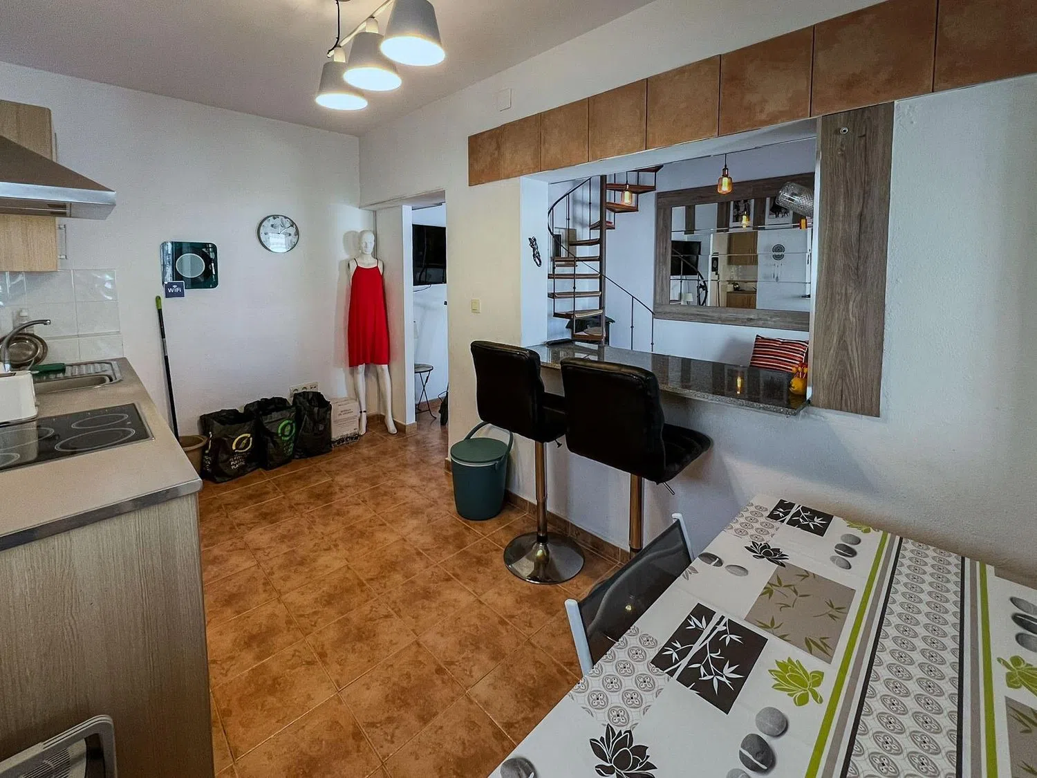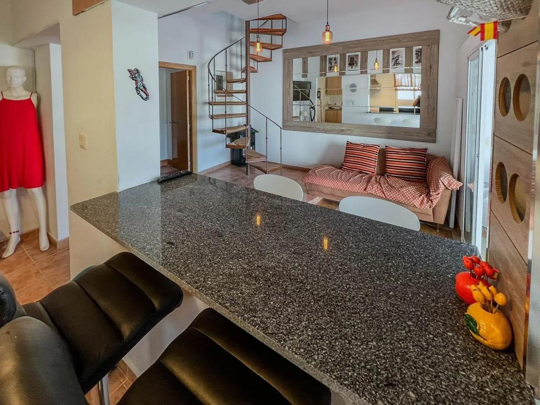 En la planta baja, encontrarás una cocina independiente, un salón acogedor y un dormitorio con baño en suite que incluye ducha. La primera planta cuenta con un amplio salón, el cual puede ser reajustado para recuperar un tercer dormitorio, además de otra cocina independiente, un dormitorio con armario empotrado y un cuarto de baño. Ambas plantas están conectadas por una escalera interna, y desde la primera planta, podrás acceder al solárium a través de una escalera exterior, convirtiéndolo en el lugar ideal para tomar el sol o disfrutar de momentos agradables con amigos y familiares.