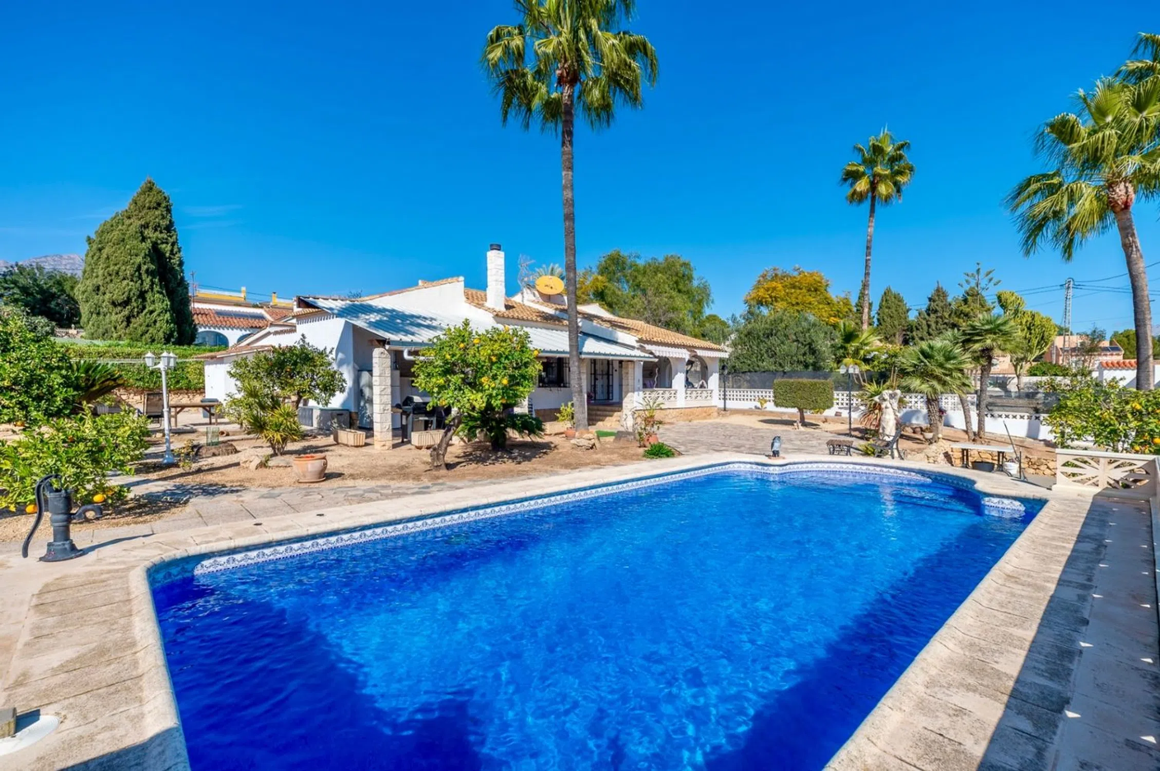 Esta hermosa villa, situada en la tranquila zona de Alfaz del Pi, se ofrece a la venta por 450.000 €. Ubicada en una amplia parcela de 1.200 m², la villa cuenta con 220 m² de espacio habitable en una sola planta. Incluye 5 dormitorios, 2 baños y 2 aseos adicionales, lo que proporciona un amplio espacio para la vida familiar. La propiedad está equipada con calefacción eléctrica, lo que garantiza el confort durante todo el año, y dispone de aparcamiento para 3 o 4 coches. El gran jardín que rodea la villa proporciona un ambiente privado y tranquilo, mientras que la orientación sureste permite mucha luz natural durante todo el día. Disfrute de impresionantes vistas a la montaña desde la gran piscina y el área al aire libre de la propiedad, perfecta para relajarse o entretener a los invitados. La villa también incluye una casa de huéspedes, que ofrece espacio adicional para visitantes o familiares. En cuanto a la ubicación, la villa está a solo 15 minutos en coche de la animada ciudad de Benidorm, conocida por sus playas y entretenimiento. El aeropuerto de Alicante se encuentra a 45 minutos en coche y ofrece fácil acceso a vuelos nacionales e internacionales. Valencia está a aproximadamente 1 hora y 45 minutos en coche, y ofrece una amplia gama de atracciones culturales y servicios. Esta villa ofrece la combinación ideal de privacidad, comodidad y conveniencia, lo que la convierte en una opción perfecta para aquellos que buscan un retiro tranquilo sin dejar de estar cerca de las ciudades clave. Póngase en contacto con nosotros para obtener más detalles o para concertar una visita.