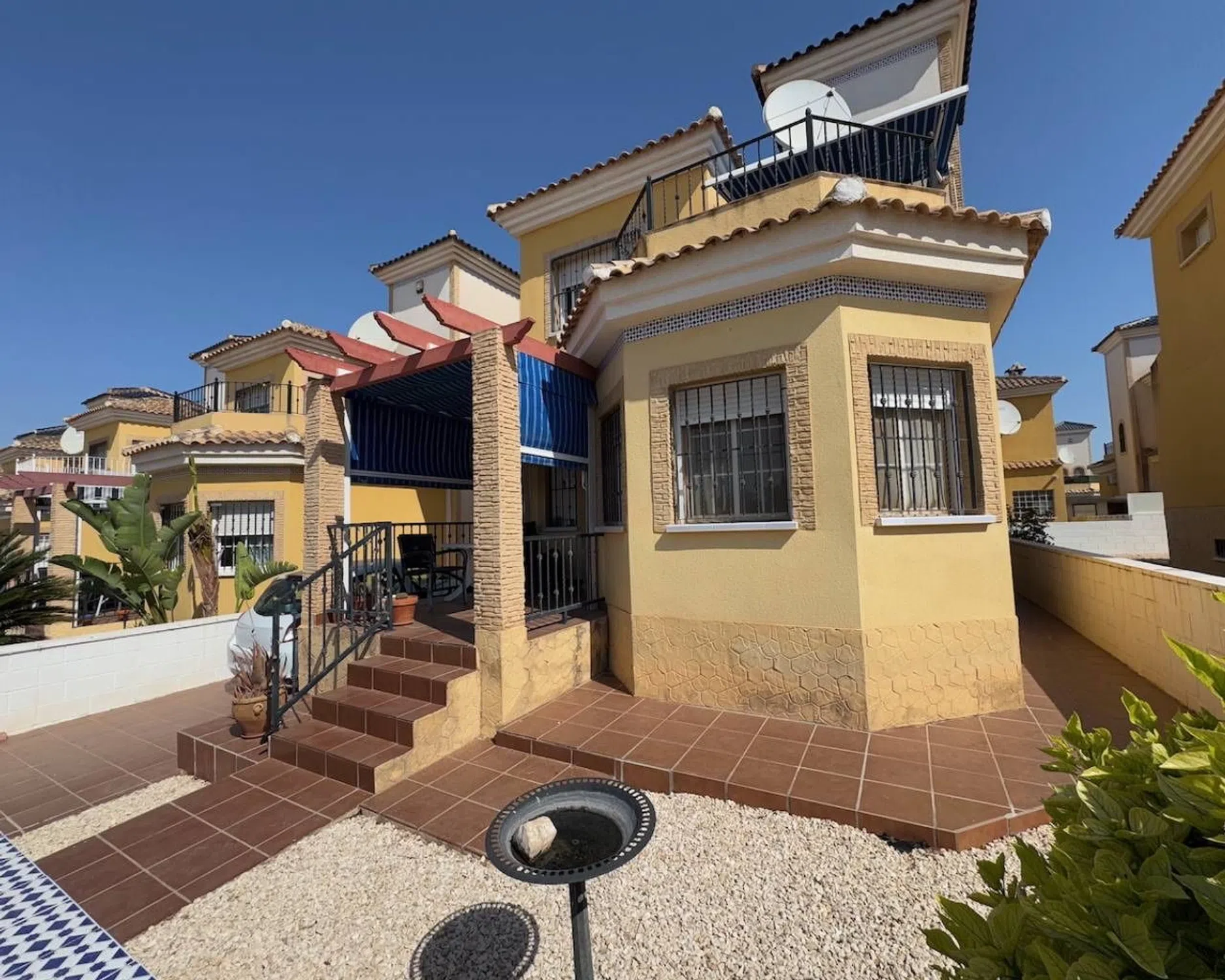 Esta villa de 3 dormitorios y 2 baños, bellamente mantenida, construida en 2005, se encuentra en una parcela de 200 m² y ofrece una combinación perfecta de comodidad, privacidad y conveniencia. Con orientación ideal hacia el este, la casa disfruta de abundante luz natural durante todo el día y se presenta en excelentes condiciones. La propiedad cuenta con una cocina independiente totalmente equipada con electrodomésticos, así como un lavadero para mayor practicidad. Los tres dormitorios cuentan con armarios empotrados, y la casa se beneficia de aire acondicionado y ventiladores de techo para garantizar la comodidad durante todo el año. Ofrecida completamente amueblada, la villa cuenta con una amplia terraza privada, vistas al jardín y tanto una piscina privada como acceso a una piscina comunitaria. El aparcamiento privado fuera de la carretera y una entrada segura con puerta brindan tranquilidad, mientras que la sala de estar de planta abierta crea un espacio acogedor y funcional para familiares e invitados por igual. Ubicada a pocos pasos de los servicios locales y con fácil acceso a la playa (15 minutos), al aeropuerto (30 minutos) y a los campos de golf (10 minutos), esta propiedad es perfecta como residencia permanente, casa de vacaciones o inversión de alquiler.