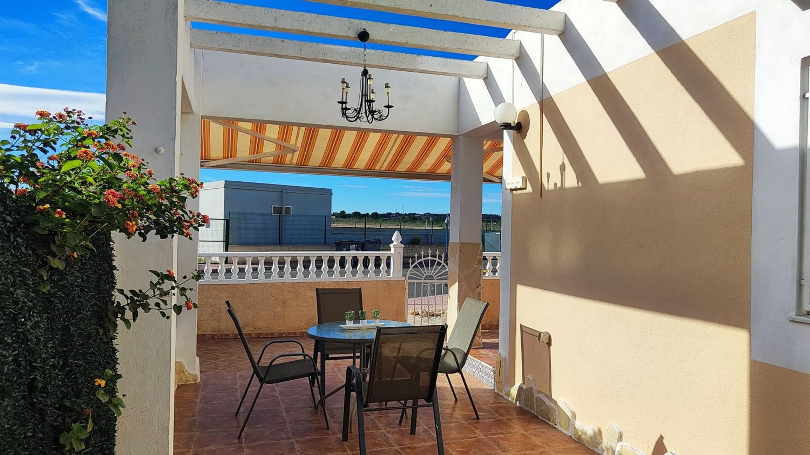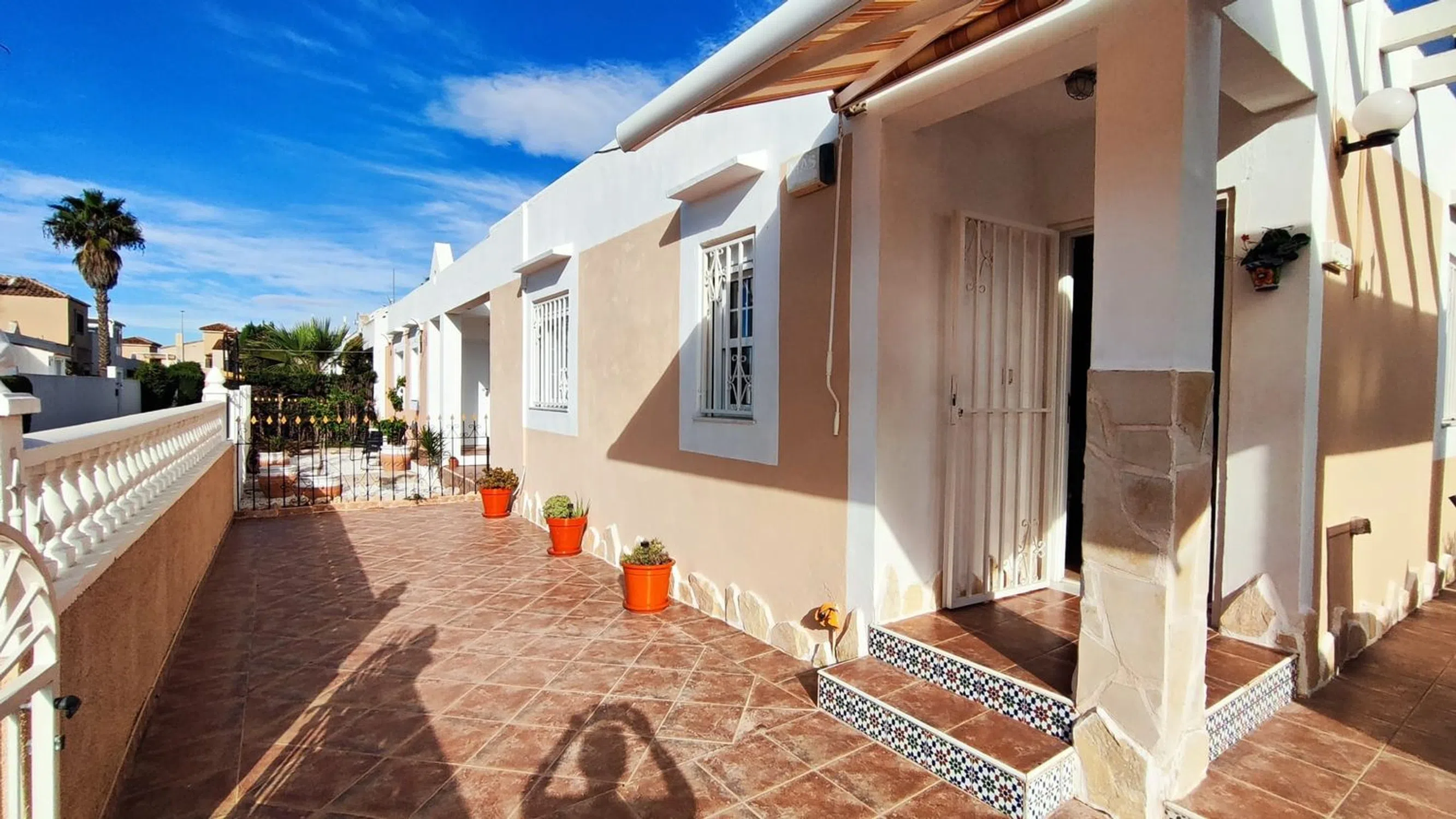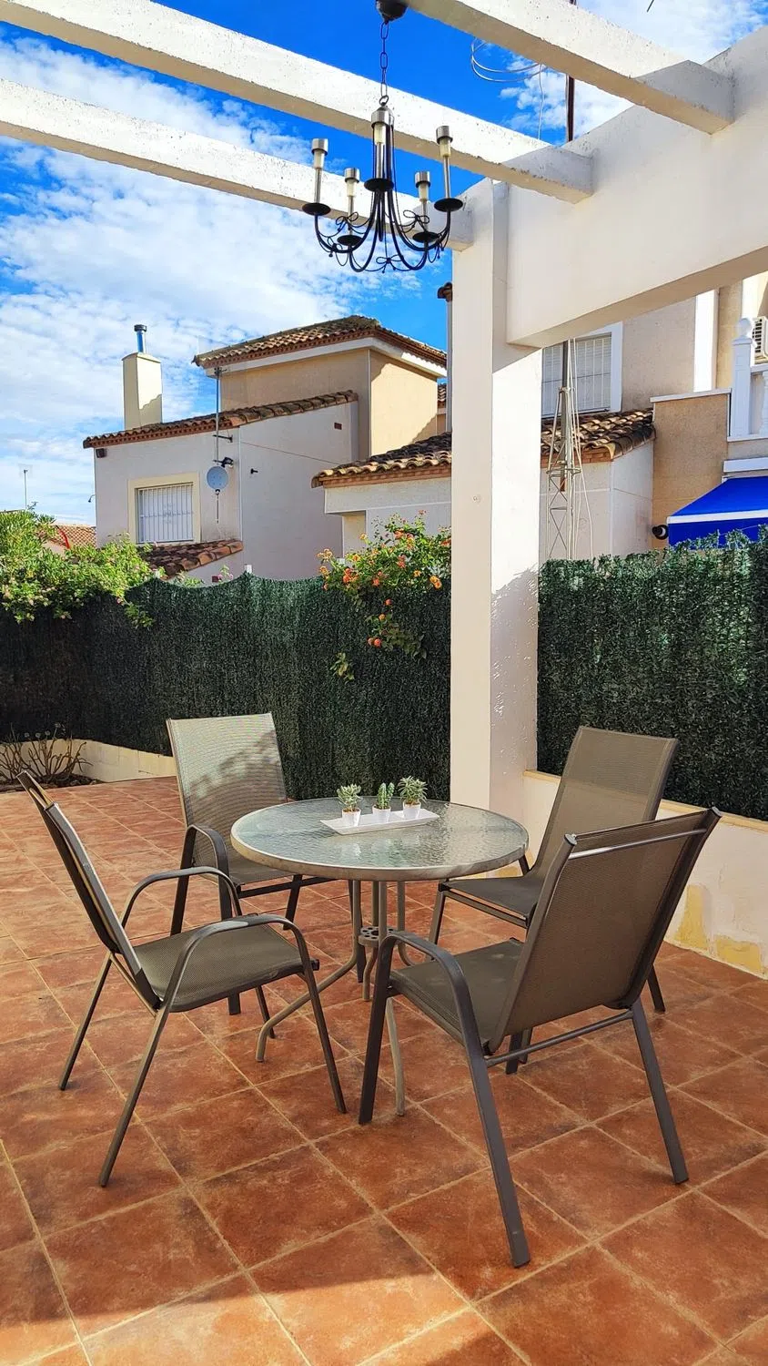 Esta villa adosada es una fantástica alternativa a un apartamento, con un espacio habitable similar pero con la ventaja de no tener paredes contiguas y una gran parcela de 152m2 orientada al sur, perfecta para la vida al aire libre española. La propiedad se encuentra en la urbanización de Montebello, cerca de las principales conexiones de carreteras, con los pueblos de Algorfa, Benijofar y Ciudad Quesada a solo 5 minutos en coche. El mercado dominical del Zoco está a 10 minutos a pie y hay 2 bares/restaurantes locales en la urbanización. La villa tiene una vista abierta al campo, con estacionamiento en la calle directamente en frente. El área exterior está completamente alicatada en la parte delantera y lateral con un jardín de grava con 2 cobertizos de almacenamiento en la parte trasera. Hay un amplio espacio para cenar al aire libre bajo la pérgola lateral y tumbonas en el patio delantero. En el interior, la propiedad tiene un nuevo piso de baldosas moderno en todas partes y ha tenido una cocina de reemplazo moderna con unidades integradas. El baño también ha sido renovado con una ducha a ras de suelo y un moderno mueble de tocador. Ambos dormitorios son de gran tamaño, hay una habitación doble con armario independiente y cómoda, el dormitorio principal tiene una cama doble, 2 juegos de armarios y unidad de aire acondicionado. Todos los muebles están incluidos en el precio de venta. Esta propiedad no forma parte de la comunidad residencial, por lo tanto, no tiene cuotas de comunidad que pagar. El acceso a la piscina del hotel se paga por uso.