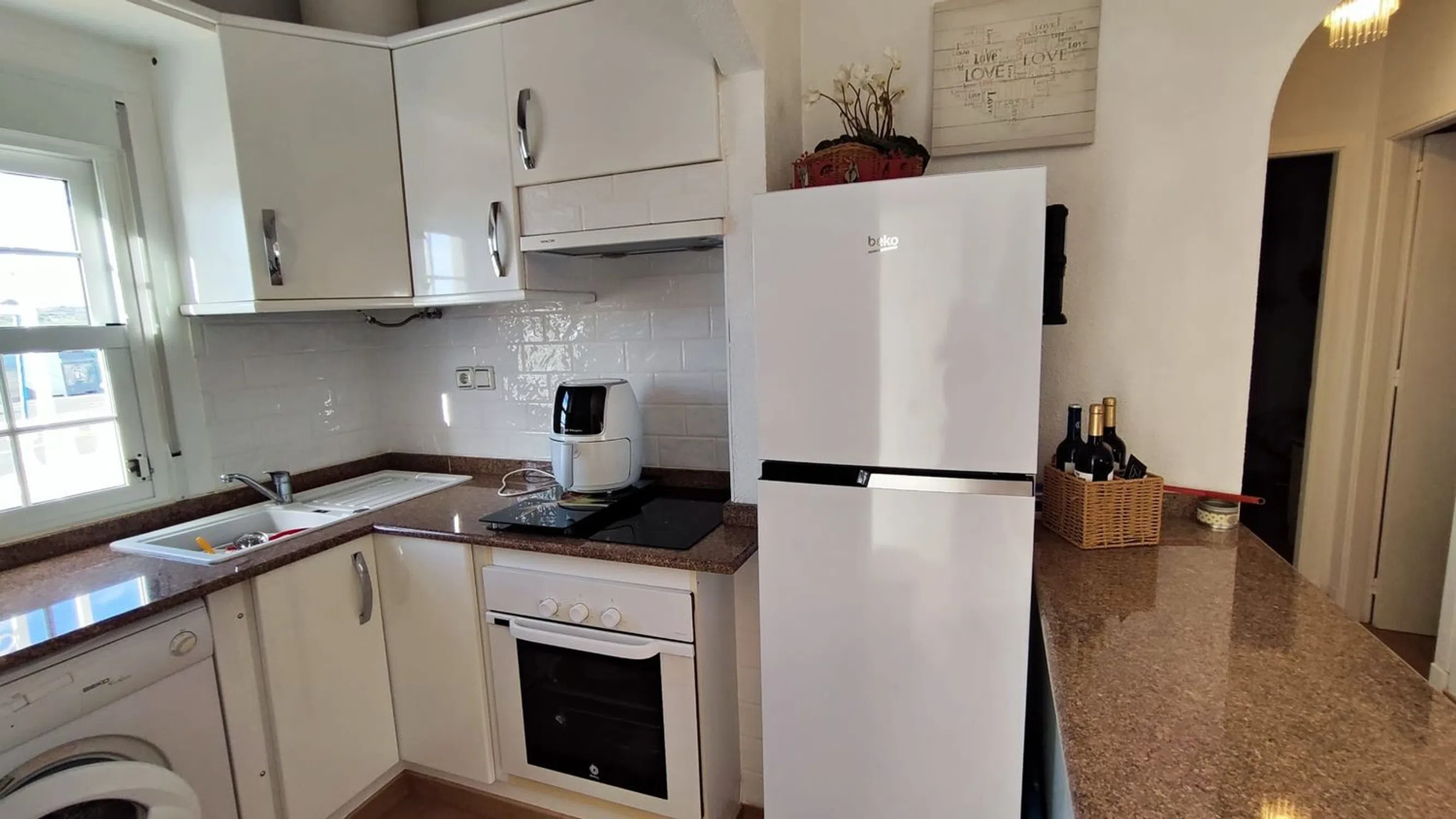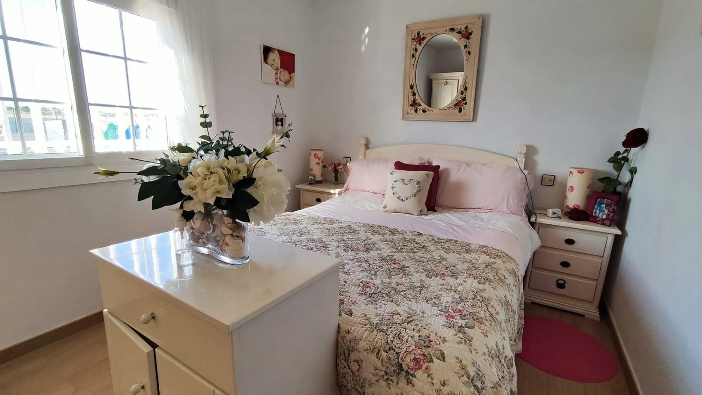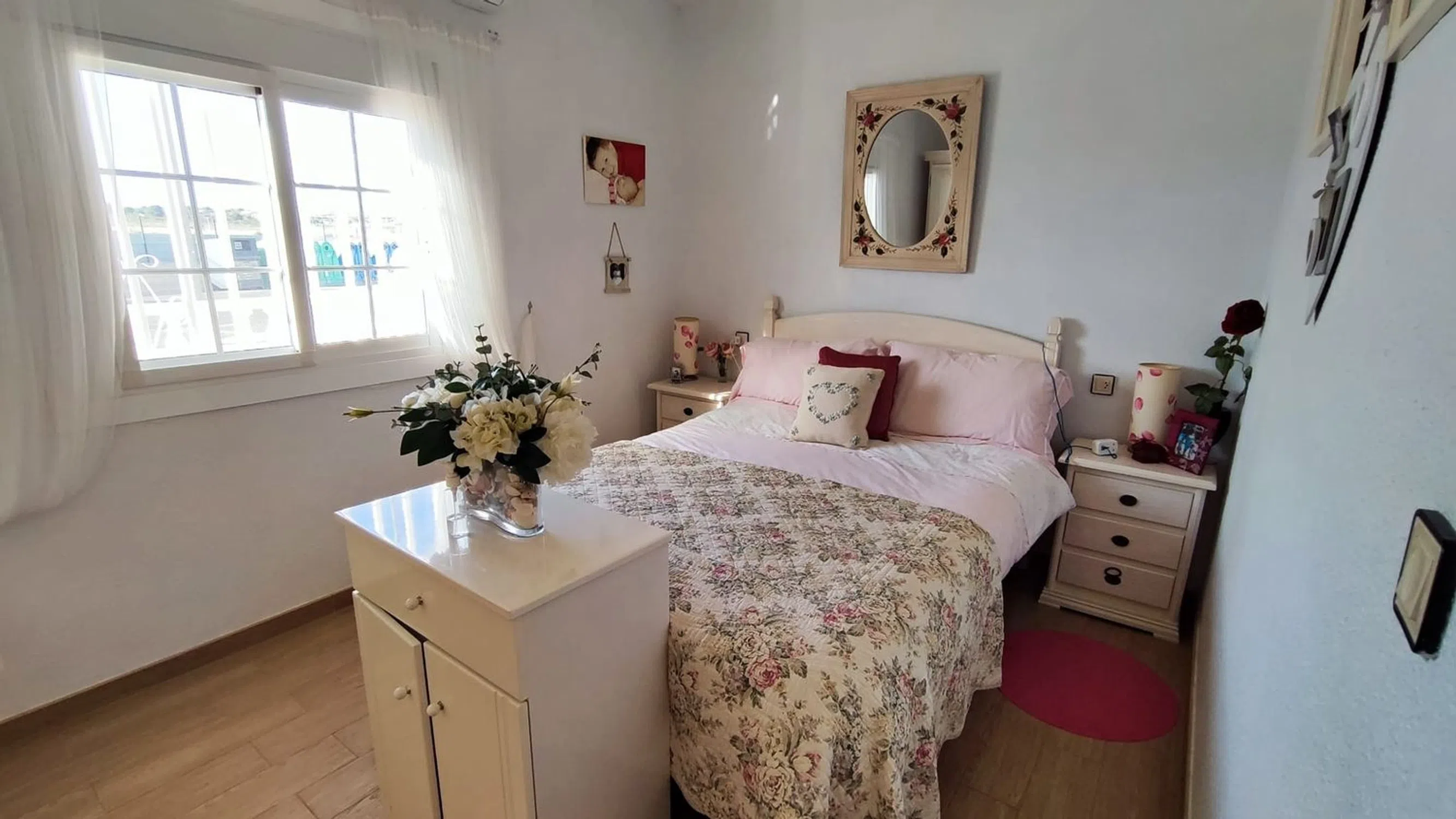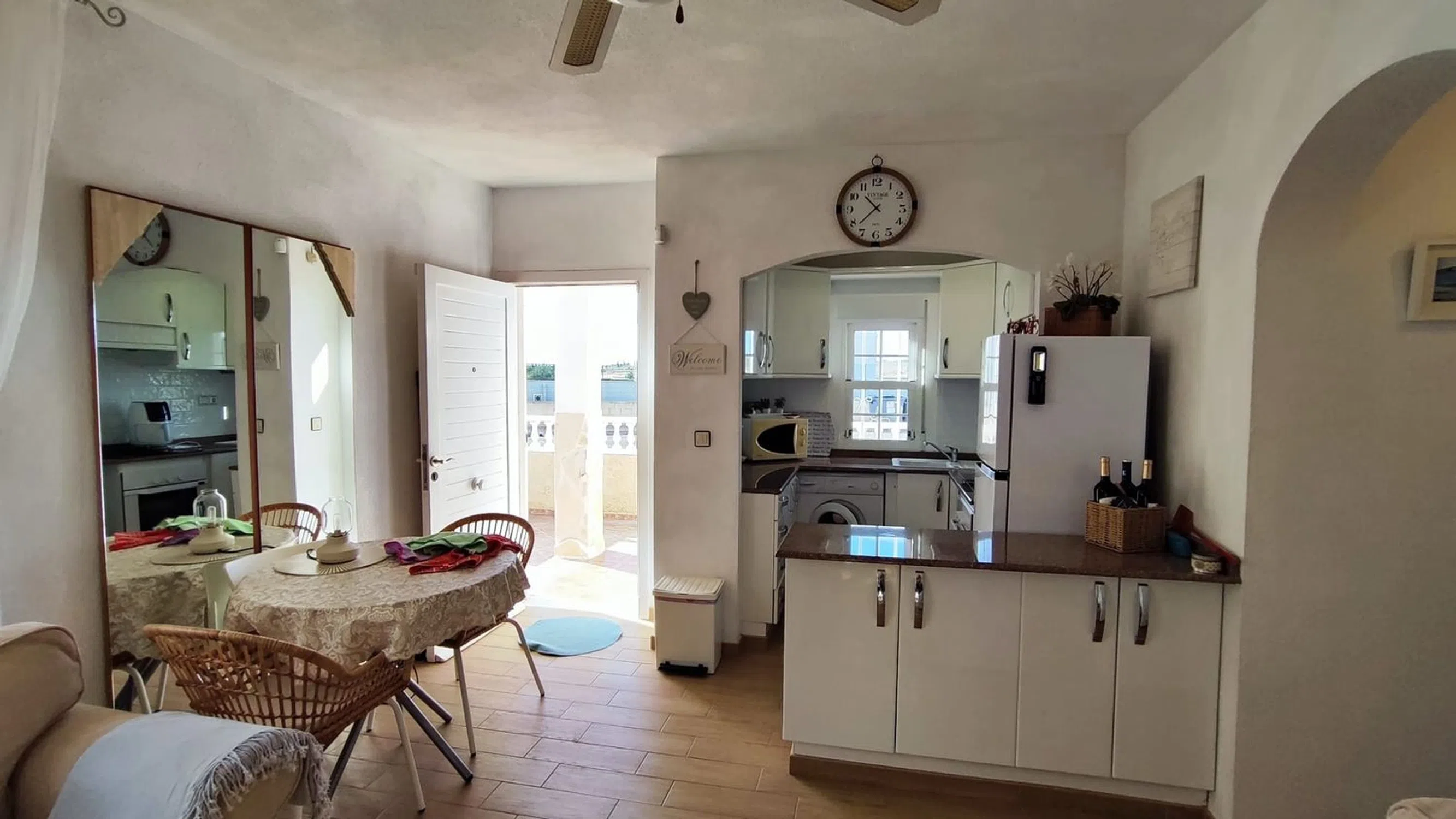 Esta villa adosada es una fantástica alternativa a un apartamento, con un espacio habitable similar pero con la ventaja de no tener paredes contiguas y una gran parcela de 152m2 orientada al sur, perfecta para la vida al aire libre española. La propiedad se encuentra en la urbanización de Montebello, cerca de las principales conexiones de carreteras, con los pueblos de Algorfa, Benijofar y Ciudad Quesada a solo 5 minutos en coche. El mercado dominical del Zoco está a 10 minutos a pie y hay 2 bares/restaurantes locales en la urbanización. La villa tiene una vista abierta al campo, con estacionamiento en la calle directamente en frente. El área exterior está completamente alicatada en la parte delantera y lateral con un jardín de grava con 2 cobertizos de almacenamiento en la parte trasera. Hay un amplio espacio para cenar al aire libre bajo la pérgola lateral y tumbonas en el patio delantero. En el interior, la propiedad tiene un nuevo piso de baldosas moderno en todas partes y ha tenido una cocina de reemplazo moderna con unidades integradas. El baño también ha sido renovado con una ducha a ras de suelo y un moderno mueble de tocador. Ambos dormitorios son de gran tamaño, hay una habitación doble con armario independiente y cómoda, el dormitorio principal tiene una cama doble, 2 juegos de armarios y unidad de aire acondicionado. Todos los muebles están incluidos en el precio de venta. Esta propiedad no forma parte de la comunidad residencial, por lo tanto, no tiene cuotas de comunidad que pagar. El acceso a la piscina del hotel se paga por uso.