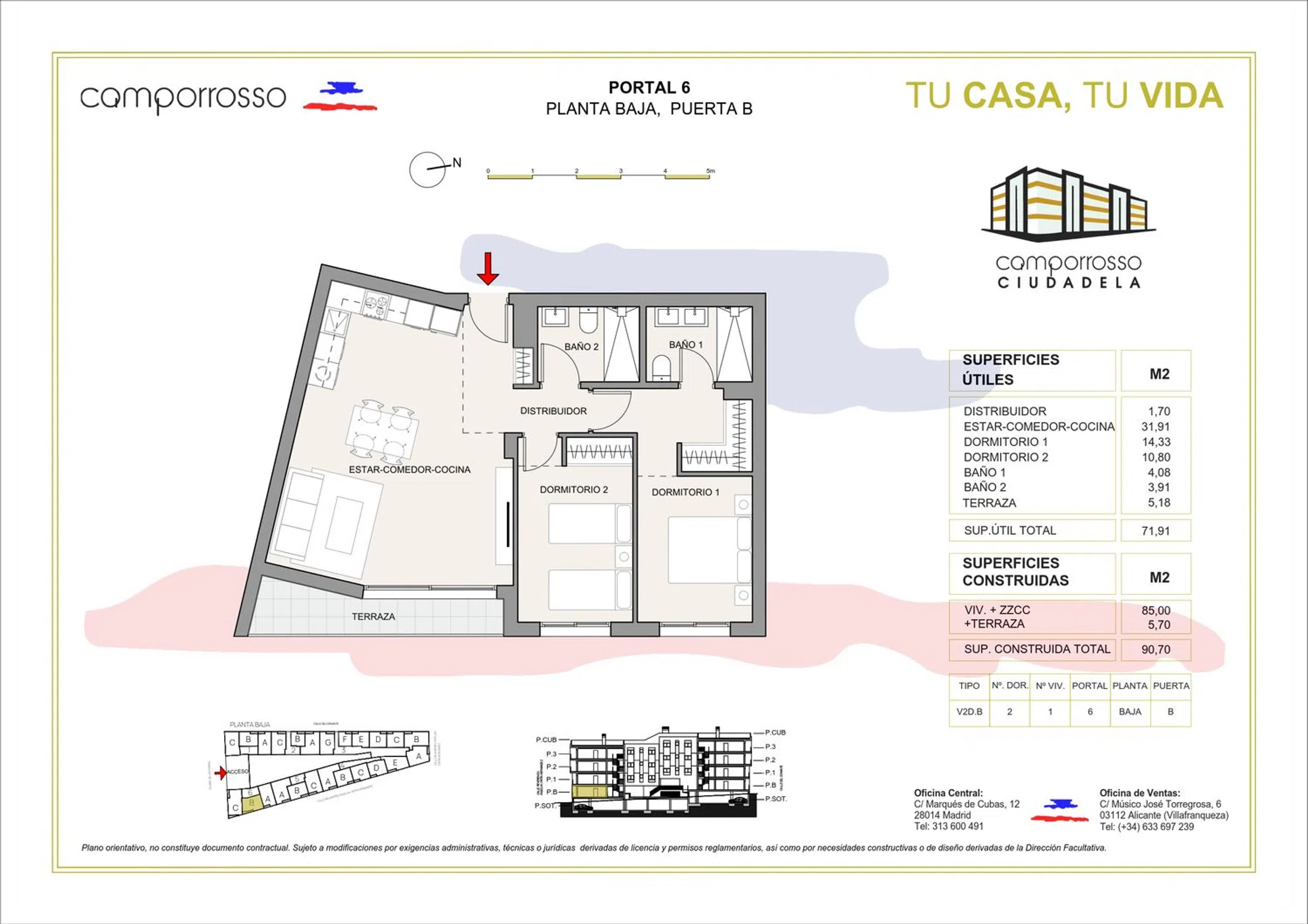Camporrosso Ciudadela es un conjunto residencial moderno y perfectamente concebido para quienes buscan calidad, comodidad y un estilo de vida tranquilo sin renunciar a la cercanía de la ciudad. La promoción está formada por 102 viviendas de 1, 2 y 3 dormitorios, diseñadas con una distribución funcional, terrazas y una excelente orientación que garantiza espacios luminosos y cálidos durante todo el año. Todas las viviendas incluyen plaza de parking y trastero. Ubicado en Villafranqueza, uno de los núcleos más consolidados y con mayor proyección del entorno de Alicante, el conjunto disfruta de una situación privilegiada: a escasos minutos de la Universidad de Alicante y con un acceso rápido y directo a las principales vías de comunicación, como la A-70 y la A-77. Esta conectividad permite desplazarse en pocos minutos al centro de la ciudad, a centros comerciales, servicios esenciales, colegios, instalaciones deportivas y transporte público. La zona destaca por su tranquilidad, su ambiente familiar y su equilibrio perfecto entre vida urbana y serenidad residencial. La arquitectura del proyecto combina líneas contemporáneas con materiales de calidad que aportan elegancia, durabilidad y una estética actual. Los espacios comunes están cuidadosamente diseñados para crear entornos agradables y funcionales, entre los que destaca la espectacular piscina panorámica situada en la cubierta del edificio. Un espacio único donde disfrutar del sol, relajarse, admirar las vistas abiertas y compartir momentos inolvidables. Además, la promoción cuenta con zonas de estancia, áreas ajardinadas y accesos amplios que facilitan la movilidad y el confort. Un proyecto completo, bien comunicado y con un diseño contemporáneo, creado para disfrutar del auténtico estilo de vida mediterráneo. TU CASA, TU VIDA. Oficina de ventas abierta de lunes a viernes de 10:00 a 14:00h y de 15:00 a 18:00h, los sábados con cita previa. Situada a 150 m de la promoción: Calle Musico José Torregrosa nº6, 03112 Villafranqueza, Alicante.
