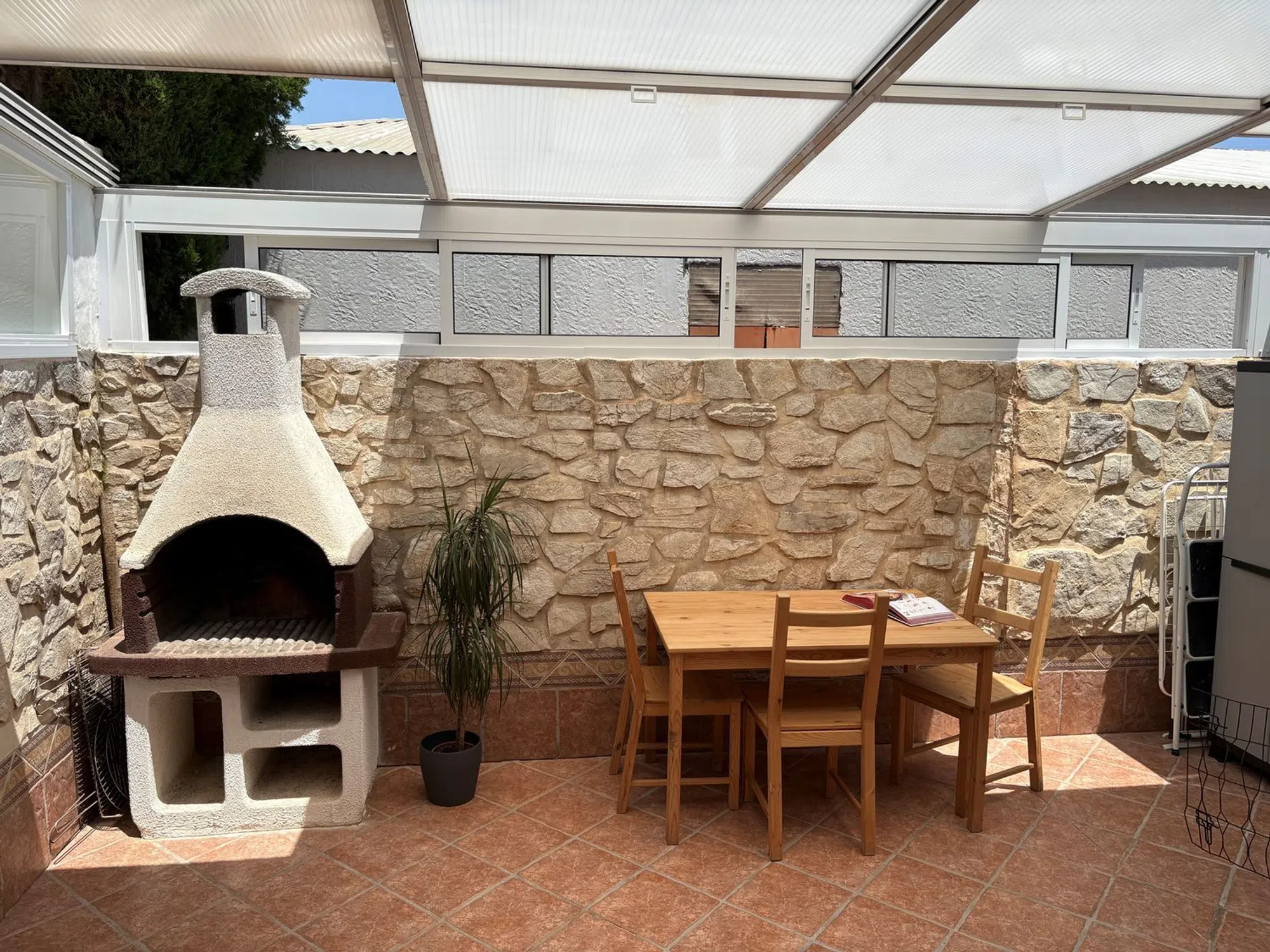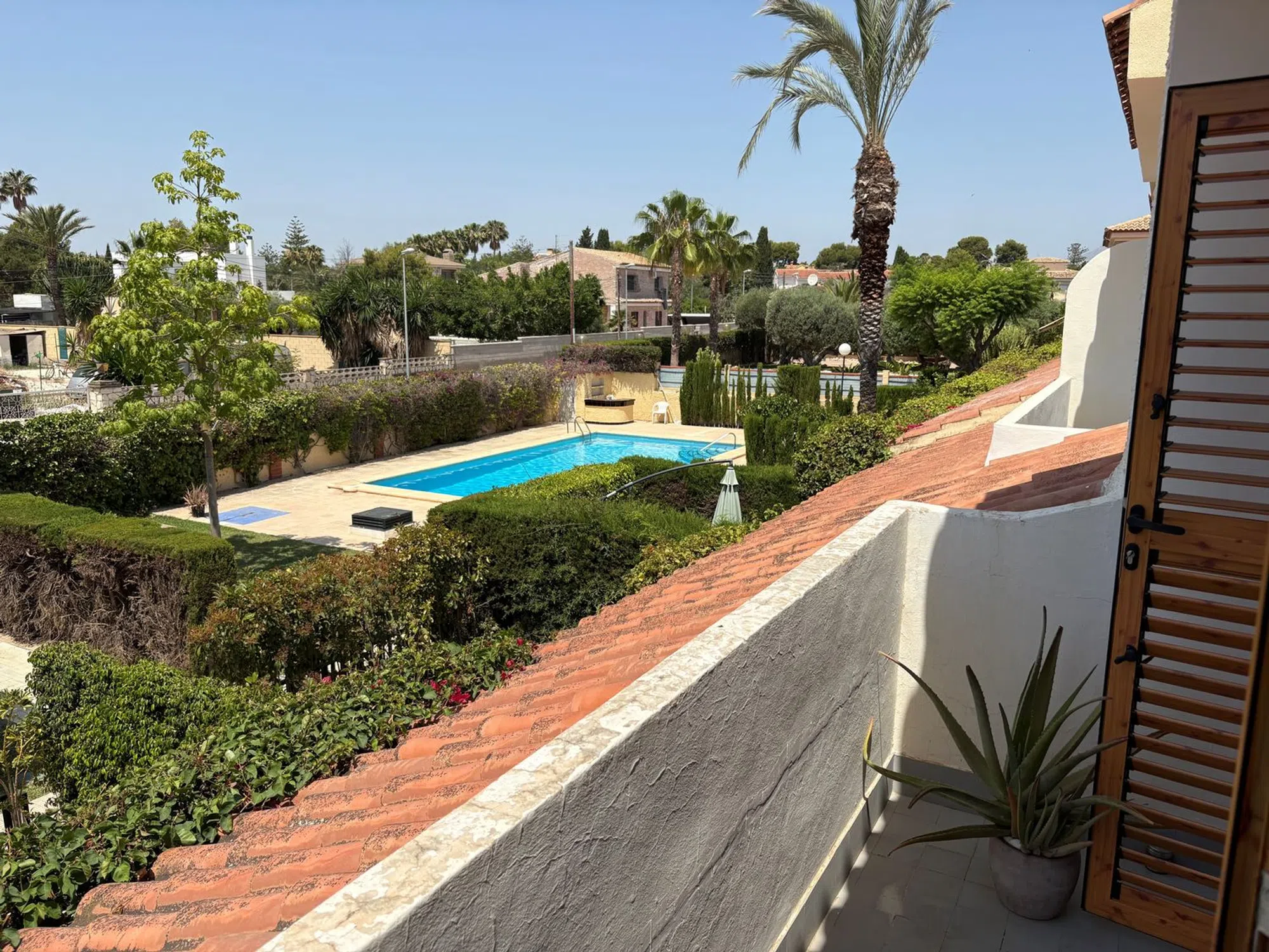 Acogedora casa en La Font-Mezquitas, una de las mejoras zonas, a pocos minutos de la hermosa y ancha playa de Muchavista. Ubicada muy tranquilo, pero también cerca de los supermercados, la Liceu Frances d’Alacant, las carreteras y la conexión de autobús. La ciudad de Alicante está a tan solo 20 minutos de la ciudad de Alicante y el centro de El Campello se llega en 5 minutos. La vivienda es parte de una bonita comunidad de 9 viviendas con jardín y grande piscina comunitaria. Diseño de la planta baja: Se entra la casa desde el jardín privado y la terraza. Primero se encuentra la acogedora sala de estar con chimenea de leña y aire acondicionado. Aquí hay un grande mueble aparador empotrado. Luego se encuentra la cocina semiabierta que está conectada al salón con una barra de comedor. La cocina está equipada con cocina de gas, extractor, horno/microondas y lavadora. Aquí se puede poner un lavavajillas. Detrás de la cocina hay un patio cubierto que ahora se utiliza como comedor. El techo del patio se puede abrir como quiera. Este espacio garantiza mucho privacidad. El baño aquí es completo con ducha, aseo y lavabo y un espejo con luz. La primera planta A través de la bonita escalera de piedra llega al segundo baño y a los dormitorios. El dormitorio principal tiene una calentador eléctrico y armarios empotrados. También se encuentra aquí un balcón con privacidad y mirador al jardín y la piscina. Luego se encuentra el segundo dormitorio, también con armarios empotrados. Y por último el segundo baño, también completo con ducha, aseo y lavabo. Este baño ha sido renovado completamente en 2024. Aparte del jardín privado se puede relajarse en el jardín compartido. En esta parte también se puede dejar que los niños jueguen. La parte donde está la piscina está cerrada con un seto y una pequeña verja que la hace menos accesible y más segura para los niños más pequeños. El jardín común y el jardín privado es mantenido por los jardineros. La vivienda incluye un garaje propio. Todos los servicios públicos están disponibles (agua, luz, gas, alcantarillado, teléfono/internet). Contáctame a través Idealista (preferiblemente) o por teléfono. No nos aceptamos intermediarios.