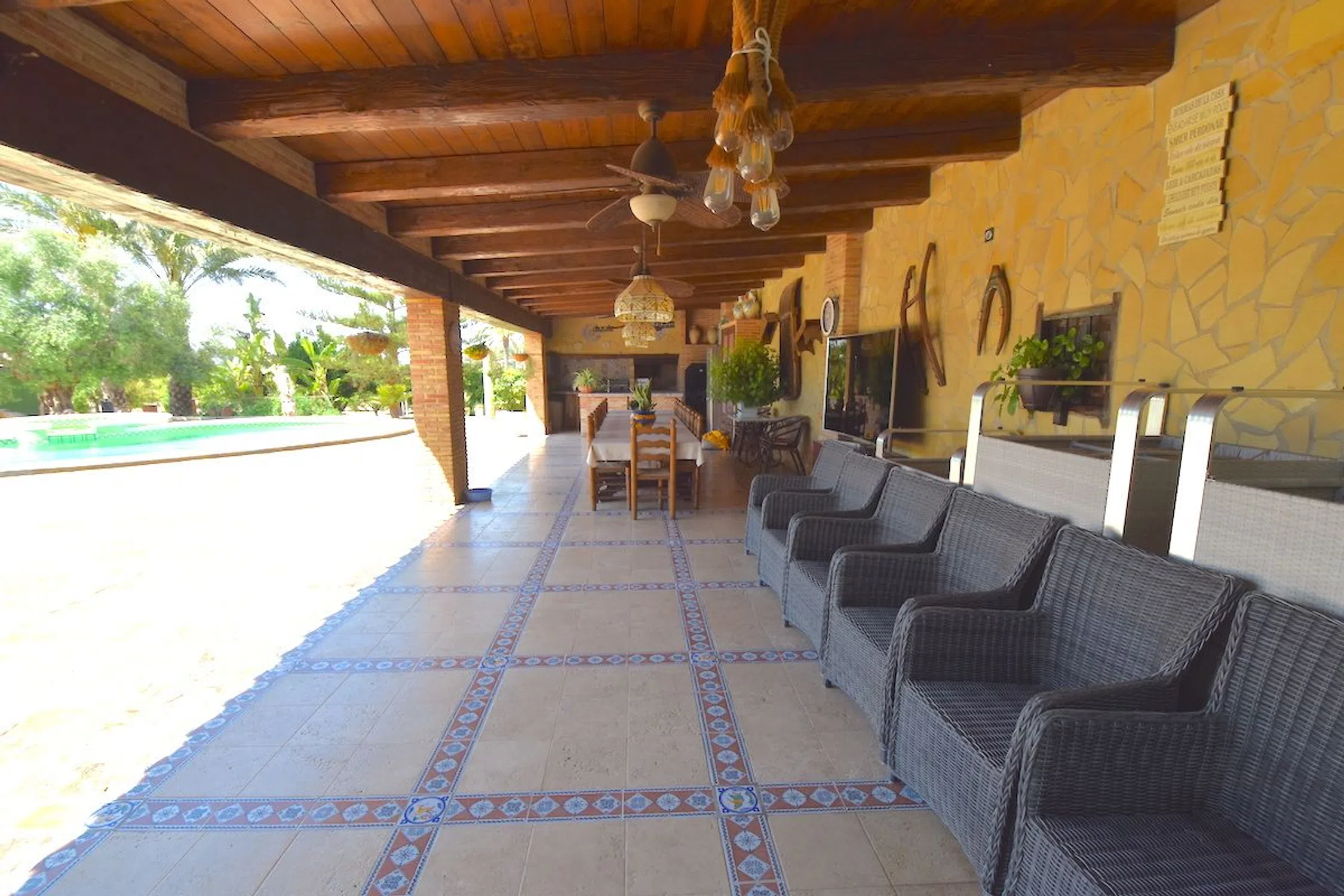 Situada en el pintoresco campo de Orihuela, rodeada de naranjos y limoneros, esta impresionante villa de 367 m² destaca por sus altos estándares de calidad. En la planta baja, ofrece una cocina de concepto abierto que se integra con un amplio salón, un baño de cortesía, tres dormitorios y dos baños completos. La planta superior alberga una lujosa suite principal con baño privado y vestidor. Además, la propiedad cuenta con instalaciones adicionales como una lavandería y un taller. El exterior es un verdadero oasis, con extensas terrazas, una cocina al aire libre equipada con zona de barbacoa y comedor para numerosos invitados. La propiedad se completa con una gran piscina y aparcamiento privado para tres vehículos. La mayor parte de los 7160 m² está destinada al cultivo de frutas como naranjas, limones, manzanas, nísperos y melocotones. La villa viene totalmente equipada con suelo radiante, aire acondicionado y placas solares, ofreciendo así un confort moderno y sostenible.