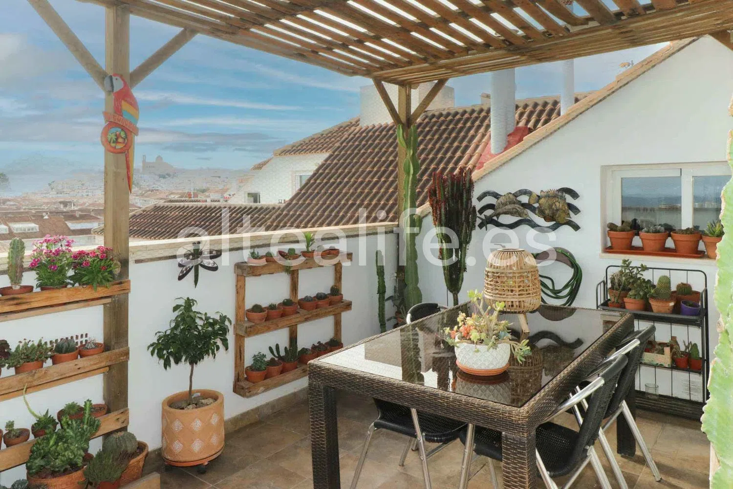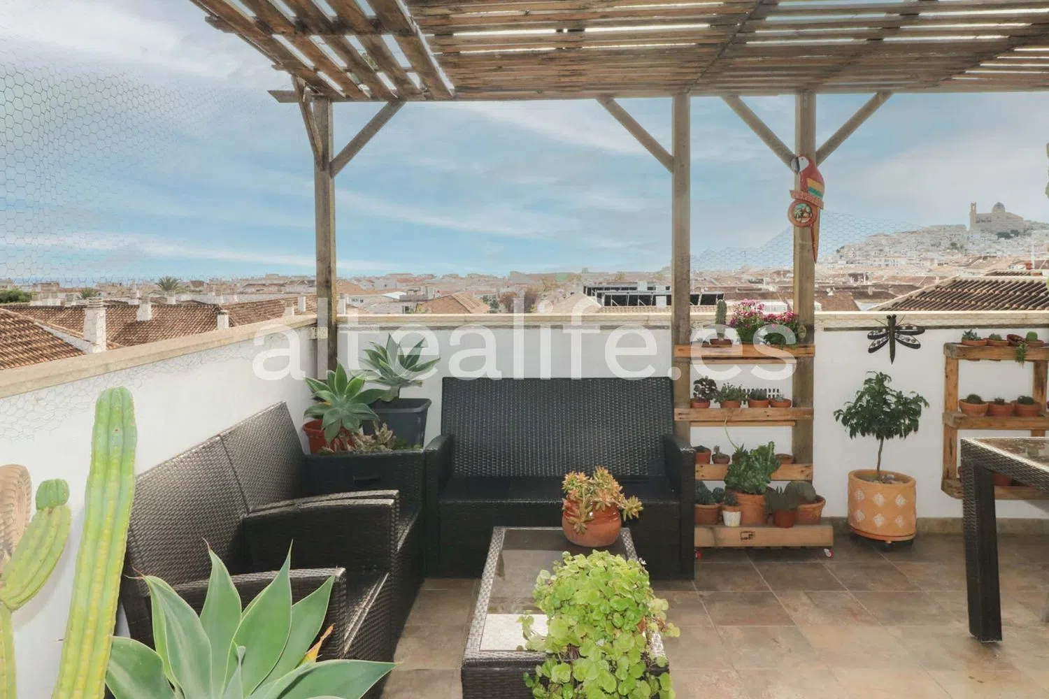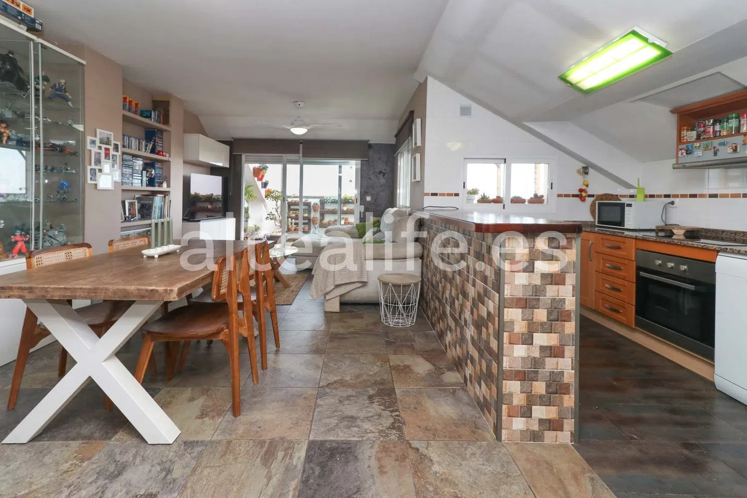 El área principal de la vivienda es un concepto abierto que combina una cocina con península y un amplio salón comedor. Grandes ventanales permiten el acceso a una espaciosa terraza, ideal para disfrutar de agradables momentos al aire libre. En esta terraza, podrás encontrar un comedor de verano, un rincón de relax y espacio adicional para personalizar a tu gusto, todo ello con orientación sureste, ofreciendo impresionantes vistas al mar y al pintoresco casco antiguo.