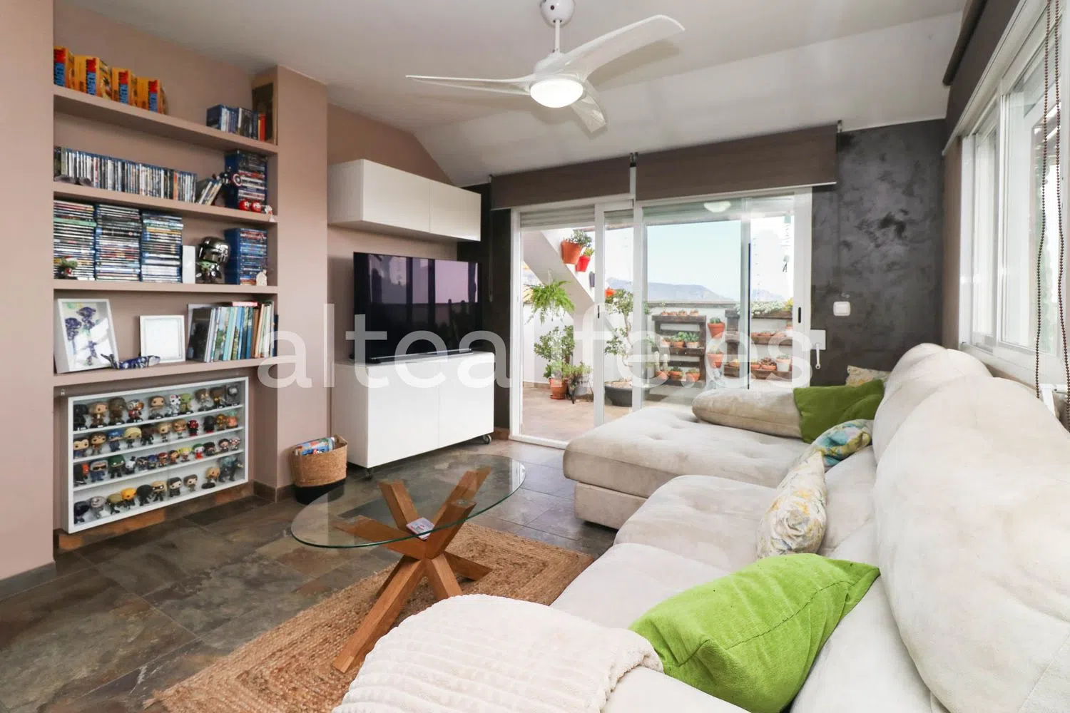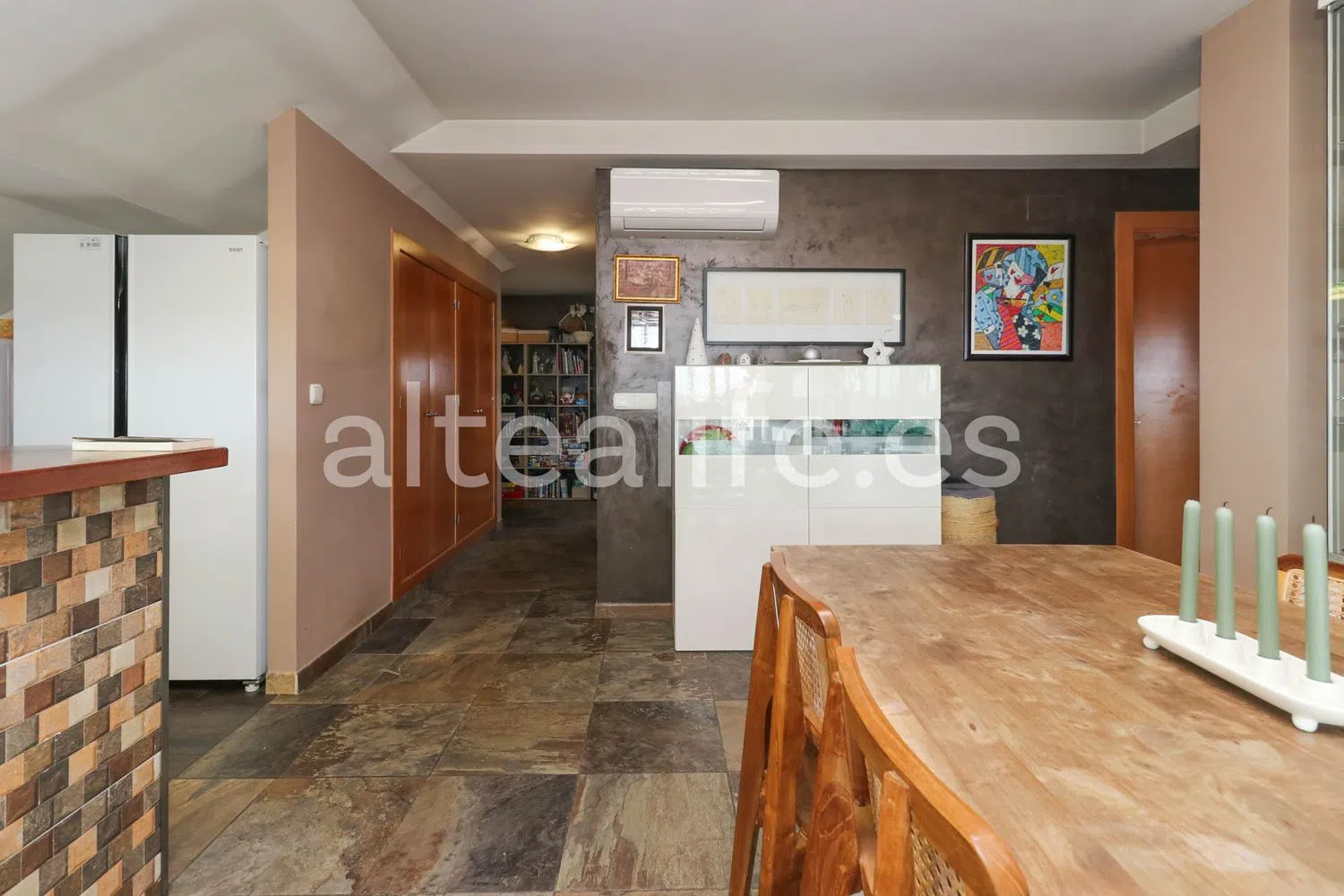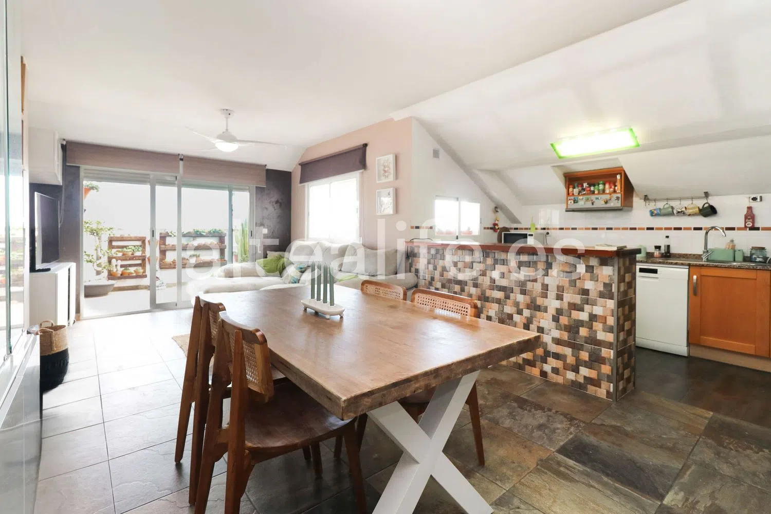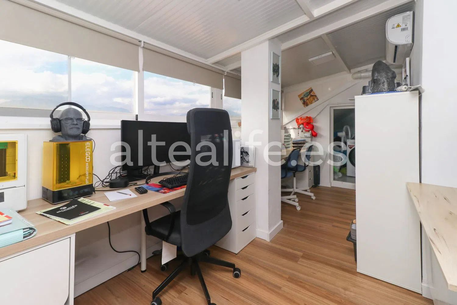 El área principal de la vivienda es un concepto abierto que combina una cocina con península y un amplio salón comedor. Grandes ventanales permiten el acceso a una espaciosa terraza, ideal para disfrutar de agradables momentos al aire libre. En esta terraza, podrás encontrar un comedor de verano, un rincón de relax y espacio adicional para personalizar a tu gusto, todo ello con orientación sureste, ofreciendo impresionantes vistas al mar y al pintoresco casco antiguo.